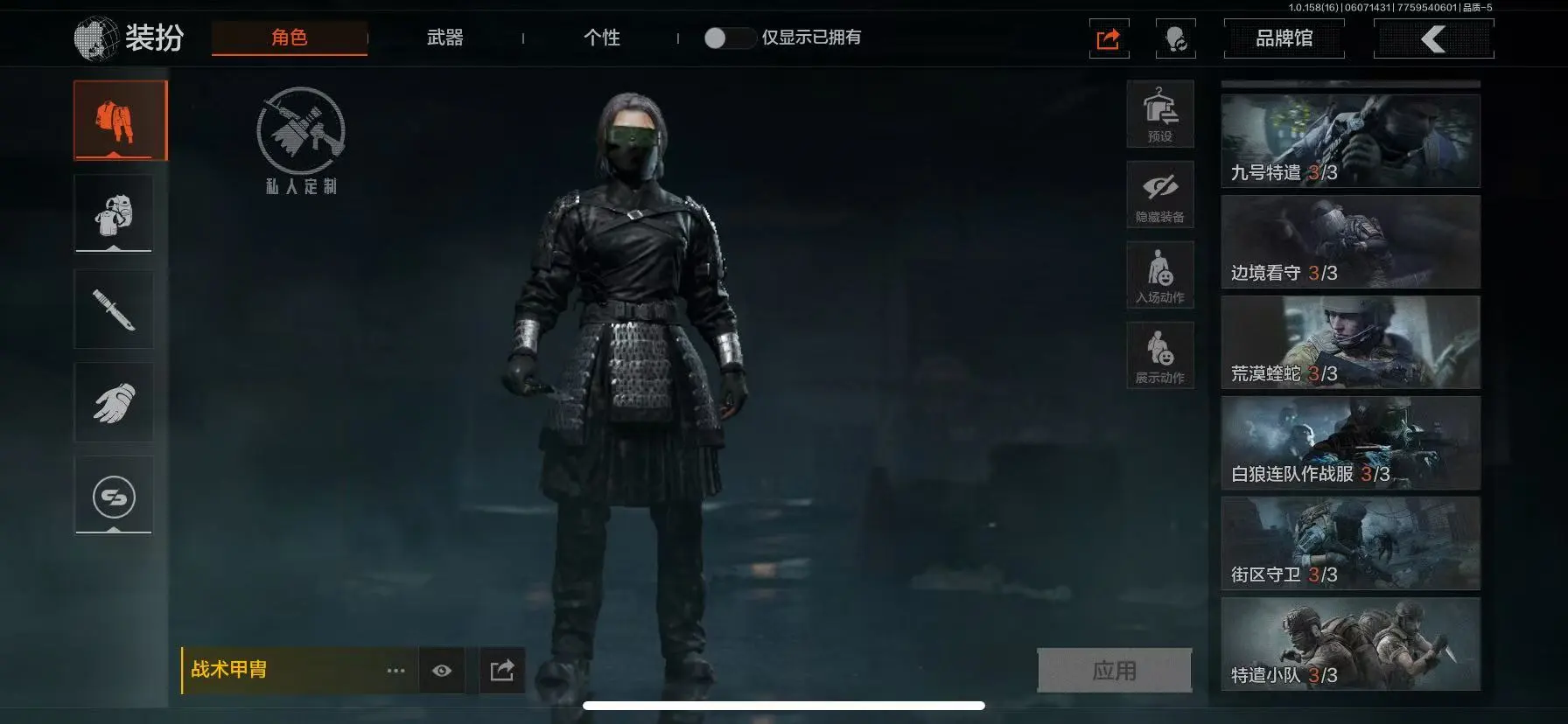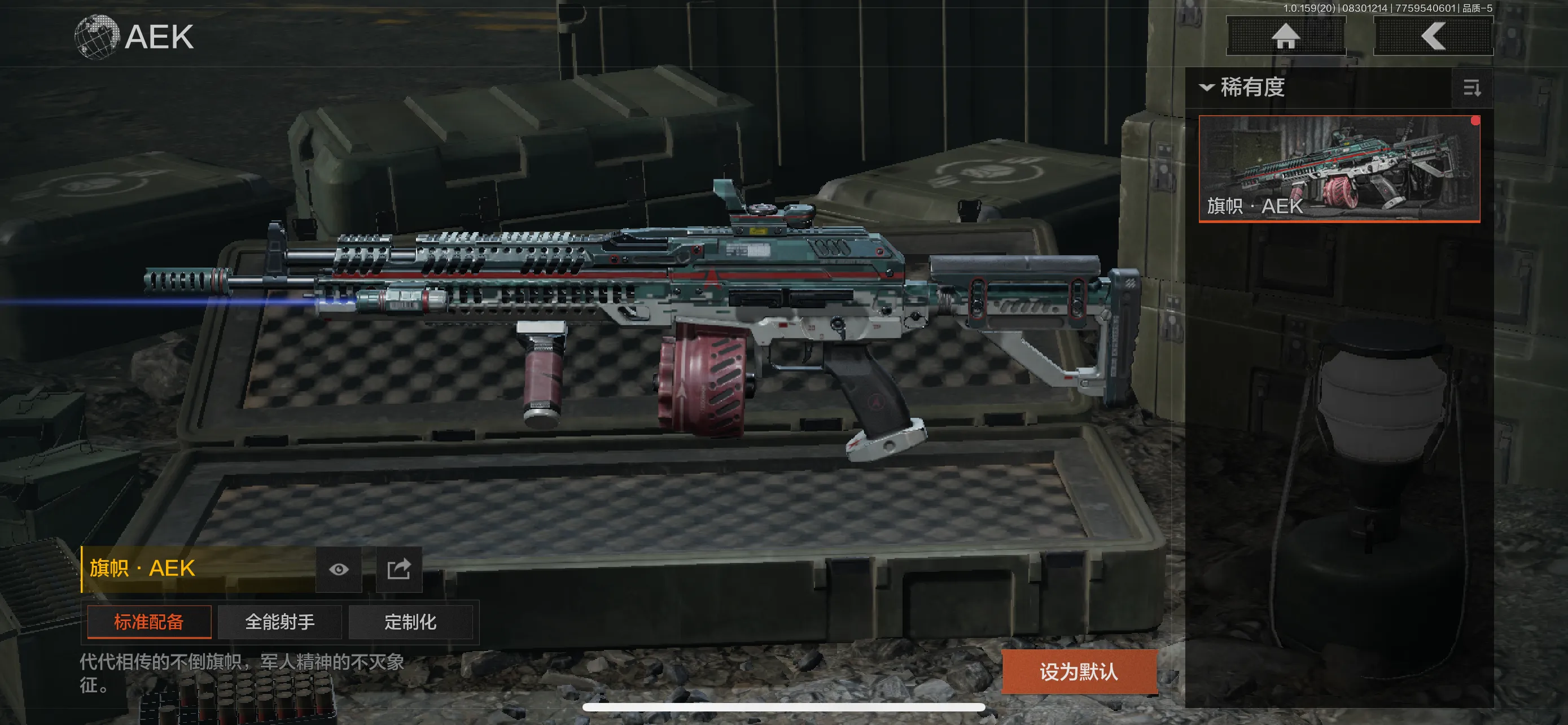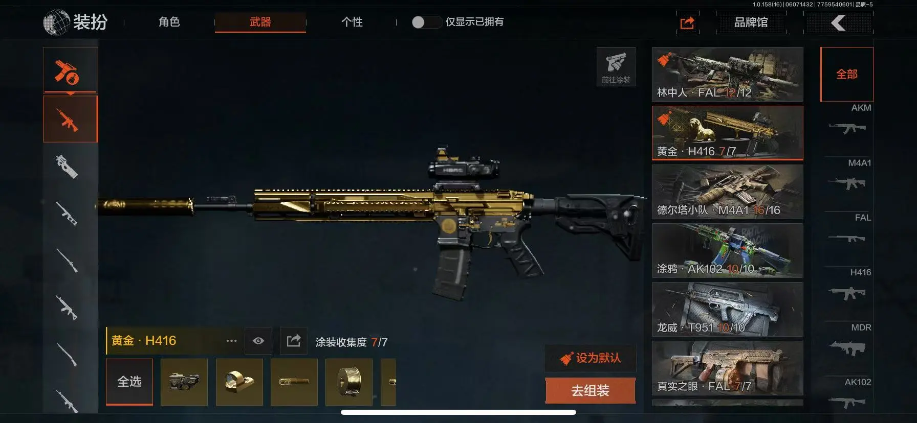 30级,历史最高段位:暗区传说【近战武器】:涂鸦利刃,突击匕首,工兵铲【角色皮肤】:战士甲胄,林中人特遣作战服,森林守望特种服,苏梅克制式服,林地作战服,黑金作战服,九号特遣,边境看守,荒漠蝰蛇,白狼连队作战服,街区守卫,特遣小队;【突击步枪】:火力倾泻AKM,黑金国际M4A1,德尔塔小队M4A1,林中人FAL,真实之眼FAL,秋宴FAL,黄金H416,涂鸦AK102,龙影AKS74U,白狼连队AKS74U,炎夏浪花AR57,棱光裂变ACE31,龙威T951,森林迷彩T951,深水浴池T03,沙漠数码T03,森林迷彩T03,火绒AK12;【冲锋枪】:火力倾泻MP5,涂鸦MPX,苏梅克UMP45,多边棱彩MAC10,神锋Vector45,多边棱彩Vector45,沙色Vector45,竞技Vector9,都市黄Vector9,龙影Suomi;【射手步枪】:白狼连队VSS,黑金国际M110,绿松石数码QBU1914;【栓动步枪】:沙漠作战AX50,历战AR30;【轻机枪】:多边棱彩M249;【霰弹枪】:多边棱彩M870,真实之眼SPR310,火漆DP12;【卡宾枪】:多边棱彩M96,敬伙伴M16;【手枪】:碳黑M9A3,7,涂鸦G18C,过江龙G18C,碳黑M300;