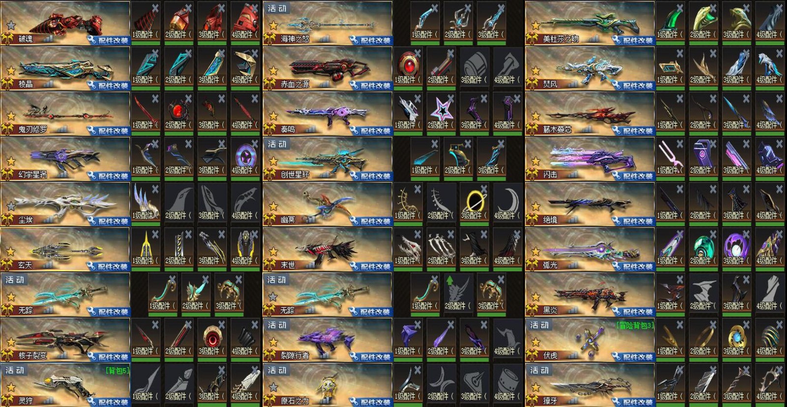 配件✨破魂丨乾坤丨海神之怒丨美杜莎之吻丨棱晶丨赤血之源丨焚风丨鬼刃修罗丨奏鸣丨藤木蔓芯丨幻宇星涡丨创世星环丨闪击丨尘埃丨幽冥丨绝境丨玄天 x2丨末世丨弧光丨无踪 x2丨黑炎丨连城 x3丨跳跳锤丨核子裂变丨迷你派拉丨裂隙行者丨伏虎丨灵狩丨原石之力丨獠牙 x2丨