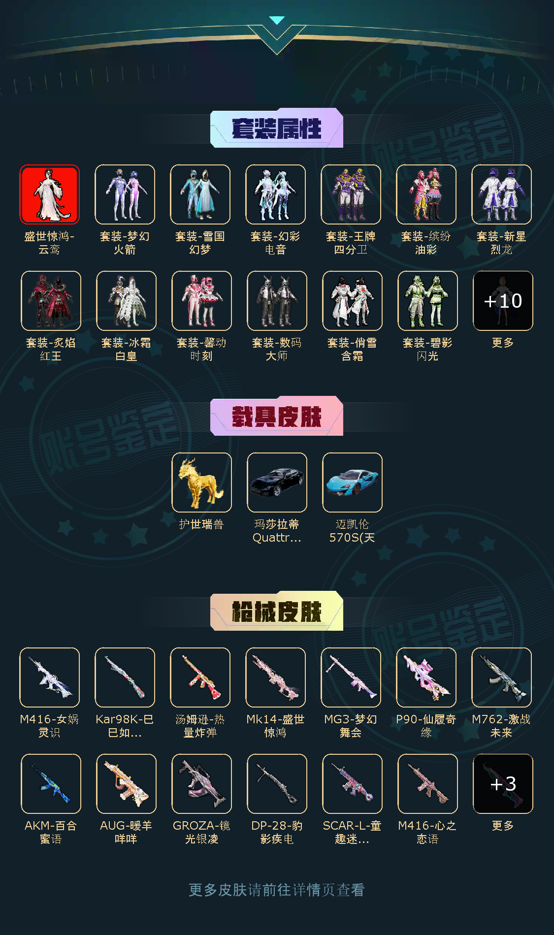 【稀有资产】盛世惊鸿-云鸾[2级]/套装-雪国幻梦/套装-奇异狩猎者/套装-粉红小猪/套装-浪漫天命/套装-暗影哥特/套装-龟仙人/套装-胖达团团/套装-浪漫波比/套装-晶辉守护/角色-都市丽猫/套装-狂沙舞者/M416-仓鼠灰灰