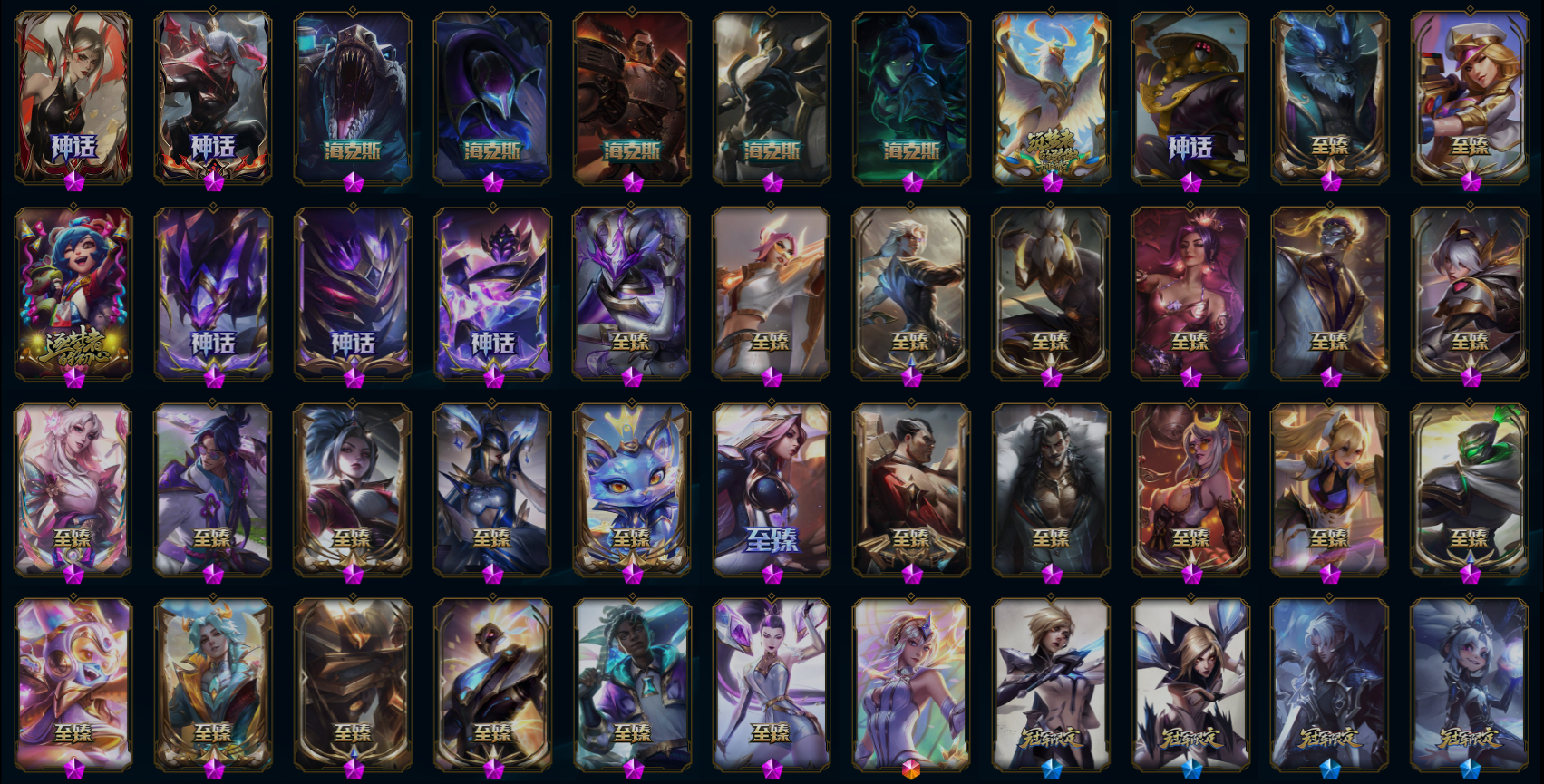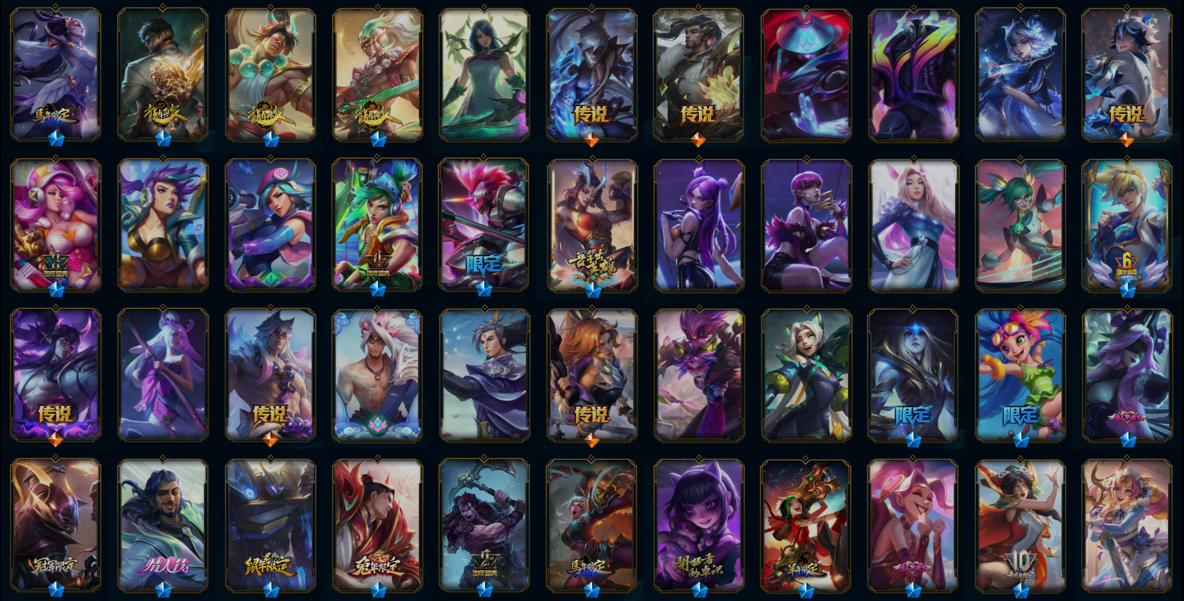 【传说皮肤】女皇艾希 魔女伊芙琳 驯龙炮手崔丝塔娜 战斗学院伊泽瑞尔 电玩女神娑娜 灵魂莲华瑟提 神龙尊者昼日真龙亚索 神龙尊者夜月幻龙亚索 暗星女王拉克丝 幻灵战斗队长厄运小姐 鬼魂新娘莫甘娜 偶像歌手阿狸 冰霜亚龙希瓦娜 黎明使者索拉卡 西部魔影大小姐蕾欧娜 西部魔影卢锡安 驯龙学者黑默丁格 西部天使赛娜 青花瓷伊泽瑞尔 太空律动猫猫布里和里茨 太空律动律动队长提莫 西部天使艾希 陆地王者4WD布里茨 战地巨兽科加斯 源计划毁灭派克 黎明使者锐雯 炼狱魔犬内瑟斯 地狱之门卫士加里奥 黑夜使者索拉卡 屠龙勇士潘森 丧尸布兰德 至尊魔女莫甘娜 双重冰晶艾尼维亚 真实伤害艾克 死亡骑士盖伦 烈焰雄心崔丝塔娜 神龙尊者圣龙李青 星之守护者金克丝 泳池派对吉格斯 奥德赛凯隐 天煞劫 霸天异形卡兹克 红色男爵库奇 恶魔男爵瑞兹 灵魂莲华锤石 星之守护者洛 地狱行者孙悟空 战地机甲厄加特 女主播迦娜 第三类接触黑默丁格 黑夜使者亚索 神王盖伦 合金巨兽努努和威朗普 蔷薇绅士杰斯 上古战魂魔腾 黯黑魔龙希瓦娜 金牌主播德莱文 最终BOSS维迦 冰霜之刃艾瑞莉娅 欧米伽小队幽灵特工 源计划净化薇恩 源计划联合艾希 暗星锤石 苹果机器人布里茨 腥红之月鬼武姬阿卡丽 战场女武神凯尔 符文战熊沃利贝尔 源计划林易 女校长菲奥娜 钢铁之翼凯尔 银河魔装机神兰博 神拳李青 宇航员诺提勒斯 星之守护者拉克丝 焰尾妖狐阿狸 约德尔国队长提莫 灌篮高手德莱厄斯 绅士科加斯 冰川巨兽墨菲特 律政大亨蒙多 铁哥们儿奥拉夫 钢铁军团盖伦 大天使长米迦勒凯尔 提莫约德尔人的一大步