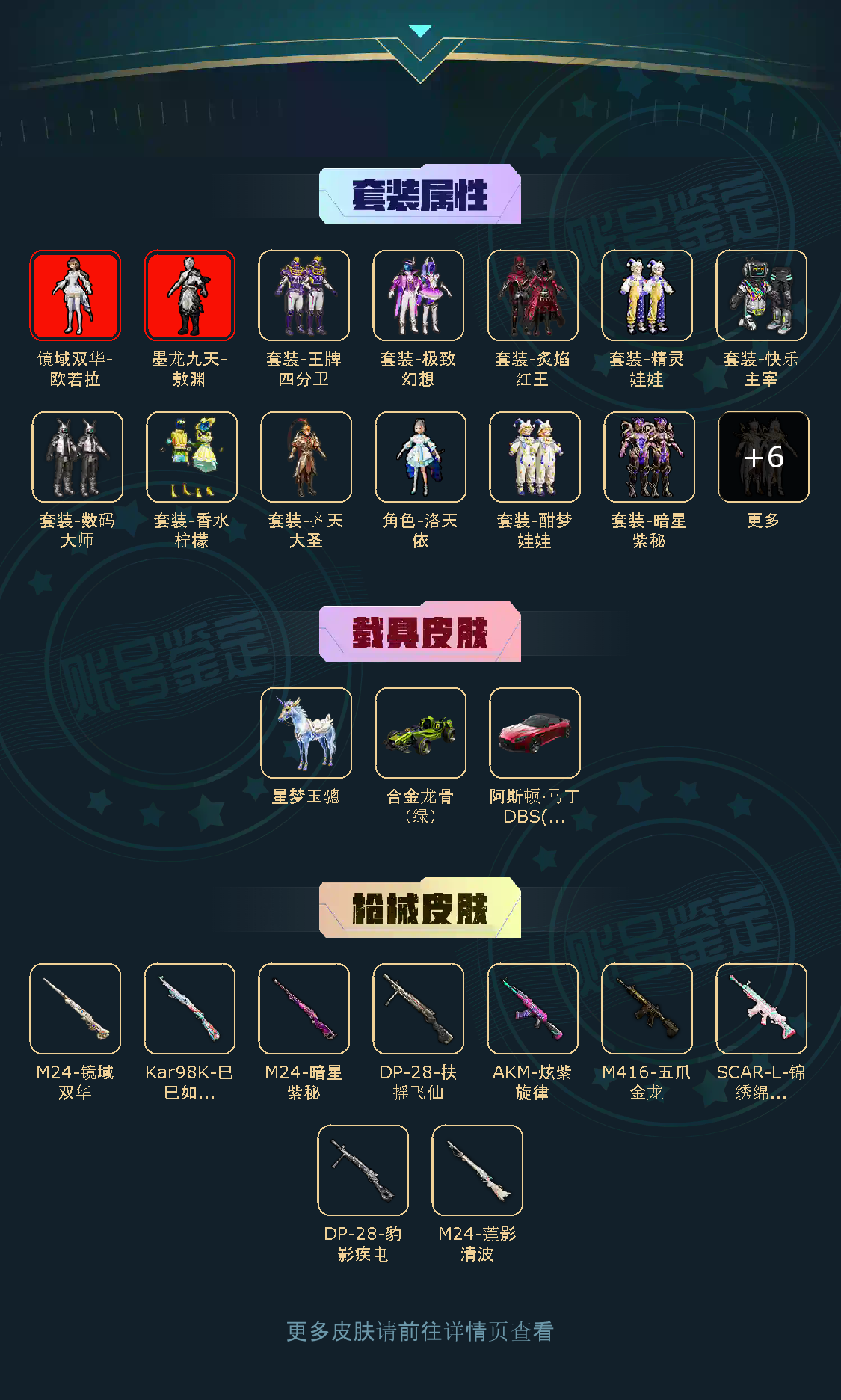 【稀有资产】墨龙九天-敖渊[2级]/镜域双华-欧若拉[3级]/角色-真理款战斗服/套装-奇异狩猎者/套装-萌熊伴侣/套装-浪漫天命/套装-潮萌小黄鸭/套装-雪山精英/套装-龟仙人/套装-迅捷狂鲨/套装-浪漫波比/角色-粉雾星云/套装-暗夜武装/套装-东方飞龙/M416-仓鼠灰灰