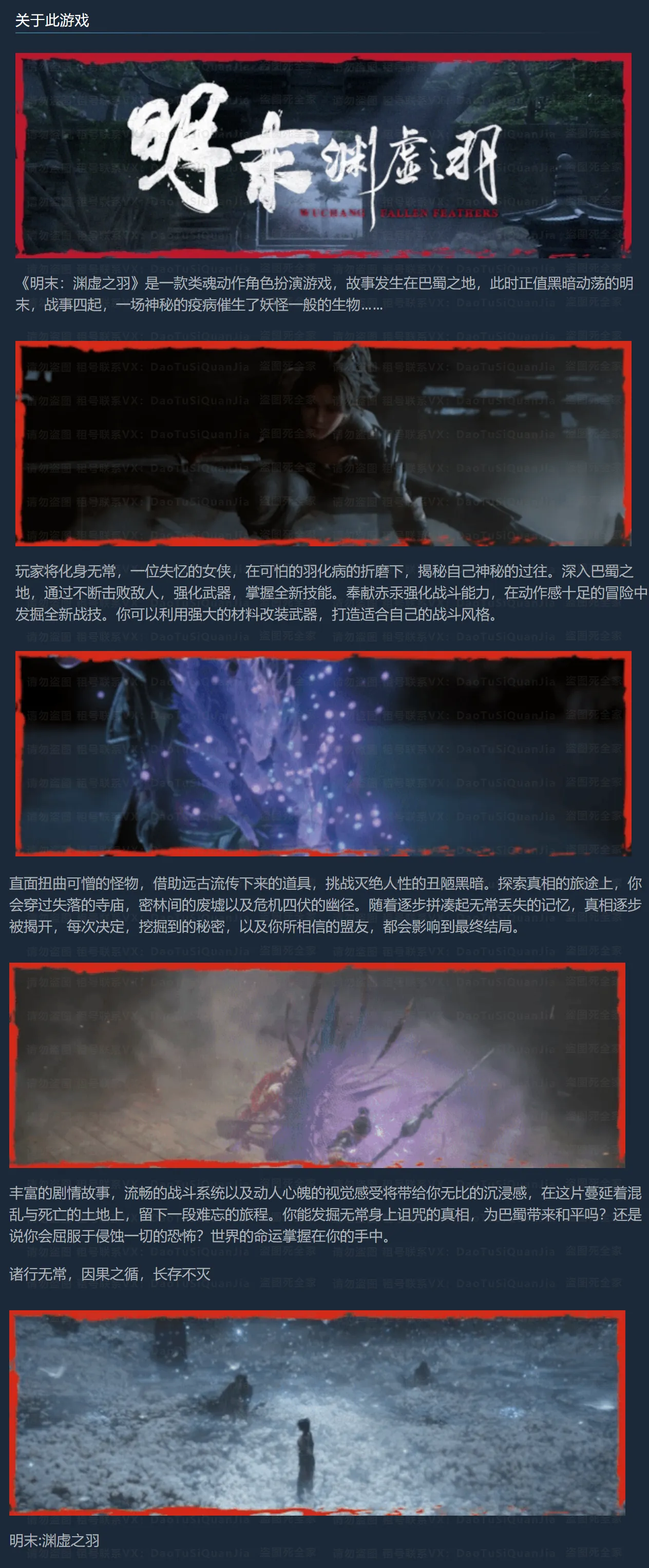 明末:渊虚之羽是一款类魂动作角色扮演游戏,故事发生在巴蜀之地,此时正值黑暗动荡的明末,战事四起,一场神秘的疫病催生了妖怪一般的生物……