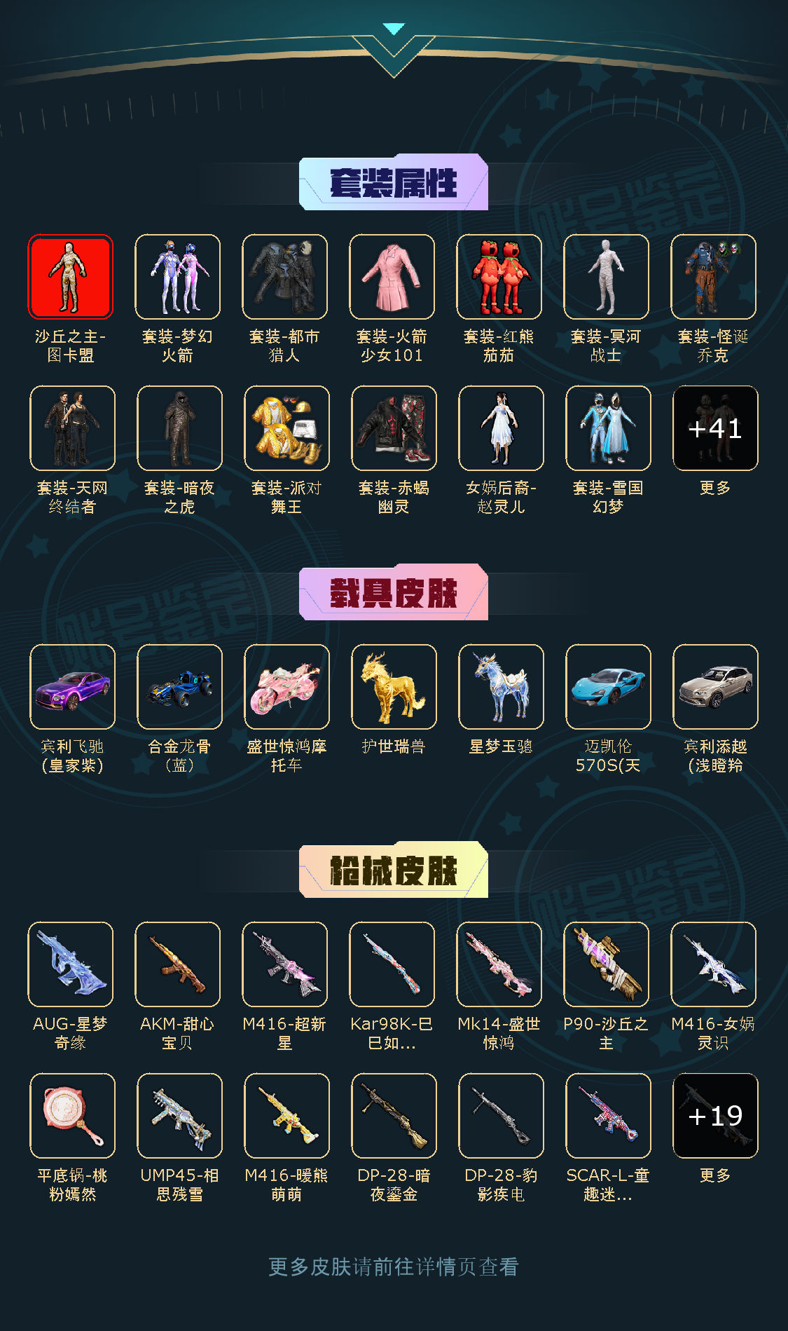 46粉,7载具,259套装,0王牌印记,历史最高段,0热力值 平底锅-林间仙鹿/平底锅-桃粉嫣然/AKM-甜心宝贝/SCAR-L-童趣迷兔/AUG-星梦奇缘/M416-全功率超战/M416-暖熊萌萌/M416-心之恋语/GROZA-超新星/M416-五爪金龙/M416-女娲灵识/SCAR-L-青春物语/M762-甜蜜誓约/AUG-超新星/M416-超新星/Mk14-盛世惊鸿/DP-28-暗夜鎏金/MG3-洛神天依/P90-能量风暴/AKS-74U-信仰神谕/P90-粉樱探戈/Vector-环太平洋/UMP45-相思残雪/UMP45-恐龙拽拽/P90-沙丘之主/汤姆逊-冰川粉黛/UMP45-启明星/烟雾弹-猫咪绅士/破片手榴弹-粉粉猫爪/Kar98K-巳巳如意/Kar98K-未来歌姬/宾利飞驰(皇家紫)/宾利添越(浅瞪羚棕)/合金龙骨(蓝)/迈凯伦570S(天际蓝)/护世瑞兽/星梦玉骢/盛世惊鸿摩托车/