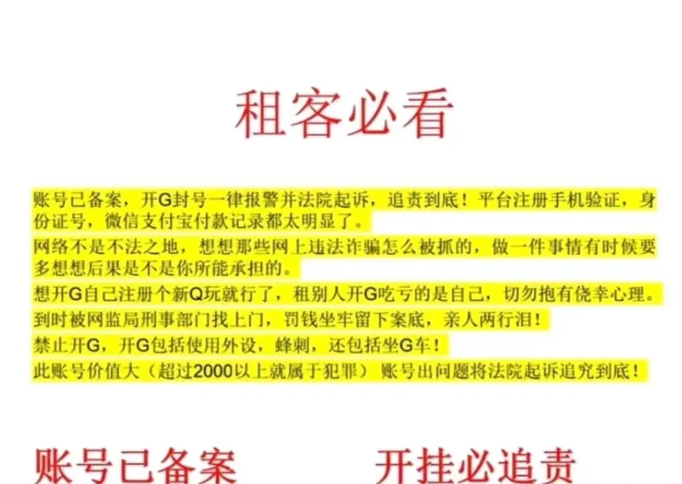 账号冻结请点解除冻结-秒解,再重新上号即可(会有时间补偿)如果依旧未解就是号主在忙,请退款! 此账号已在北京市公安局申请虚拟财产!! 开挂,V5V6,游戏加加等异常行为导致账号封禁的,将会报警提取租客ip!就算订单结束也能看到你的登录设备IP!!!按照充值流水进行顶额追偿!并让开挂租客留下一辈子的案底!!!