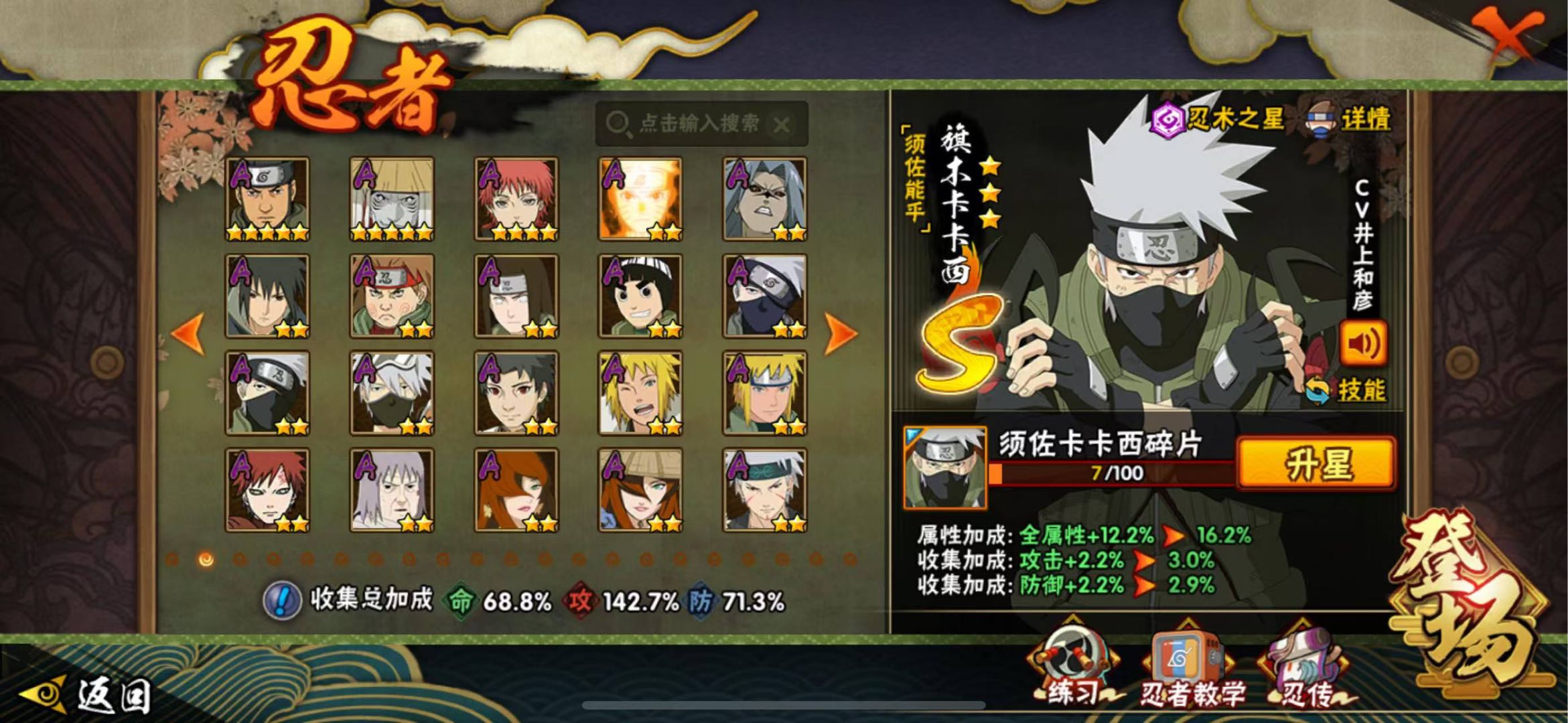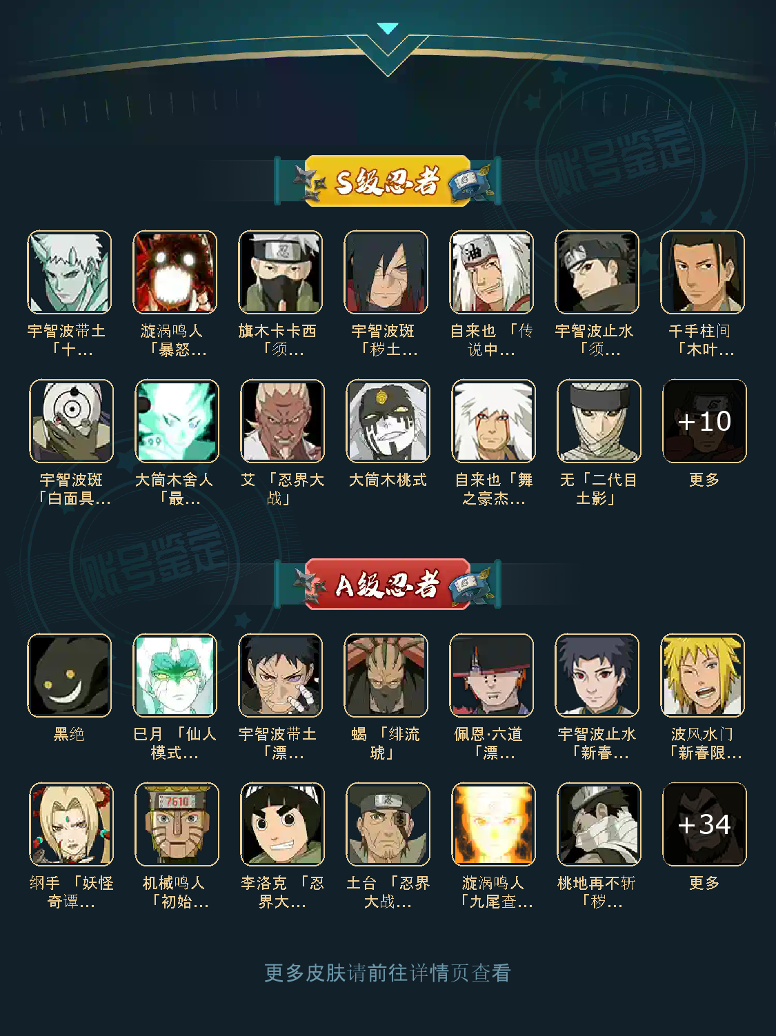 仙人自来也 纲手 波风水门 百战水门 猿飞日斩 千手柱间 宇智波斑 宇智波鼬 舞之自来也 大蛇丸 百战大蛇 秽土四代 秽土三代 秽土长门 仙人兜 黄猿九喇嘛鸣人 紫狗永恒佐助 樱婊忍战樱 秽土鼬 普通自来也 百豪纲手 死门凯 二代扉间 秽土二代 秽土初代 秽土柱间 白面具 须佐卡卡西 小胡子鬼灯幻月 雷影 土影 无 佩恩 百战佩恩 青年柱间 创立初代 秽土斑 青年斑 解斑 须佐止水 虎皮 破面带土 红夜带土 罗砂 秽土三代风影 忍战雷影 三代雷影 金角银角 秽土半藏 忍战大野木 小土豆 天道超 大筒木桃式 大筒木金式 钢铁之躯凯 桀骜之刃阿斯玛 狂野之鲨鬼鲛 飞段 黑飞段 百豪樱 忍战李 大卡卡西 五代水影照美冥 宇智波鼬 仙鸣 九尾查克拉鸣人 鹰佐 奇拉比 青年艾 半蛇兜 晓蛇 新春鼬 面麻 须佐佐助 疾风咒印佐助 忍战宁次 忍战天天 最终章雏田 幻容卡卡西 神卡 忍战卡卡西 泳装卡卡西 忍战凯 青春哥 惊门凯 爱情哥 新春止水 新春水门 青年水门 青水 新春我爱罗 泳装照美冥 侠隐照美冥 侠隐纲手 侠隐兜 漂泊再不斩 漂泊佩恩 漂泊二代 漂泊小南 漂泊佩恩 三船 青年三船 青年长门 泳装南 新春南 新春大蛇丸 晓创生角度 晓创生蝎 晓创生飞段 泳装鼬 鲛肌融合鬼鲛 新春迪达拉 秽土迪达拉 恶灵之影飞段 暴怒带土 忍战黄土 卑留呼 桃博 黑土