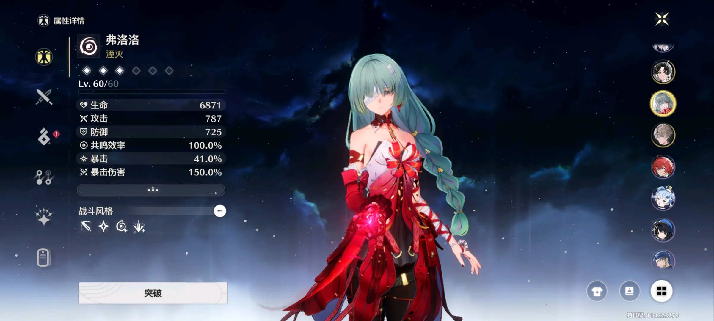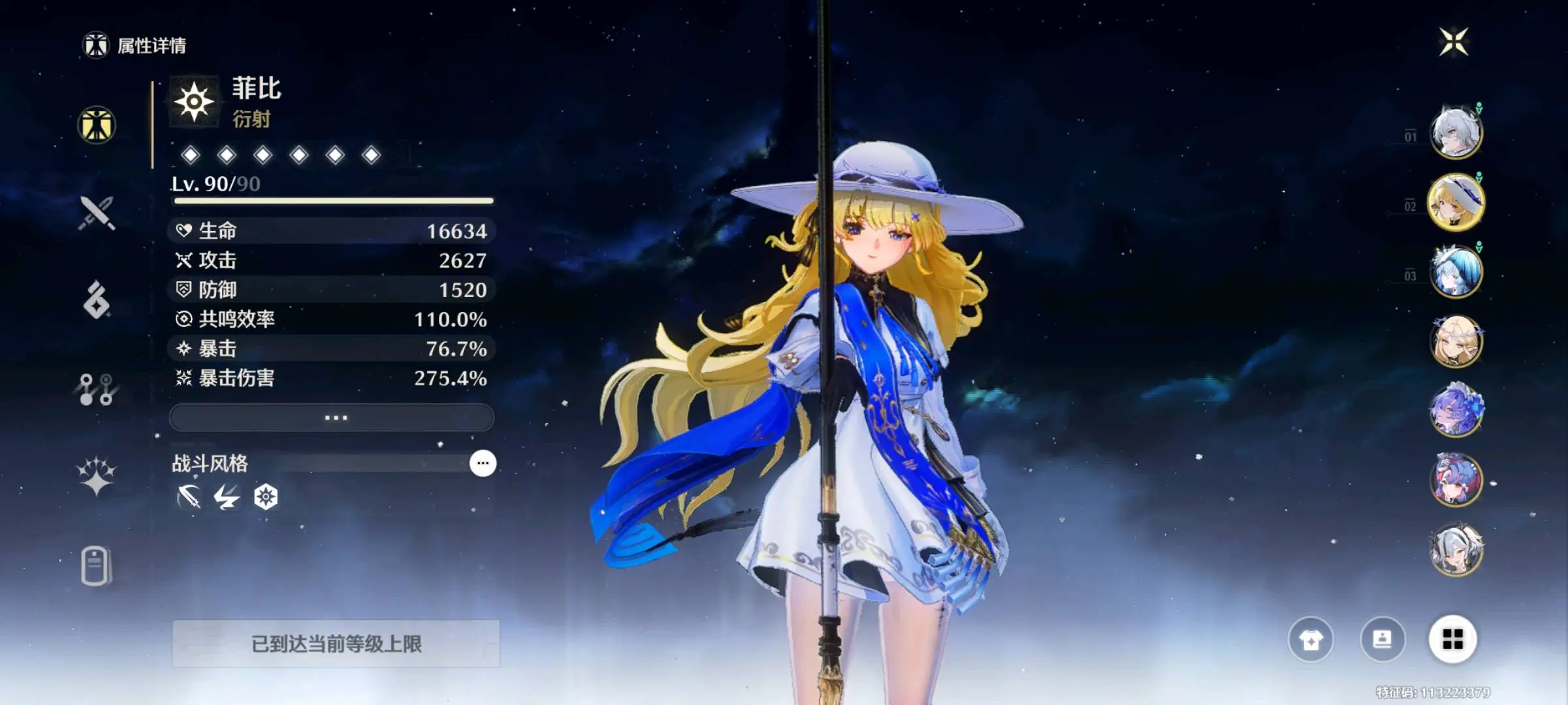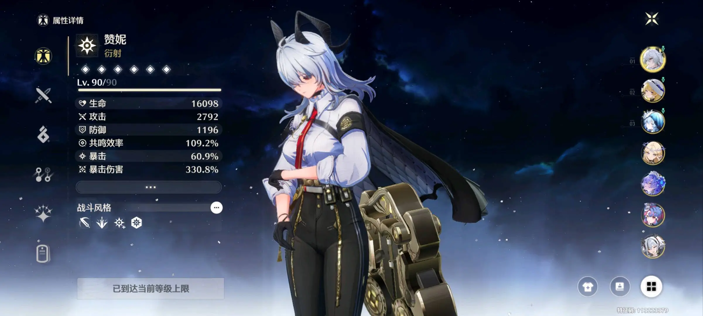 80级,43黄,17个五星角色:3命赞妮, 3命维里奈, 3命鉴心, 2命椿, 1命今汐, 1命凌阳, 长离, 守岸人, 卡提希娅, 坎特蕾拉, 菲比, 洛可可, 吟霖, 安可, 弗洛洛, 相里要, 卡卡罗;11个四星角色:满命散华, 满命丹瑾, 满命釉瑚, 满命秧秧, 满命渊武, 满命桃祈, 满命白芷, 满命炽霞, 满命莫特斐, 满命灯灯, 满命秋水;11个五星武器:精3千古洑流, 精1和光回唱, 精1星序协响, 精1掣傀之手, 精1焰光裁定, 精1不屈命定之冠, 精1裁春, 精1赫奕流明, 精1时和岁稔, 精1漪澜浮录, 精1停驻之烟;服饰:叱妖诰,星声:53,月相:0,余波珊瑚:0,浮金波纹:2,铸潮波纹