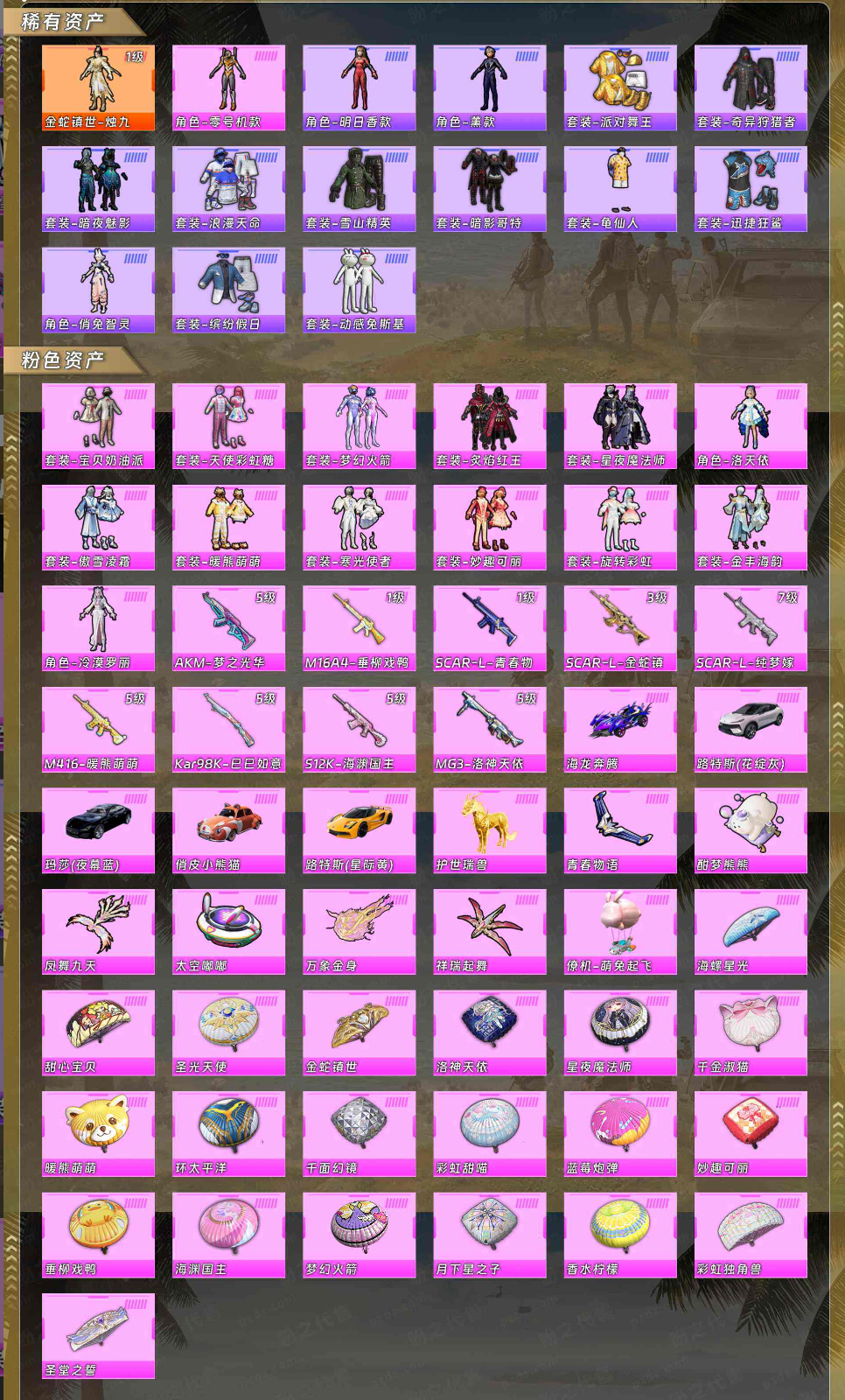【粉色枪皮】AKM-梦之光华/M16A4-垂柳戏鸭/SCAR-L-青春物语/SCAR-L-金蛇镇世/SCAR-L-纯梦嫁纱/M416-暖熊萌萌/Kar98K-巳巳如意/S12K-海渊国主/MG3-洛神天依