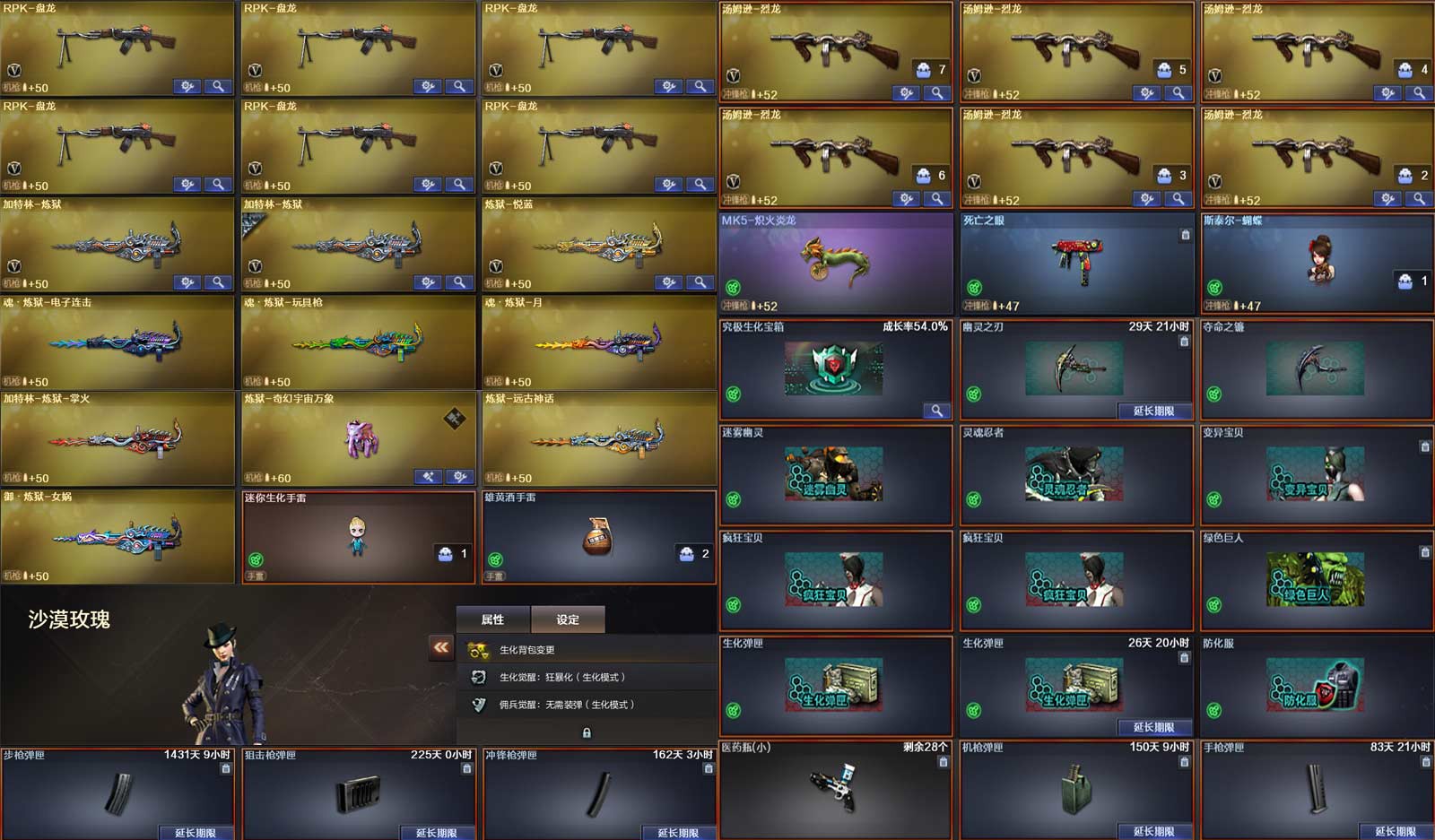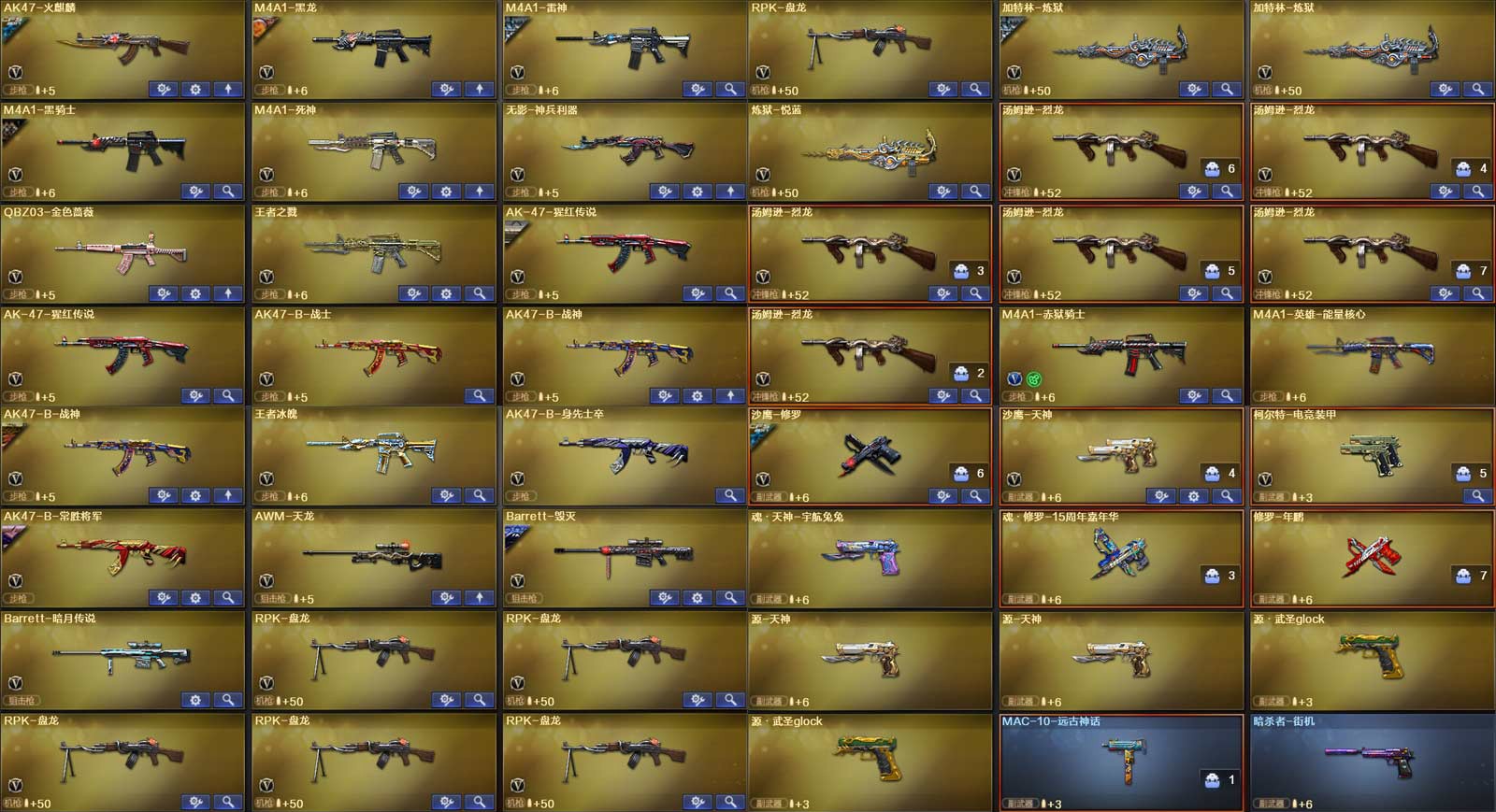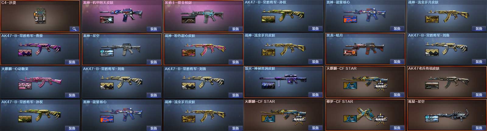 多四防角色,各种皮肤武器光效玩偶道具,欢迎来体验!武器太多,截不了那么多图!【此号全部装备太多截不了太多图,还有很多神器未截图,普通CF点武器也是一百多个就不截图了(满背包满道具爆破、生化、挑战武器应有尽有多个玩偶主流武器多光效),主流枪械都有皮肤】