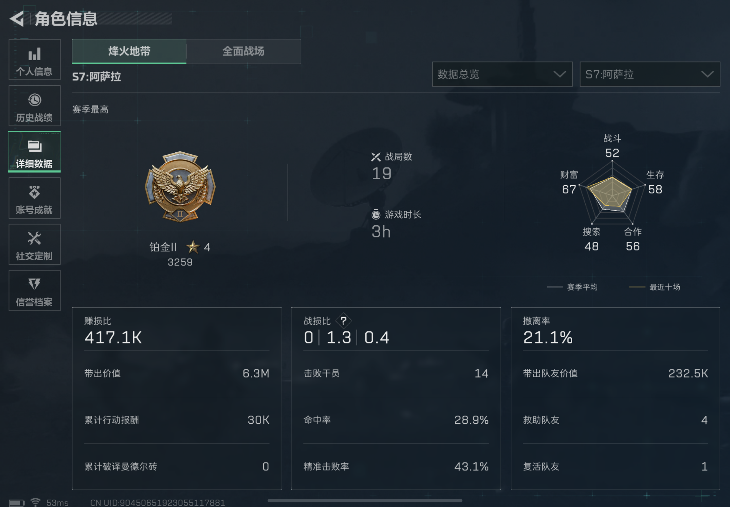- 烽火地带段位: 铂金
