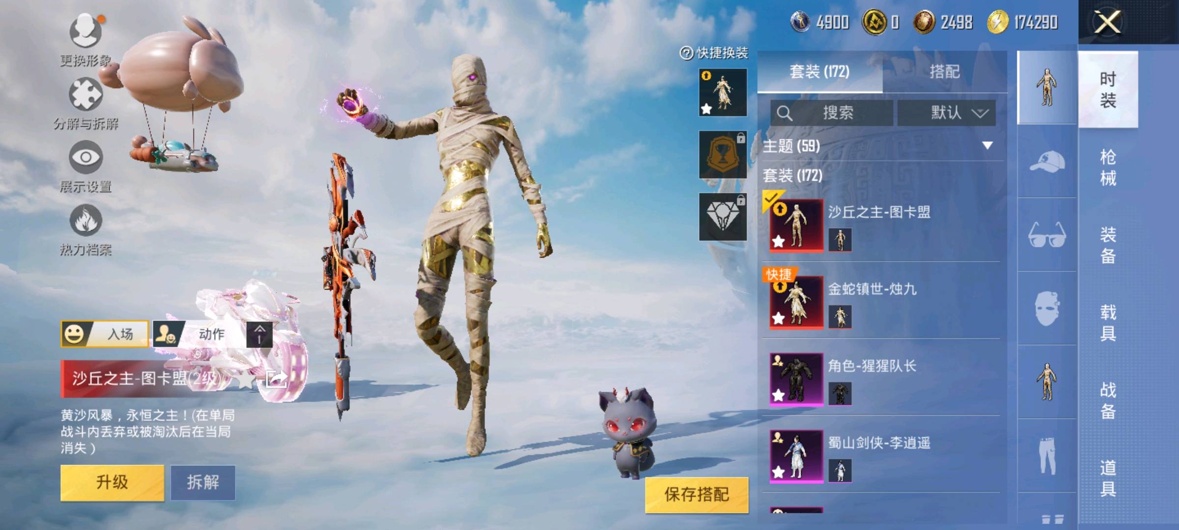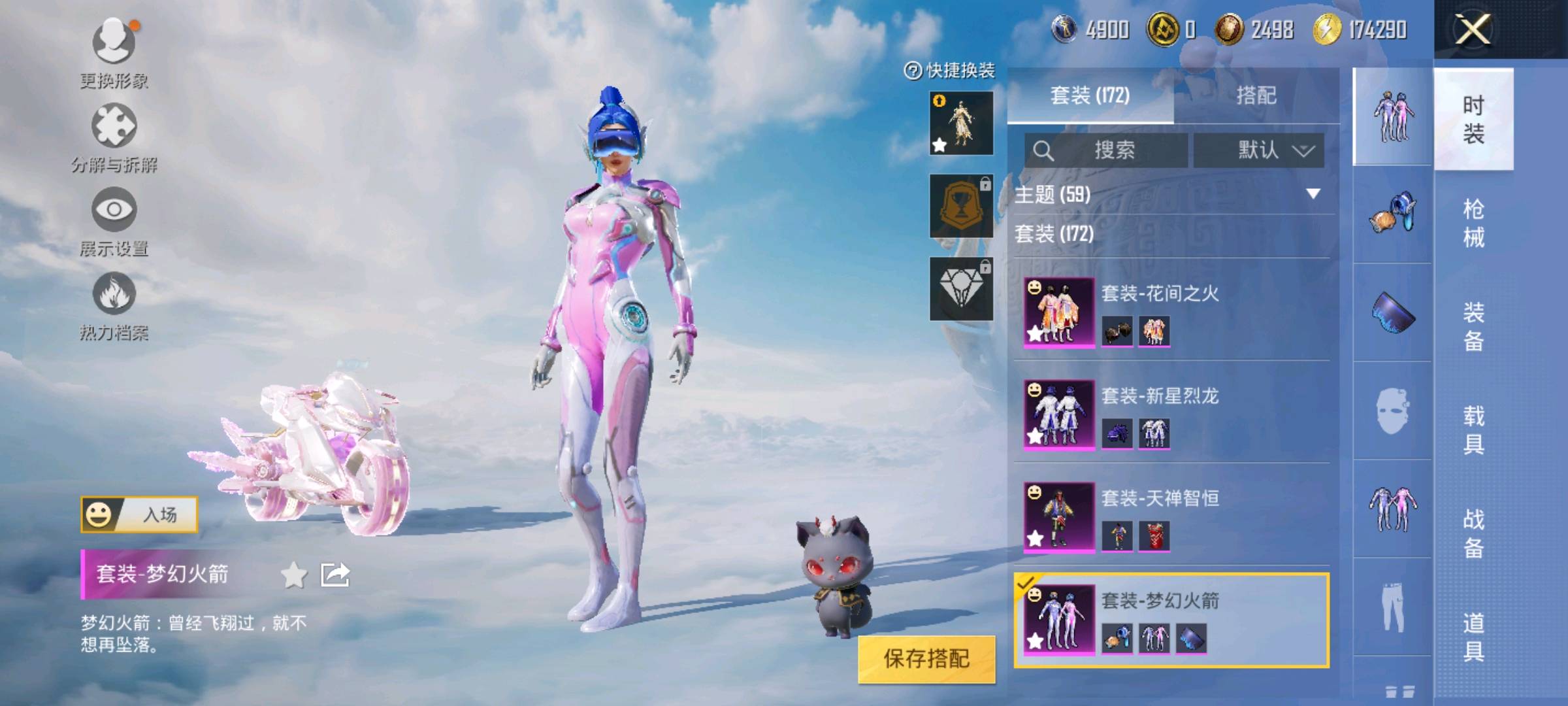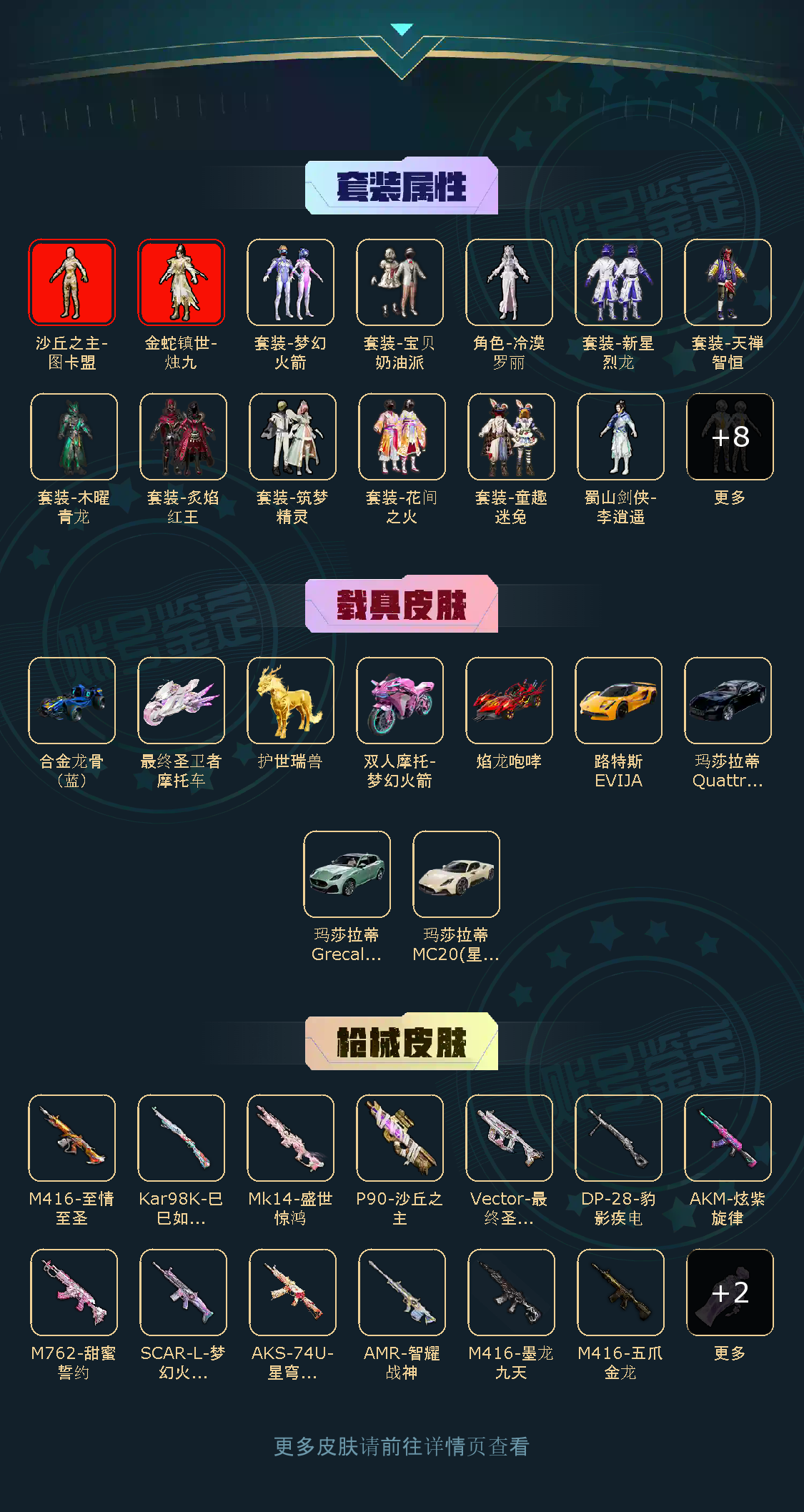 21粉,9载具,172套装,13王牌印记,传奇王牌13星历史最高段,94221热力值 SCAR-L-梦幻火箭/M416-五爪金龙/AKM-炫紫旋律/M416-墨龙九天/M416-至情至圣/M762-甜蜜誓约/Mk14-盛世惊鸿/AKS-74U-星穹咏叹调/Vector-最终圣卫者/P90-沙丘之主/烟雾弹-丁香清露/破片手榴弹-热量炸弹/Kar98K-巳巳如意/AMR-智耀战神/玛莎拉蒂Quattroporte夜幕蓝/玛莎拉蒂Grecale(薄荷绿)/焰龙咆哮/合金龙骨(蓝)/路特斯EVIJA(星际黄)/玛莎拉蒂MC20(星石白)/护世瑞兽/双人摩托-梦幻火箭/最终圣卫者摩托车/
