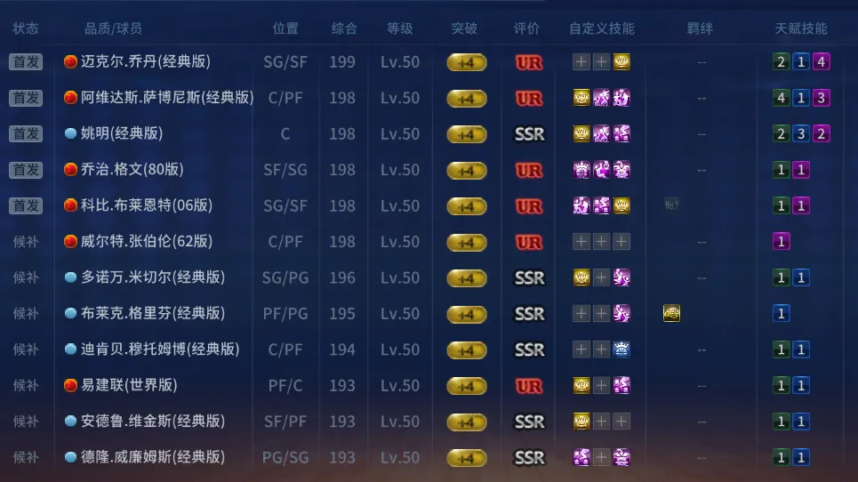 经典姚明、经典乔丹、经典萨博尼斯、UR张伯伦、UR格文、UR科比、UR易建联、SSR维金斯等