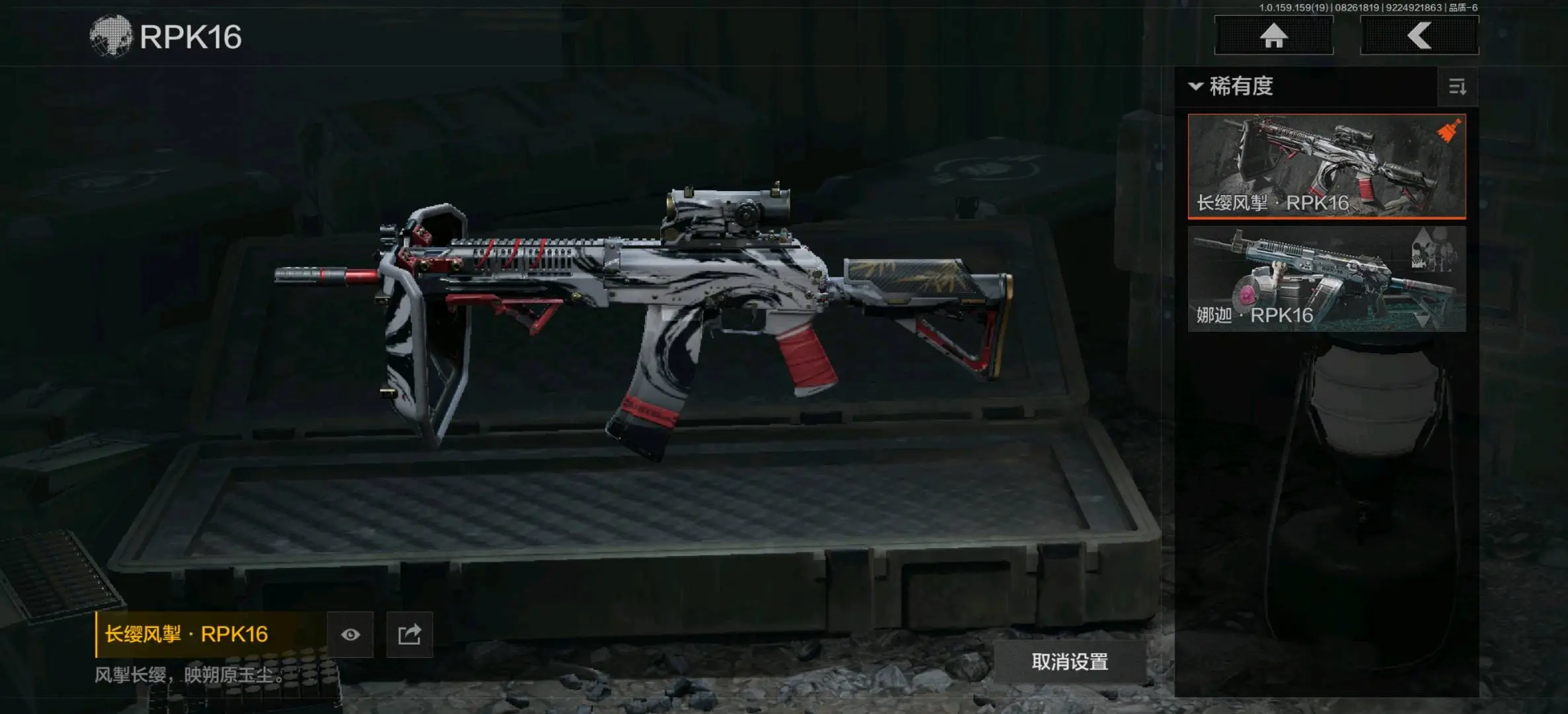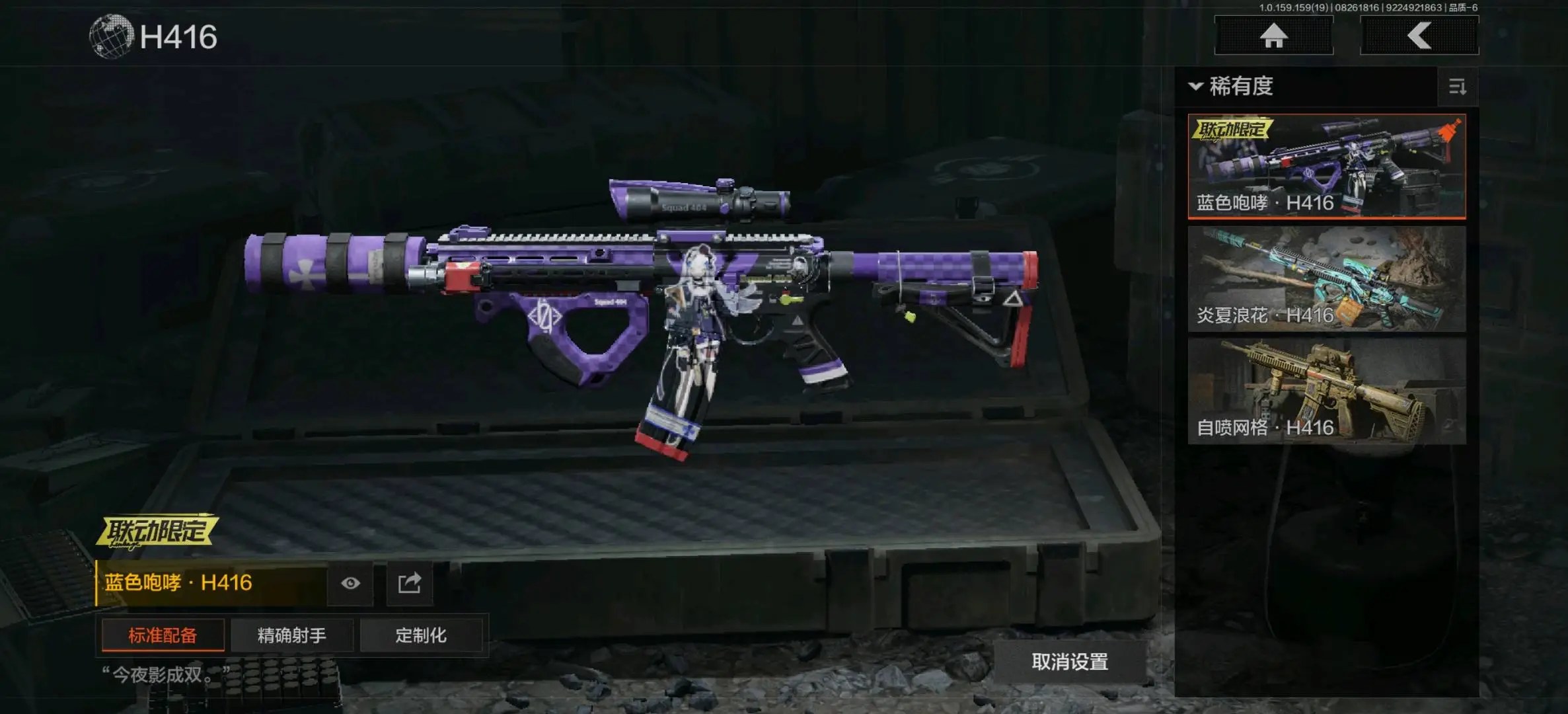竞技FAL,冻原猎手M4A1,蓝色咆哮H416,银月AN94,冬夜AK12,钢铁真理QBZ191,和平之手FAL,棱光裂变AKM,缟兵玄墨AKM,来战AKM,炎夏浪花H416,自喷网格H416,棱光裂变AK102