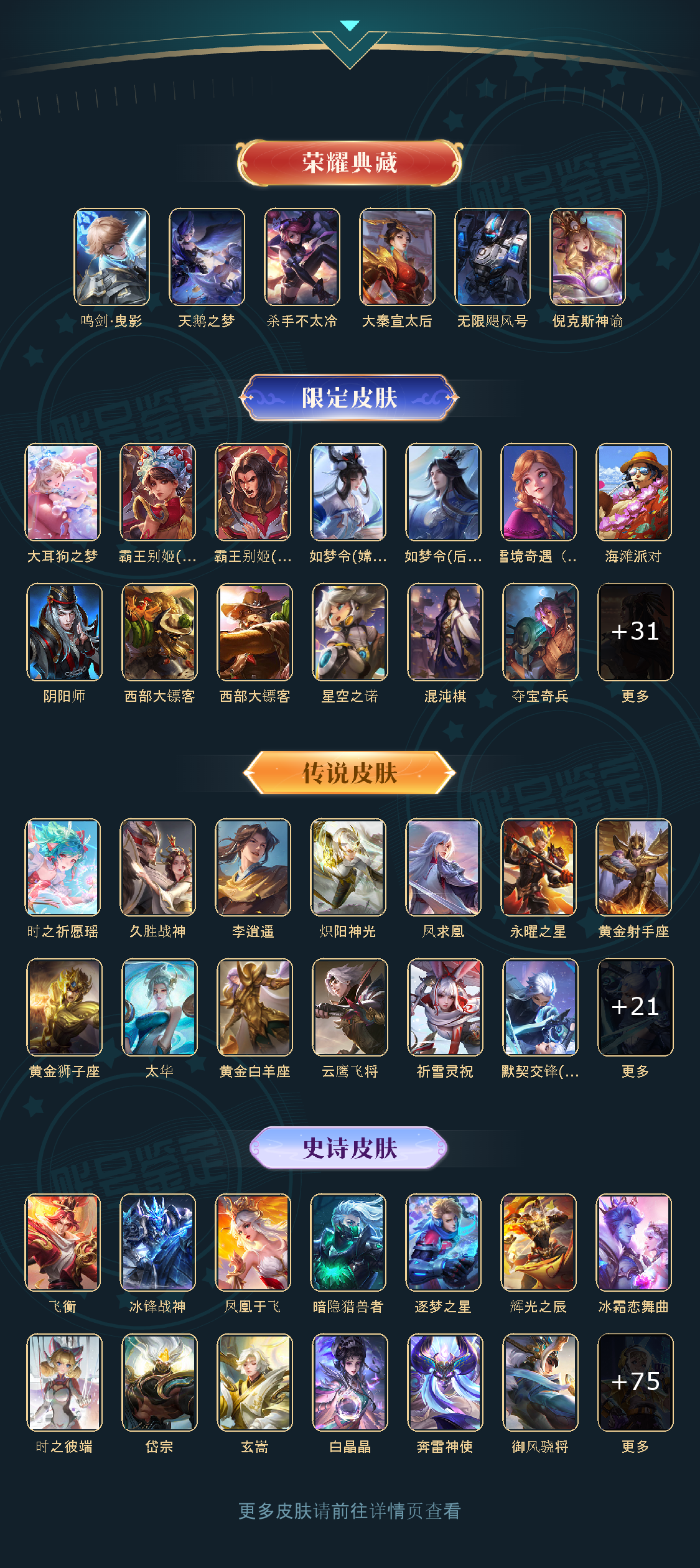 贵族等级V10,英雄数量124,典藏皮肤数7,皮肤数量322,纯白花嫁/天魔缭乱/至尊宝/真爱至上/圣诞老人/热情桑巴/梅西/青龙志/白虎志/朱雀志/久胜战神/飞衡/匿光追影者/鸣剑·曳影/星域神启/李逍遥/武圣/玉兔公主/补天/异界灵契/神威/启示之音/傲雪梅枪/时雨天司