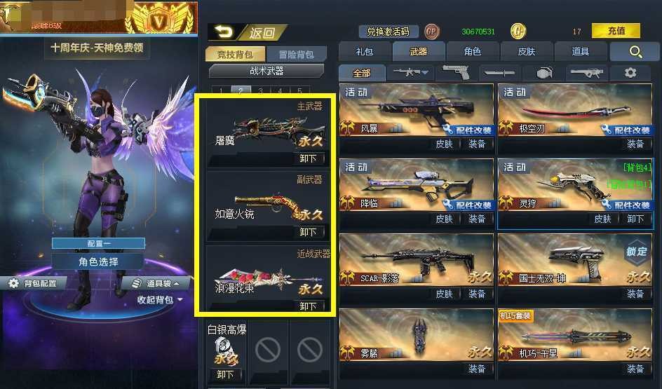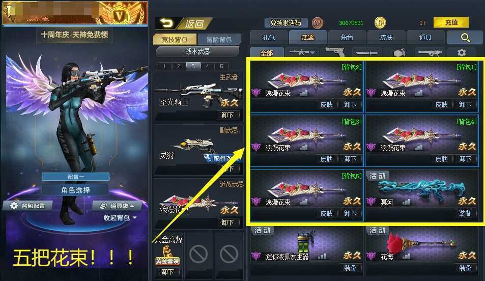 五把浪漫花束!满月隐!RPK天神,无限ex,血魔,火铳,AK天神,连城,黑炎,浪淘沙,焰龙,灵狩,降临,圣光骑士,魔龙骑士,黄金板砖
