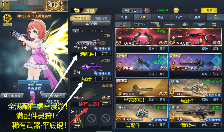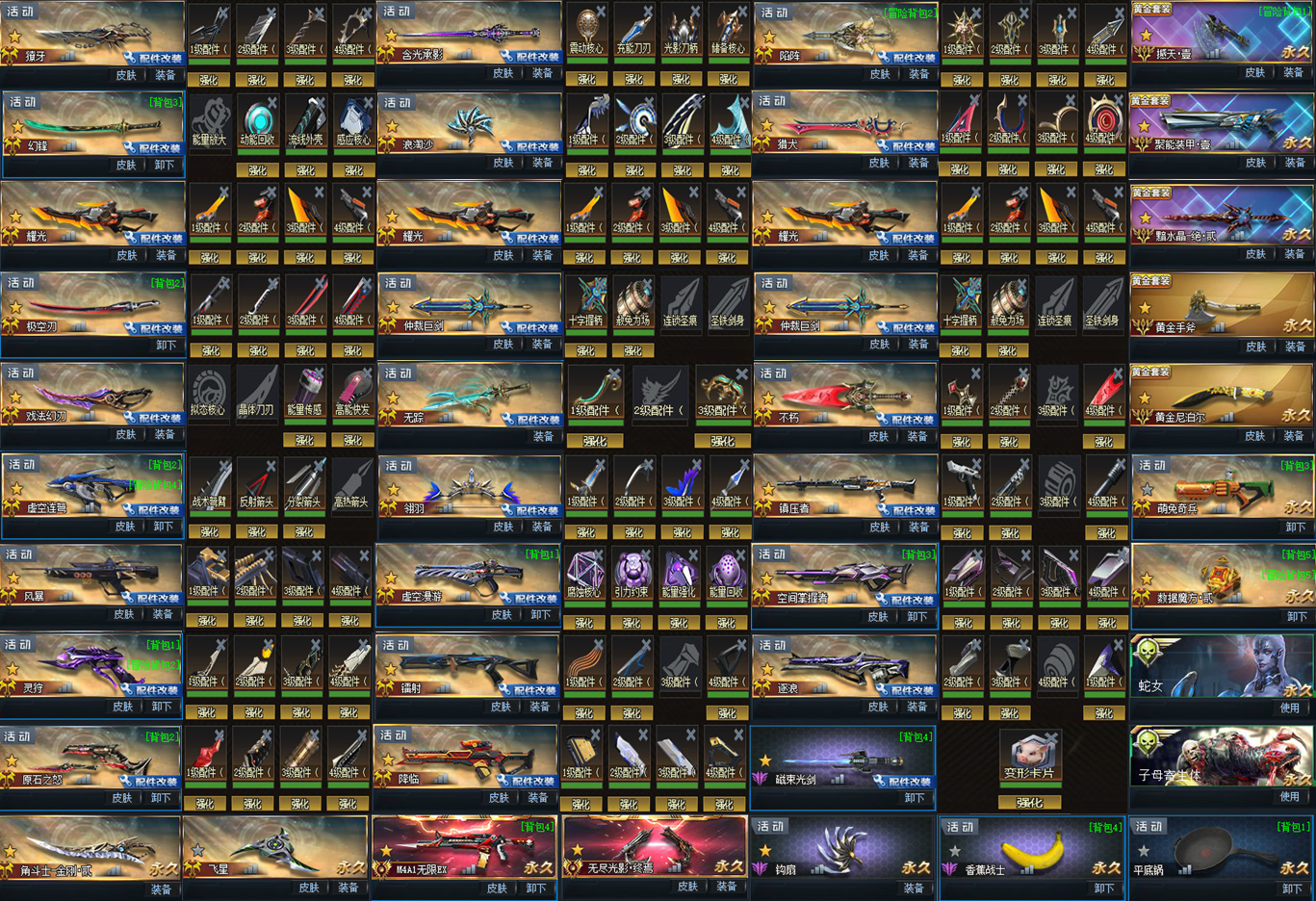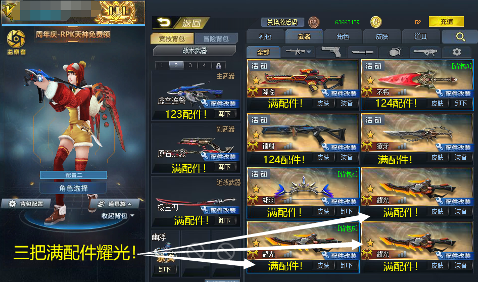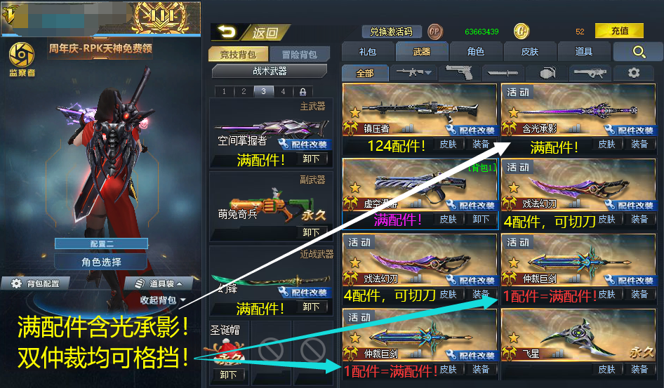 三把满配件耀光!双仲裁格挡!满獠牙!满幻锋!满含光承影!满陷阵!满浪淘沙!满极空刃!满虚空漫游!切刀戏法幻刃!124不朽!123虚空连弩!满配翎羽!满风暴!满空间掌握者!满灵狩!满原石之力!满降临!