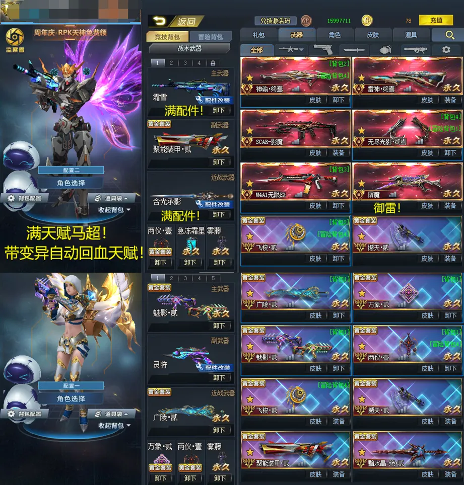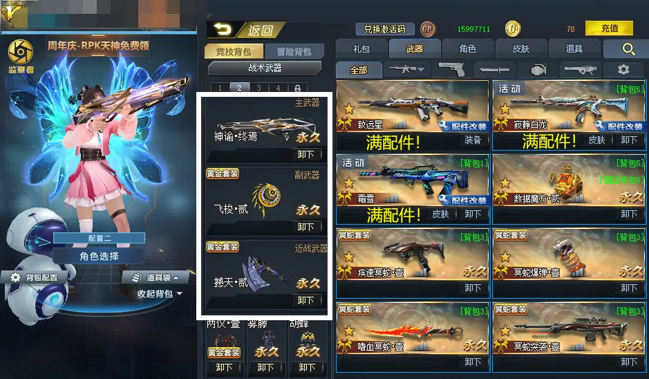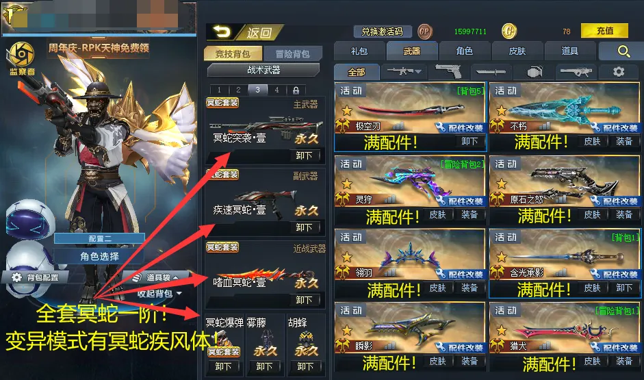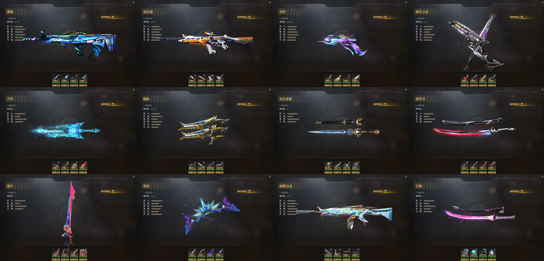 满配件武器:霜雪,致远星,灵狩,原石之怒,不朽,瞬影,含光承影,极空刃,猎犬,翎羽,白龙,幻锋