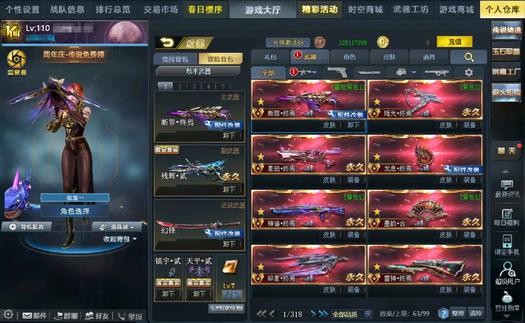 传说武器:◆断罪终焉(紫黛)◆瑶光终焉◆星珀终焉◆RPK主宰◆龙息·终焉◆神谕·终焉◆AK47主宰◆墨韵·合◆碎星·终焉◆SCAR-影魔◆无尽光影·终焉◆M4A1无限EX◆屠魔◆AK47天神◆万化主宰
