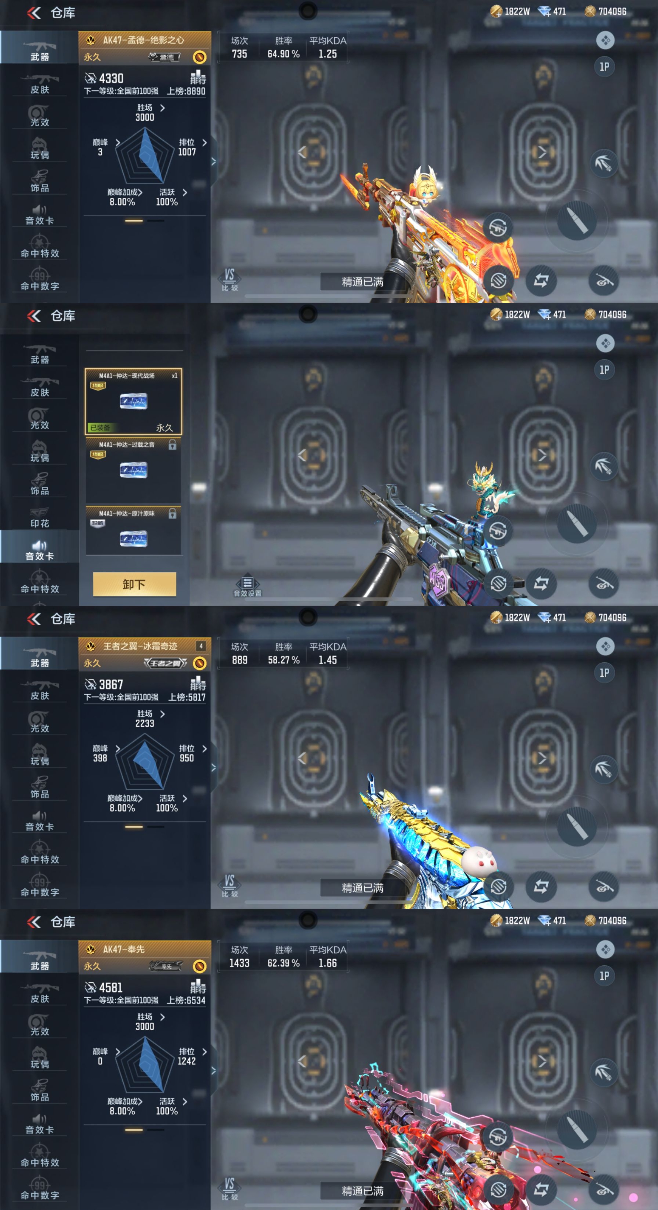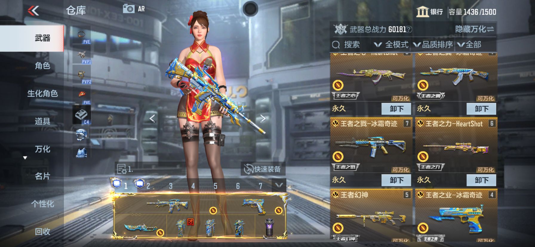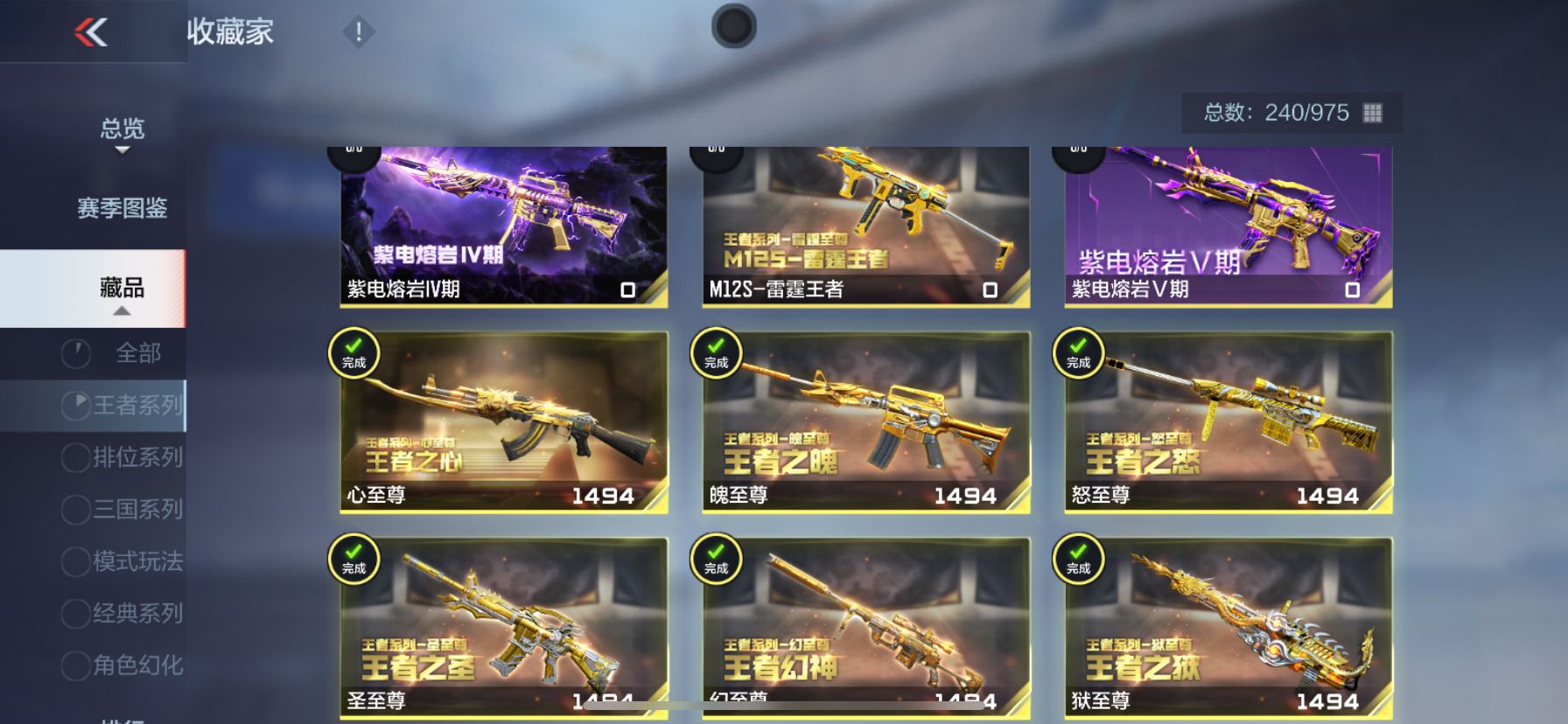 【武器】武器-王者之霆,武器-王者之魄,武器-王者之影,武器-王者之心,武器-王者之翼,武器-王者之戮,武器-王者之力,武器-王者之怒,武器-王者幻神,武器-王者之神,武器-王者之狱,武器-王者之业武器-王者之迹*4, 武器-王者之电,武器-王者之魂,武器-王者之隐,武器-王者之击,武器-王者之痕,武器-王者之啸,武器-王者之锋*2,武器-AN94-盖,武器-KSG-孟获,武器-AK47-奉先,武器-AK47-孟德,武器-AK47-波塞冬*2,武器-M4A1-仲达,武器-M4A1-星象,武器-M4A1-游骑兵*2,武器-MK47-仁德,武器-M200-幻神,武器-81式-光明之神,武器-MK47-云舞,武器-COP357-雷霆,武器-MK23-幻神*3,武器-炽芒蝶刃,武器-09式狙-天神,武器-09式狙-幻兽,武器-98K-血月,武器-98K-黑骑士*3,武器-9A91-天神,武器-AA12-火药,武器-AK12-天启武器-AK47-塔罗牌觉醒,武器-AK47-常胜,武器-AK47-幸运日觉醒,武器-AK47-无影,武器-AK47星速,武器-AK47-木兰,武器-AK47-死神,武器,AK47-沙漠郡主-二觉,武器-AK47-沙漠郡主一走武器-AK47-火麒麟,武器-AK47-破空冰刃,武器-AK47-血武士,武器-AK47-角斗士,武器-AK47-谜城烟火,武器-AK47-雅韵青花,武器-AK47-黑鲨