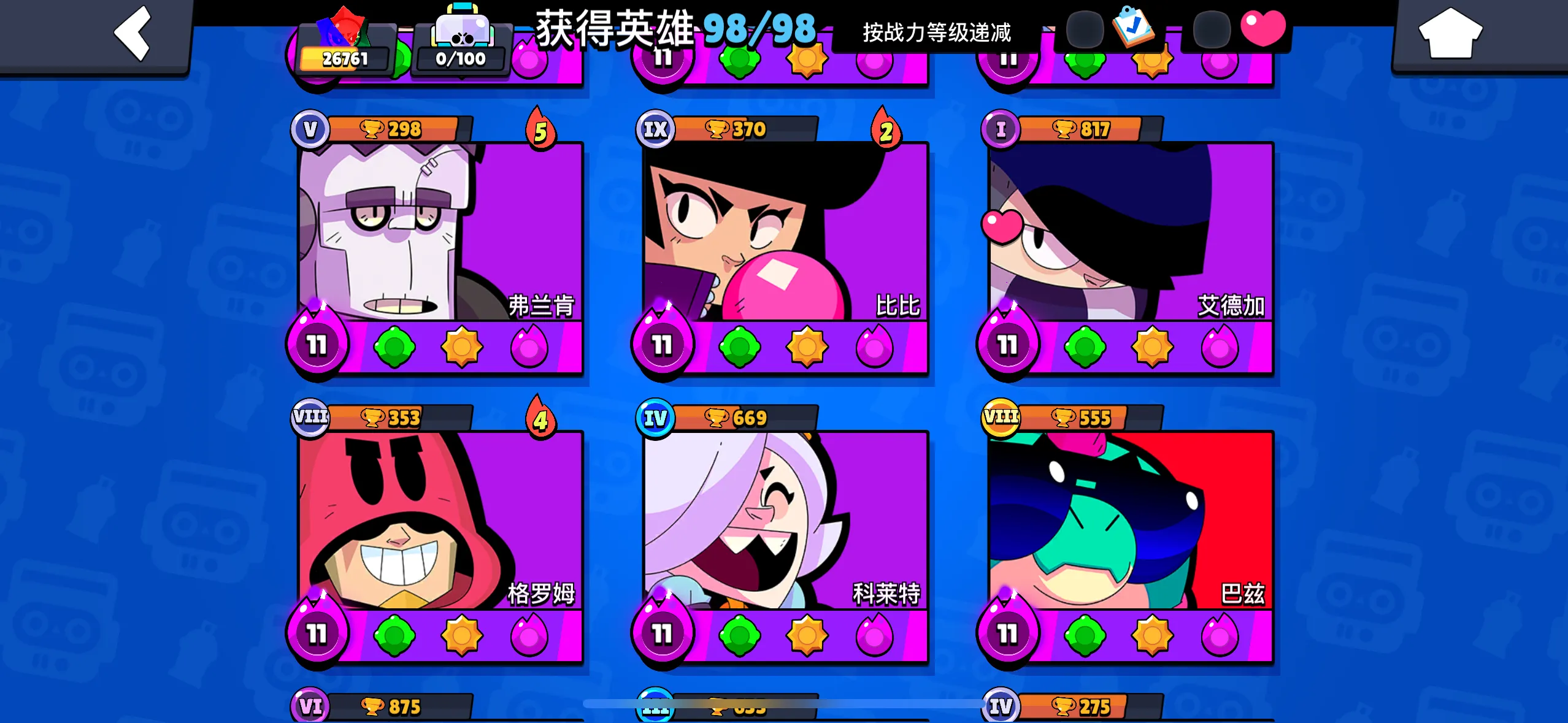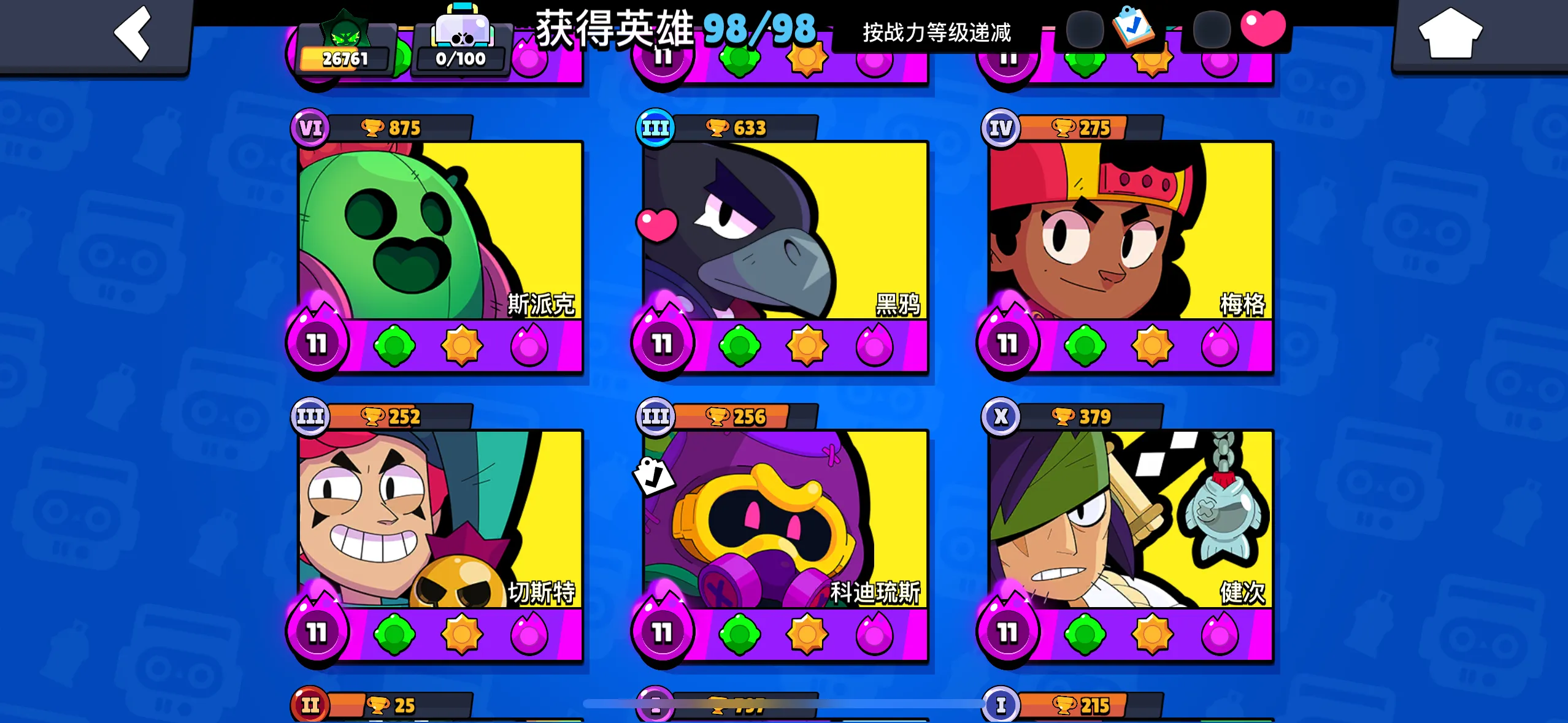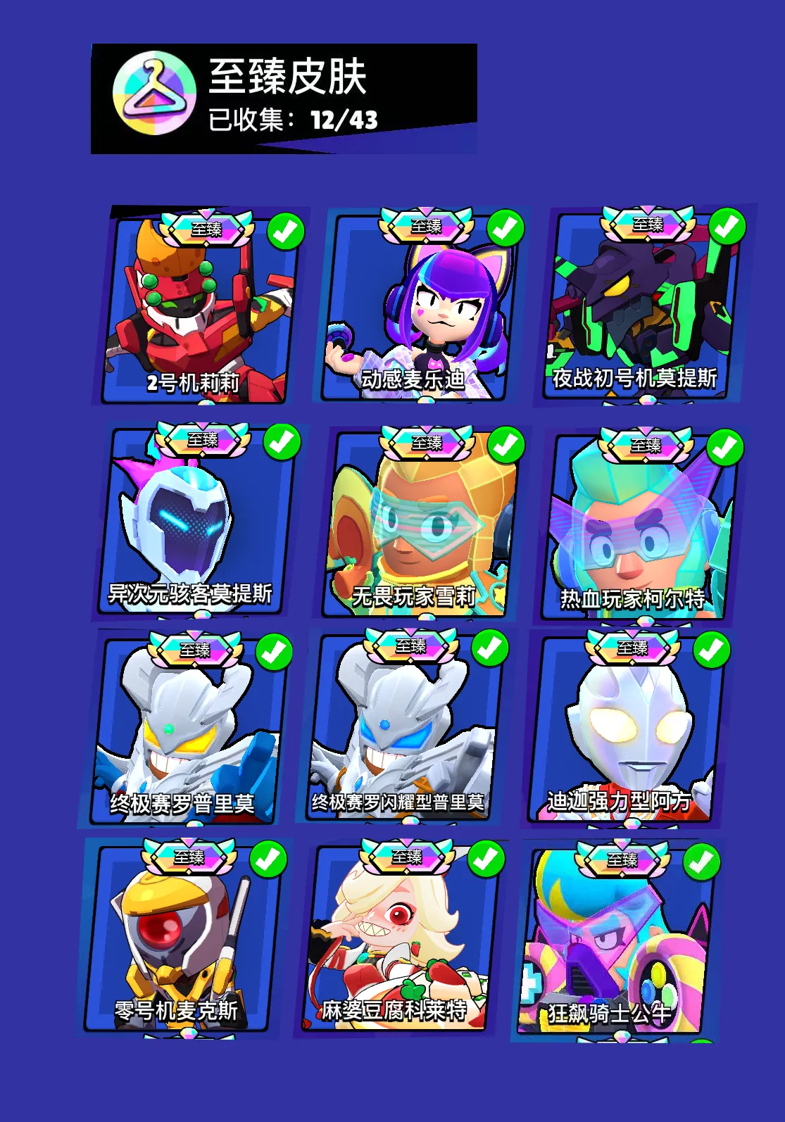 【苹果】 荒野乱斗:99英雄,43满级,21极限充能,12至臻皮肤,7极限充能皮肤
