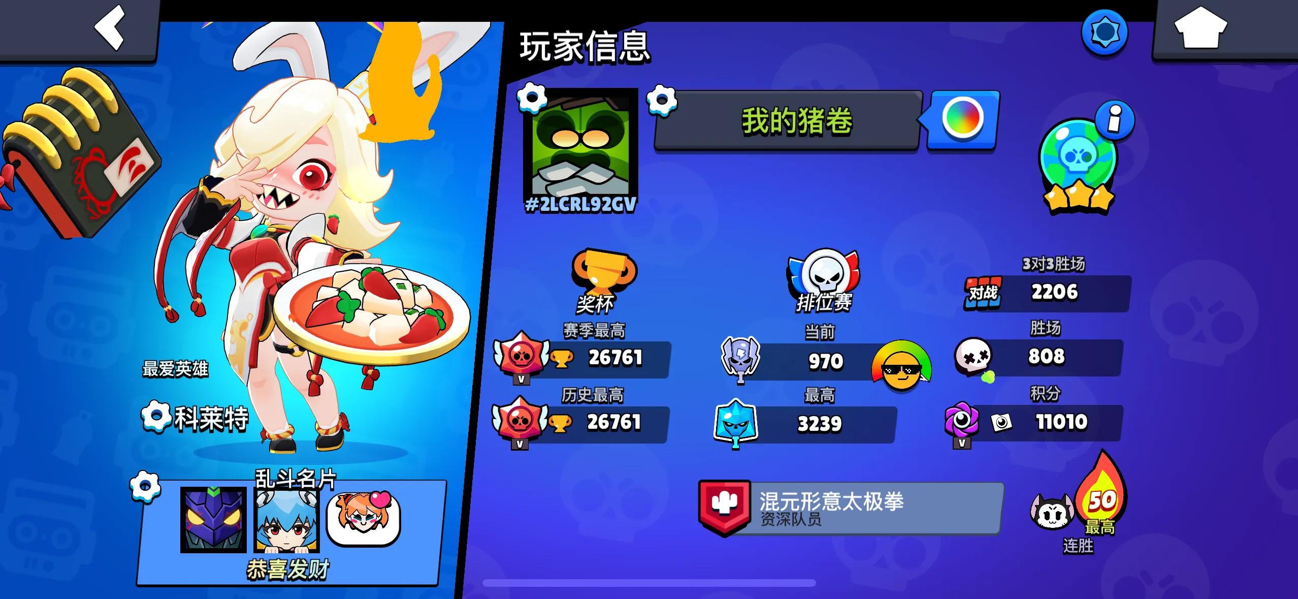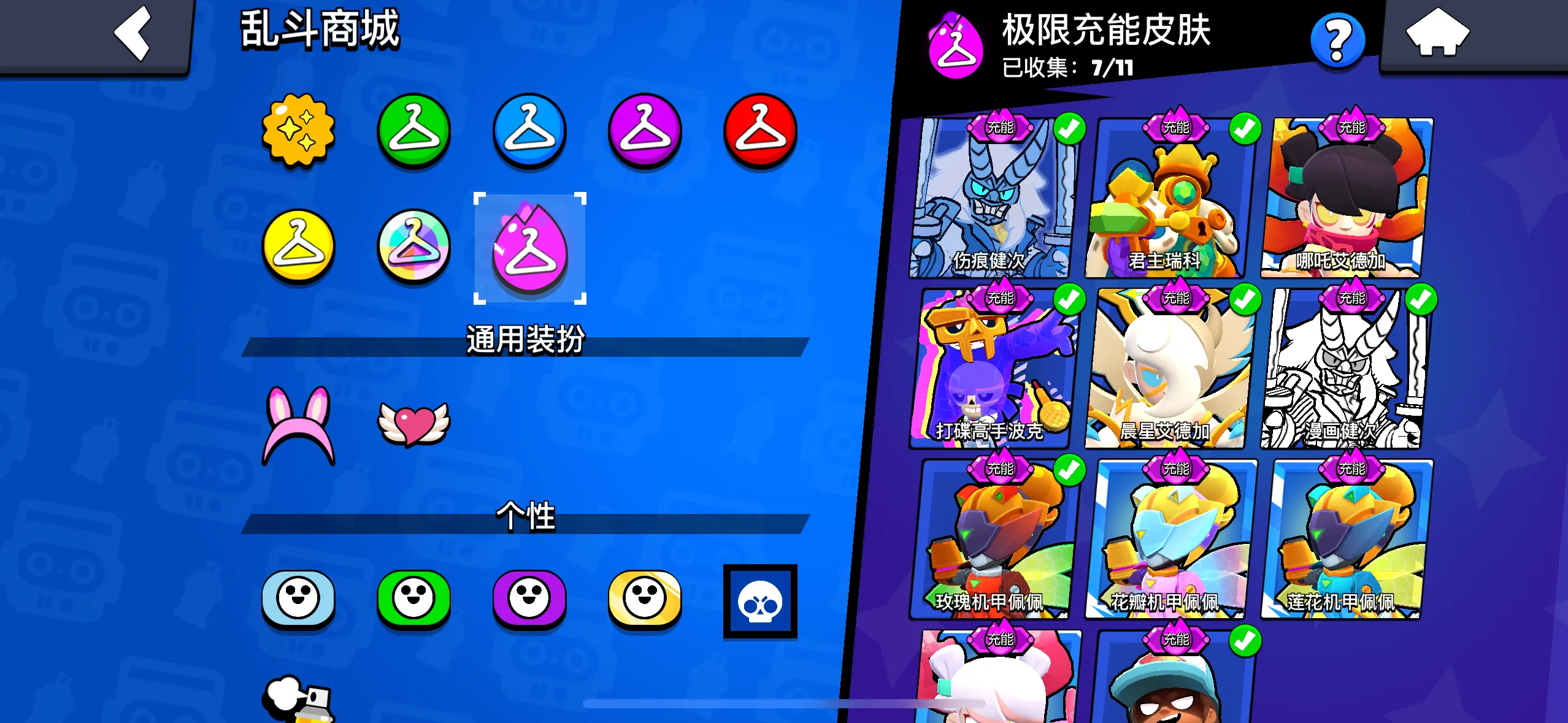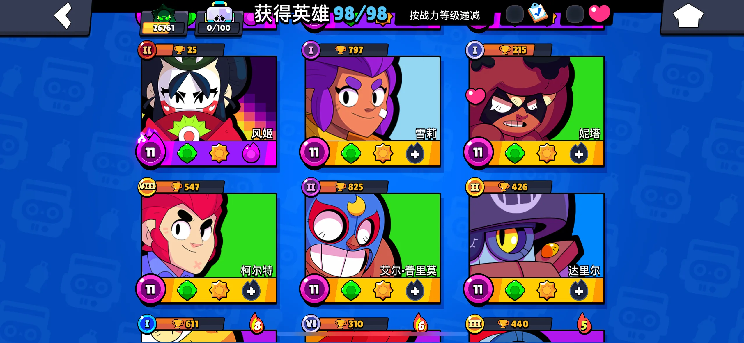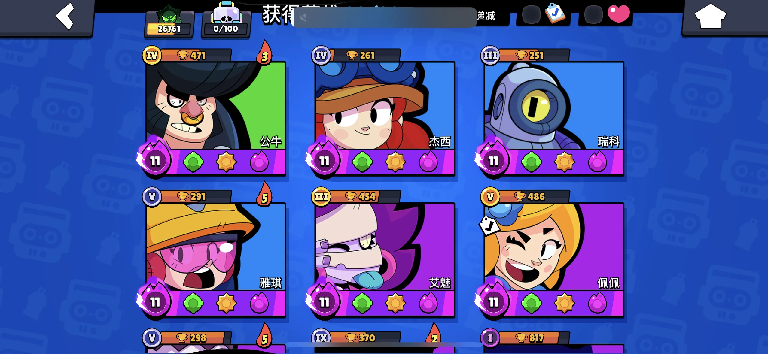 【苹果】 荒野乱斗:99英雄,43满级,21极限充能,12至臻皮肤,7极限充能皮肤
