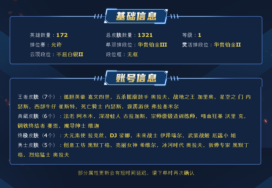 ~~喜欢记得收藏~~可排位~~1300皮全英雄~~租之前尽量查一下游戏ID,确保段位是您需要的,避免浪费您的时间~~请勿挂机逃跑故意送人头,谢谢合作,谢谢~~