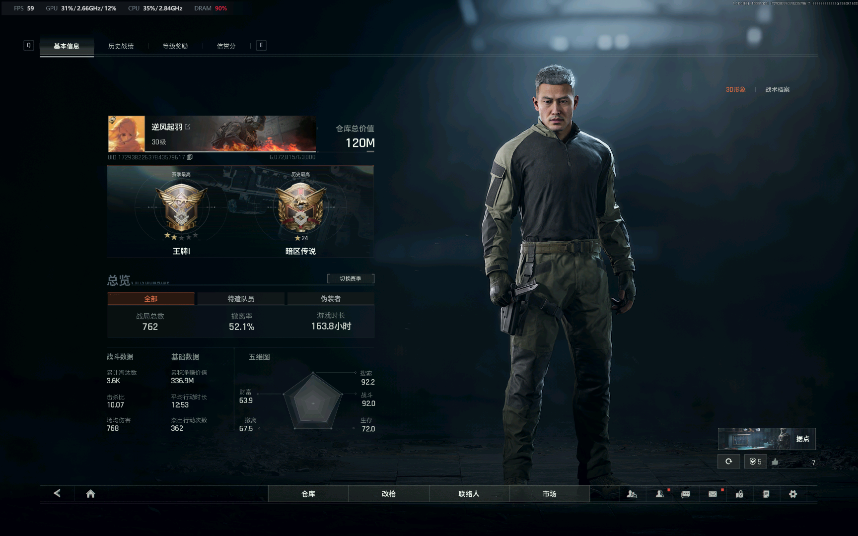 100多m仓库总价值,想玩啥枪玩啥枪,多大金都可卖,适合猛攻玩家以及护航租用。账号强度较低,战斗分有92,也适合带新人做3×3用。有一定枪的皮肤。
