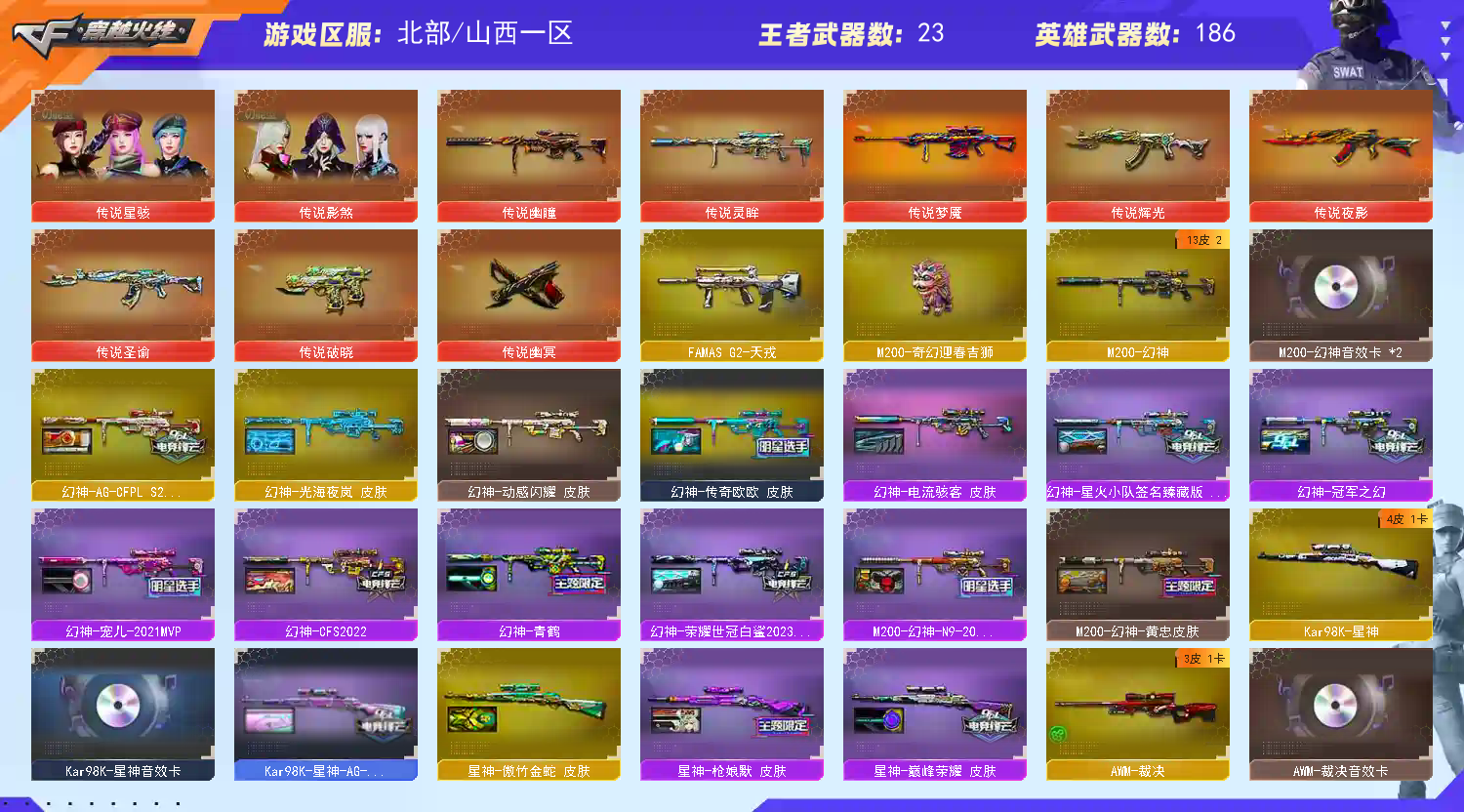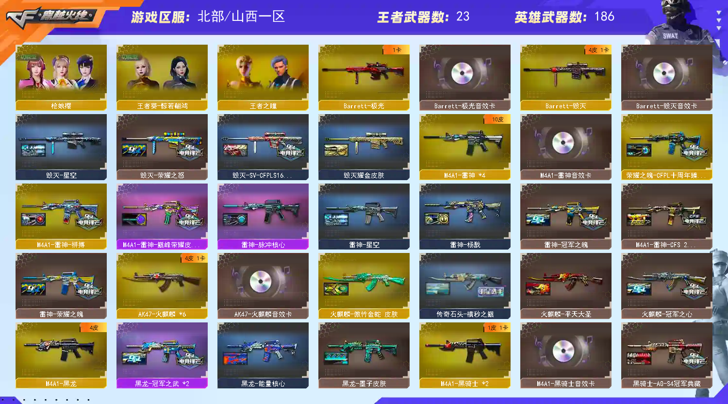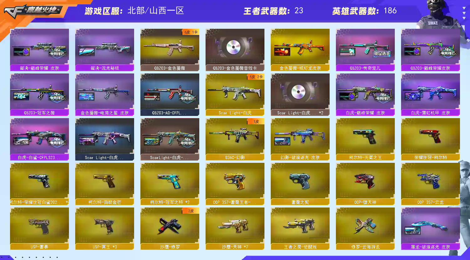 ✨手枪:USP冥王X3+柯尔特百战金芒+柯尔特白鲨X4+传说幽冥+传说破晓+COP堕天神+荣耀世冠柯尔特+冠军之特X2+USP雷暴+无冕之王+COP雷霆+COP雷霆王者+COP云龙