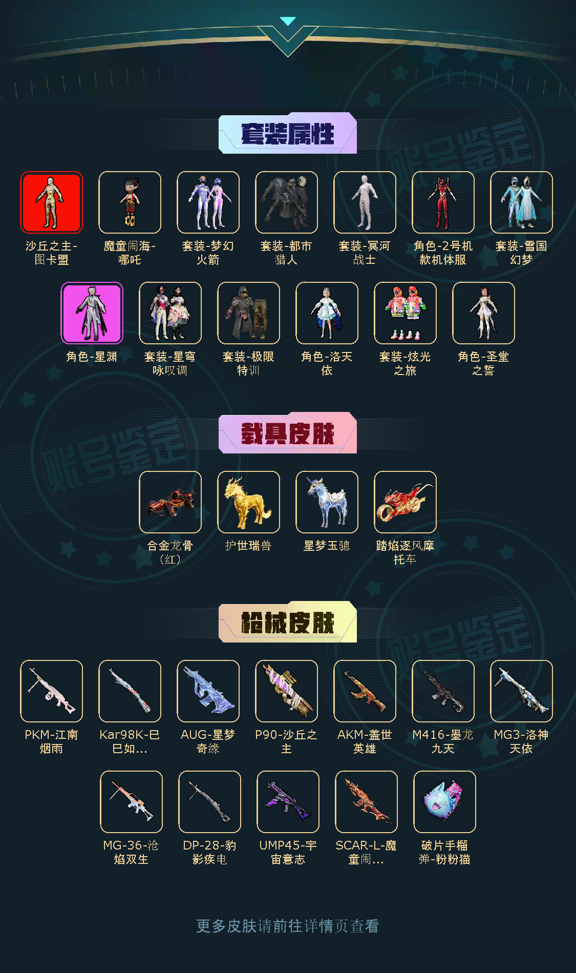 11粉,4载具,119套装,满级木乃伊,15王牌印记,绝世王牌21星历史最高段,98508热力值 Vector-绯穹魔姬/AKM-盖世英雄/AUG-星梦奇缘/M416-墨龙九天/SCAR-L-魔童闹海 哪吒/MG3-洛神天依/PKM-江南烟雨/MG-36-沧焰双生/DP-28-豹影疾电/UMP45-宇宙意志/P90-沙丘之主/破片手榴弹-粉粉猫爪/Kar98K-巳巳如意/合金龙骨(红)/护世瑞兽/星梦玉骢/踏焰逐风摩托车/