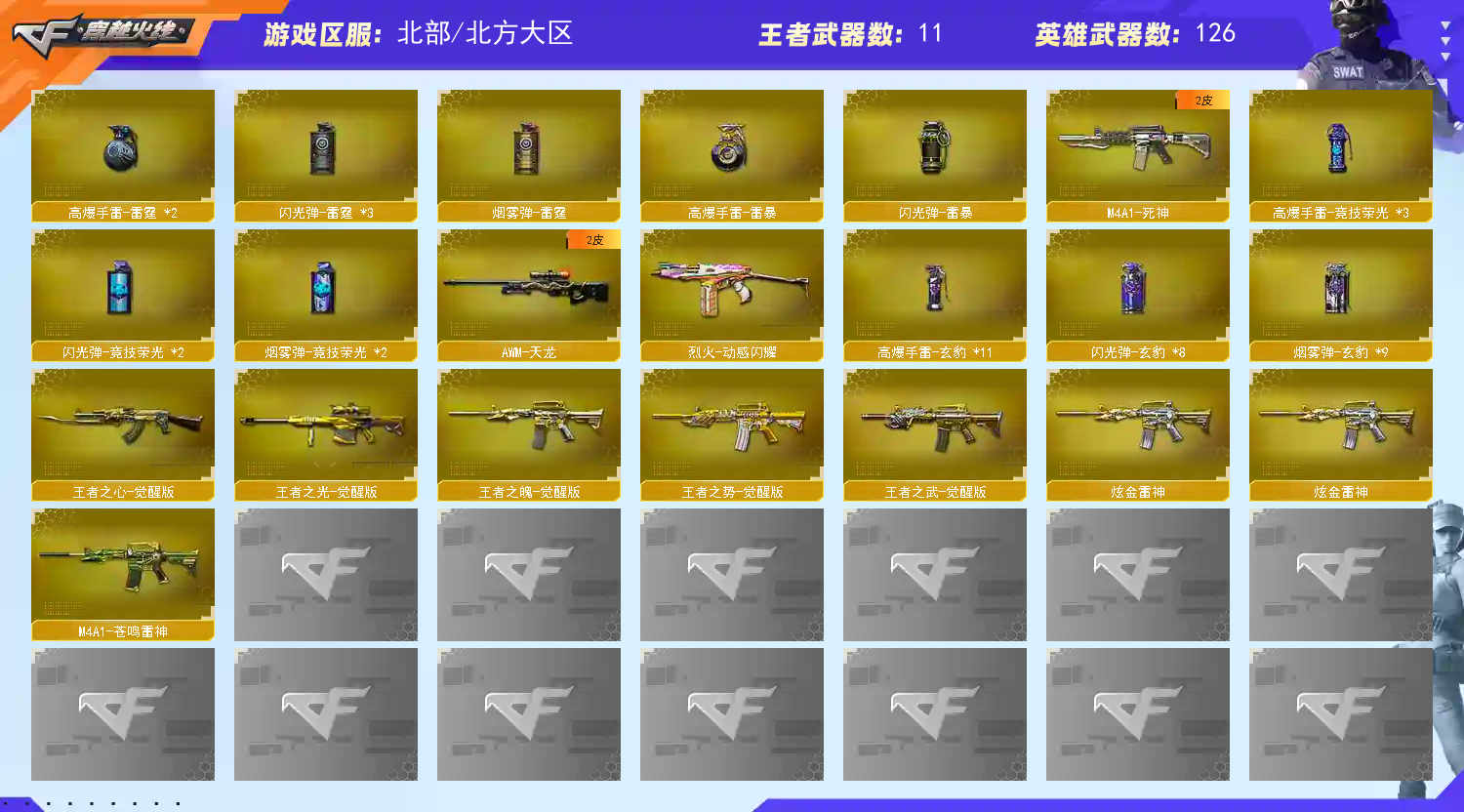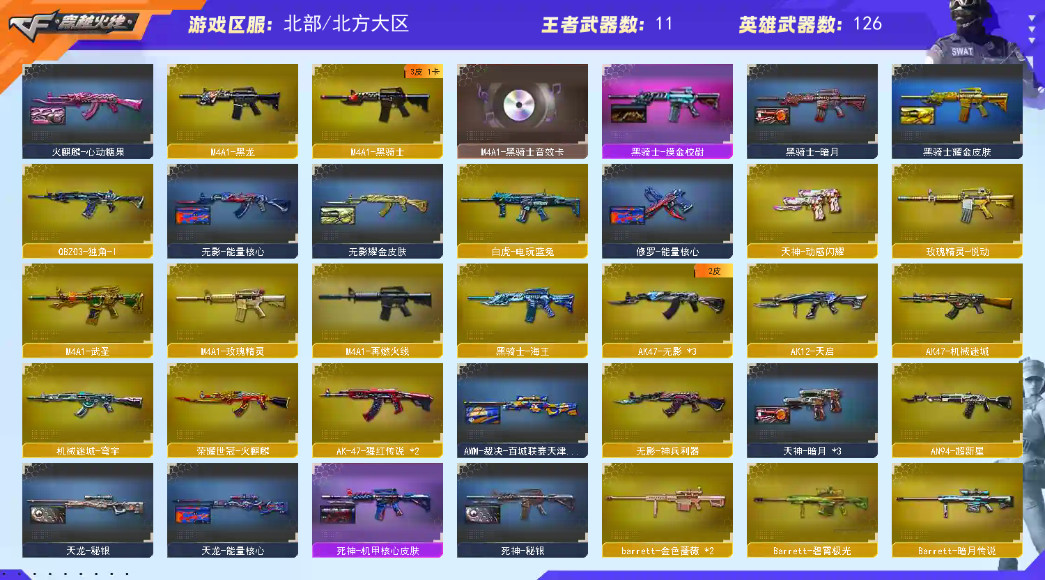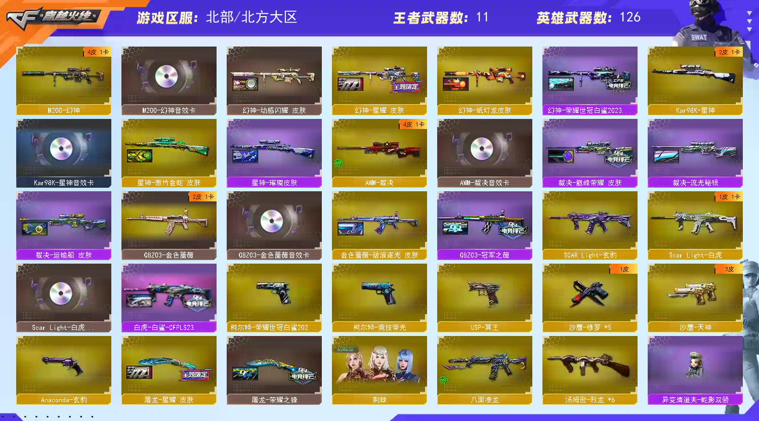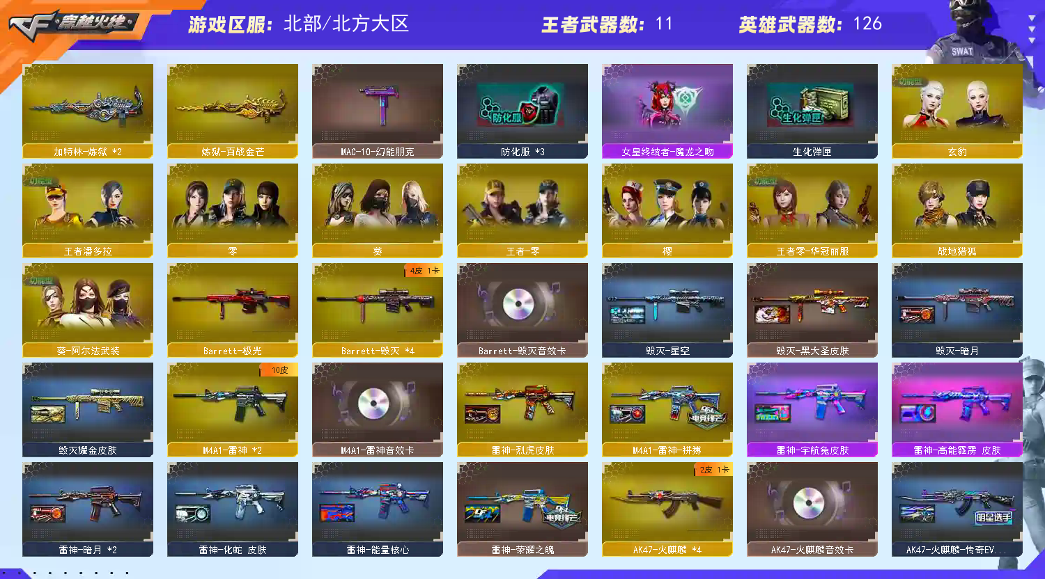 多四防角色,各种皮肤武器光效玩偶道具,欢迎来体验!武器太多,截不了那么多图!【此号全部装备太多截不了太多图,还有很多神器未截图,普通CF点武器也是一百多个就不截图了(满背包满道具爆破、生化、挑战武器应有尽有多个玩偶主流武器多光效),主流枪械都有皮肤】
