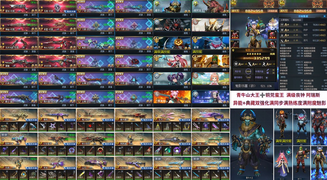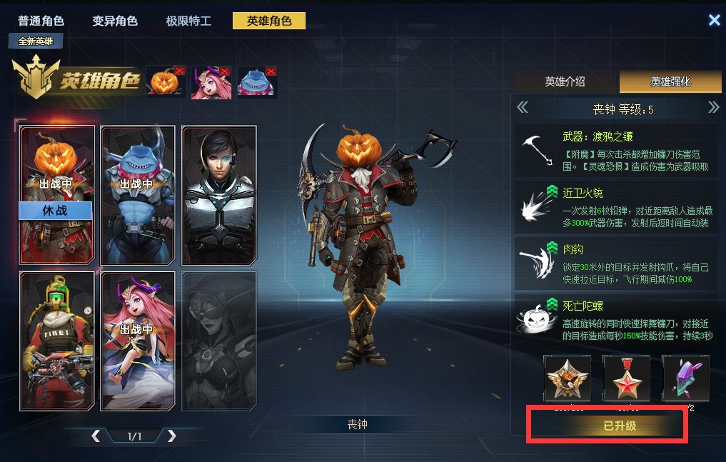 英雄角色:丧钟(满级满技能大头无敌)、鲨皇(满技能)、罐子头、鲲仑公主