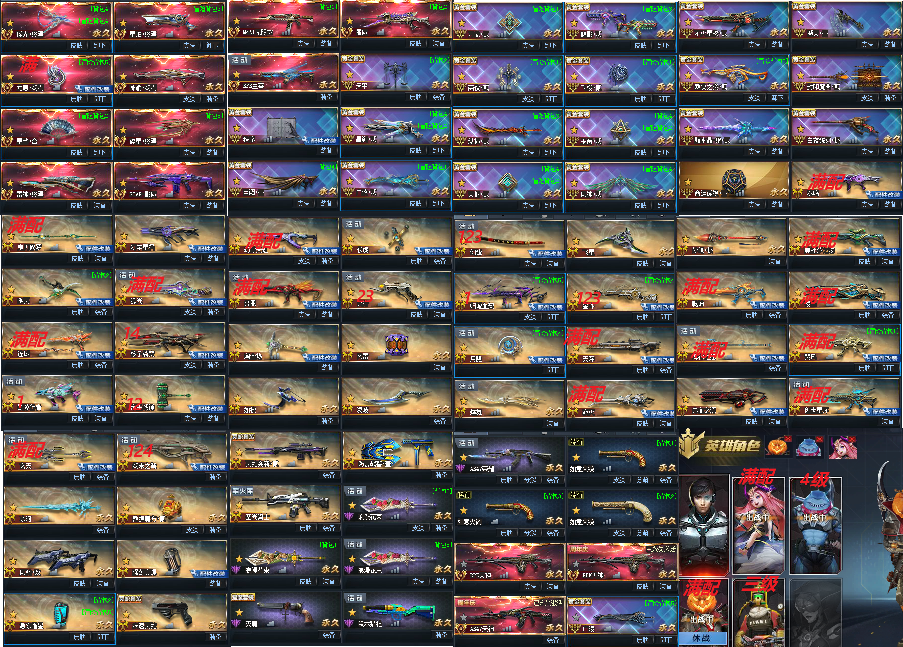 满配秦鸣 满配弧光 满配连城 14核子 1裂缝行者 12帝王战锤 满配幻彩 满配海神之怒 满配玄天 终末之弩124 炎凰满配 灵狩23 淘金热 风驰套 幻锋123 飞星 蝶舞(蝴蝶刀) 星斗123 天际满配 寂灭满配 乾坤满配 美杜莎满配 棱晶满配 樊风满配 创世满配 火铳3把 ak淬火