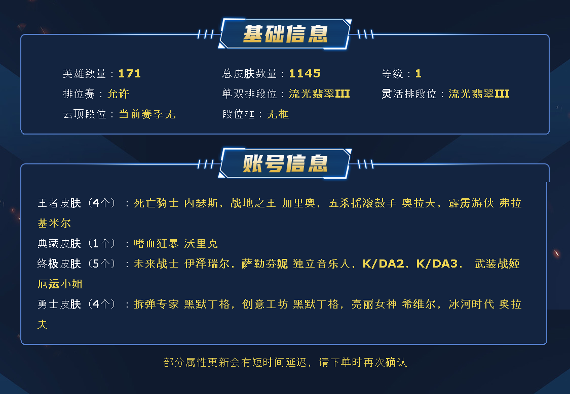 ~~喜欢记得收藏~~可排位~~1145皮全英雄~~租之前尽量查一下游戏ID,确保段位是您需要的,避免浪费您的时间~~请勿挂机逃跑故意送人头,谢谢合作,谢谢~~