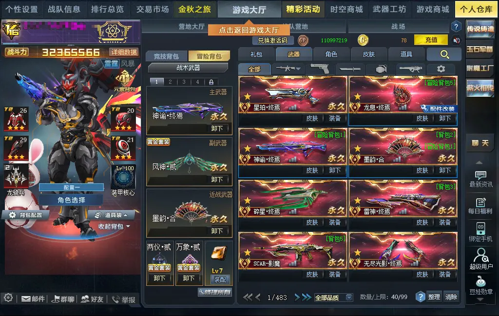 传说武器:星珀终焉◆RPK主宰◆龙息·终焉◆神谕·终焉◆AK47主宰◆墨韵·合◆碎星·终焉◆SCAR-影魔◆无尽光影·终焉◆M4A1无限EX◆屠魔◆AK47天神◆