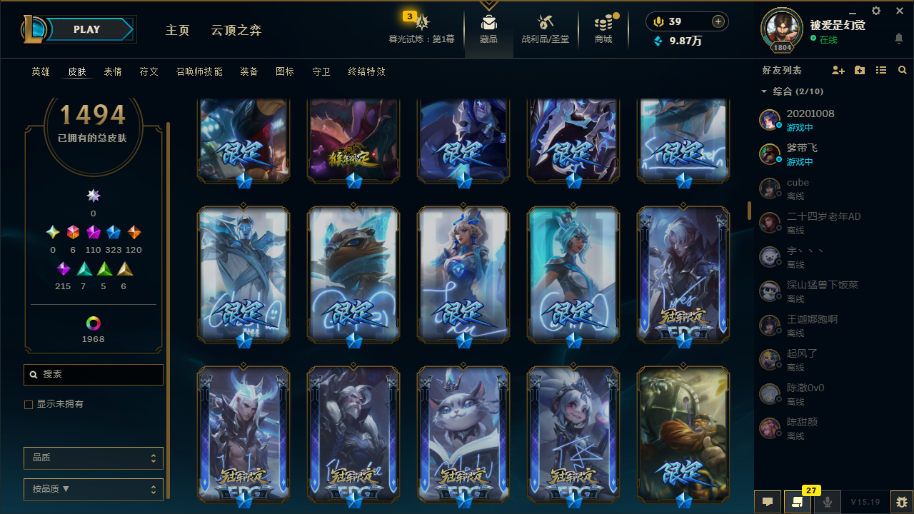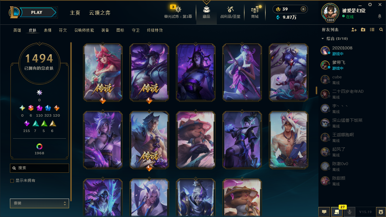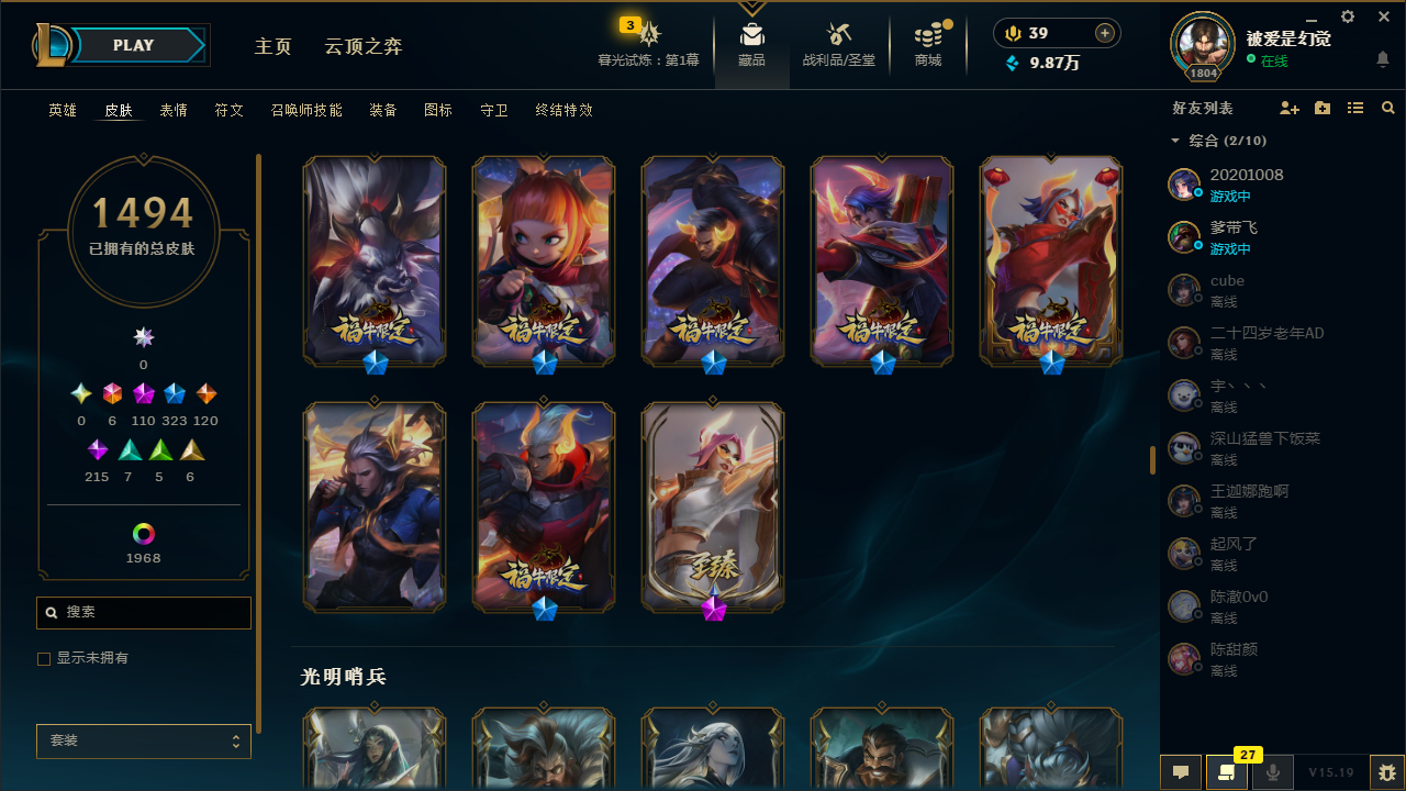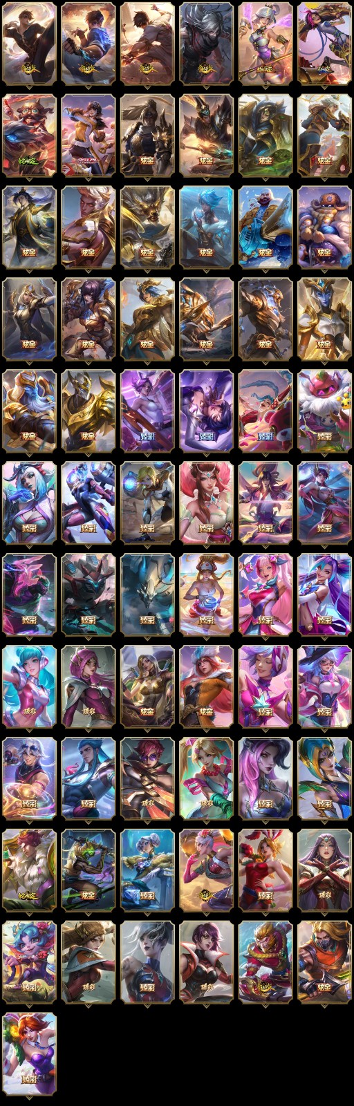 【重要皮肤】莲华温泉厄斐琉斯至臻 灵魂莲华劫至臻 战斗学院奇亚娜至臻 黑色玫瑰假面舞会卡特琳娜至臻 暗星女王黛安娜至臻 T1杰斯至臻 天龙之子伊泽瑞尔至臻 心之钢永恩至臻 玉剑传说琴仙子至臻 斗魂觉醒萨科至臻 斗魂觉醒派克至臻 DRX亚托克斯至臻 墨之影武者亚索至臻 花仙使者卡特琳娜至臻 绝息圣堂厄运小姐至臻 青花瓷丽桑卓至臻 北极星使者沃里克至臻 太空律动魔音海妖娜美至臻 海珀利安小队X09星环灵风迦娜至臻 星之守护者辛德拉至臻 星之守护者艾克至臻 海之歌萨勒芬妮至臻 西部魔影猎天使恶魔泰隆至臻 月蚀骑士赛娜至臻 幻灵战斗猫金克丝至臻 青花瓷拉克丝至臻 神凰行者烈羽焰凰霞至臻 魅惑女巫莫甘娜至臻 女帝黛安娜至臻 战斗学院蕾欧娜至臻 太空律动璐璐至臻 魔女婕拉至臻 魔女乐芙兰至臻 奥术师佐伊至臻 未来战士卢锡安至臻 真实伤害亚索至臻 真实伤害赛娜至臻 星之守护者索拉卡至臻 灵魂莲华提莫至臻 灵能特工伊泽瑞尔至臻 福牛守护者菲奥娜至臻 源计划逆流塞拉斯至臻 源计划阴劫至臻 王国机神玄武盖伦至臻 暗星墨菲特至臻 神龙尊者炎龙瑟提至臻 黑夜使者凯隐至臻 神龙尊者均衡之龙沃利贝尔至臻 征服者贾克斯至臻 飞升战神潘森至臻 焰执事布兰德至臻 KDA二代卡莎至臻 KDA一代卡莎至臻 KDA卡莎2022至臻 KDA阿狸至臻 KDA伊芙琳至臻 KDA阿卡丽至臻 KDA阿卡丽2022至臻 战斗学院拉克丝至臻 战斗学院拉克丝2022至臻 烈焰美人薇恩至臻 烈焰美人薇恩2022至臻 电玩女神凯特琳至臻 电玩女神凯特琳2022至臻 魅惑女巫厄运小姐至臻 星之守护者妮蔻至臻 星之守护者妮蔻2022至臻 源计划正义艾瑞莉娅至臻 源计划正义艾瑞莉娅2022至臻 真实伤害奇亚娜至臻 真实伤害奇亚娜2022至臻 绒毛菲兹至臻 绒毛菲兹2022至臻 玉剑传说武剑仙至臻 玉剑传说武剑仙2022至臻 腥红之月亚托克斯至臻 腥红之月亚托克斯2022至臻 未来战士锤石至臻 未来战士锤石2022至臻 黑夜使者李青至臻 黑夜使者李青2022至臻 殿堂传奇乐芙兰 水晶巫灵泽拉斯 灰烬守护者慎 灰烬骑士莫德凯撒 灰烬骑士派克 灰烬征服者潘森 海克斯科技安妮 海克斯科技瑟庄妮 海克斯科技雷克顿 海克斯科技克格莫 海克斯科技吉格斯 海克斯科技波比 海克斯科技嘉文四世 海克斯科技阿木木 海克斯科技拉莫斯 海克斯科技崔丝塔娜 新卧虎藏龙贾克斯 水晶圣骑艾希 星之守护者塔莉垭 光明哨兵奥拉夫 黎明使者卡尔玛 恐惧新星德莱厄斯 零之枪骑赫卡里姆 摄魂使者薇恩 新创战纪希维尔 青年瑞兹 胜利剑圣易 胜利女神娑娜 胜利女神希维尔 胜利之王泰达米尔 哥特萝莉安妮 银白审判凯尔 冰原狙击凯特琳 冰原核弹古拉加斯 舞会公主安妮 创星之灵璐璐 钢铁军团拉克丝 奥斯曼大帝泰达米尔 庆典女皇艾尼维亚 荣誉使者玛尔扎哈 黑夜使者弗拉基米尔 养蜂人辛吉德 安妮梦游仙境 勇敢的心德莱厄斯 电玩女神厄运小姐 电玩勇者锐雯 电玩女神阿狸 星之守护者伊泽瑞尔 玉剑传说无影 玉剑传说舞剑仙 神凰行者幽羽玄凰萨勒芬妮 神凰行者烈羽焰凰霞 海珀利安小队Z01猎户座卢锡安 海珀利安小队Y03权天使卡蜜尔 女帝厄运小姐 玉剑传说神机花火 玉剑传说舞龙卫 星之守护者佐伊 灵能特工易 黎明使者薇恩 点心宝贝阿木木 龙的传人李青 银龙裁决泰隆 天龙之子斯莫德 剪纸仙灵艾瑞莉娅 剪纸仙灵希维尔 剪纸仙灵盖伦 剪纸仙灵婕拉 剪纸仙灵加里奥 虎头虎脑崔丝塔娜 烈焰仙子黛安娜 龙腾虎跃瑟提 猛虎下山赵信 招财进宝提莫 替父从军花木兰 神龙烈焰金克丝 碧玉之牙卡西奥佩娅 古琴余韵娑娜 春晖神女拉克丝 你看见过我的熊猫吗安妮 北辰之威内瑟斯 南天之怒沃里克 美猴王孙悟空 定海神珍孙悟空 玉净夜叉凯特琳 紫金罗刹莫甘娜 广寒仙子嫦娥 虎痴之拳蔚 张辽文远 司马懿仲达 金猪烈焰瑟庄妮 烈焰美人薇恩 纳财大帝塔姆 醒狮克格莫 神龙之翼库奇 征服者贾克斯 王国机神青龙德莱文 王国机神白虎贾克斯 福牛守护者安妮 福牛守护者厄斐琉斯 福牛守护者德莱厄斯 福牛守护者阿利斯塔 福牛守护者嘉文四世 福牛守护者菲奥娜 胜利之树茂凯 胜利机器人布里茨 胜利女神奥莉安娜 胜利枪神格雷福斯 胜利枪神卢锡安 胜利女神莫甘娜 胜利之剑亚托克斯 怦然心动凯特琳 意乱情迷蔚 水晶玫瑰阿克尚 水晶玫瑰迦娜 幽梦玫瑰伊莉丝 碎心之拳蔚 甜心之羽霞 甜心之翎洛 甜心宝贝安妮 甜心宝贝娑娜 穿心之剑菲奥娜 觅心游侠卢锡安 觅心魔灵奥莉安娜 觅心女王艾希 觅心之翼奎因 觅心萝莉金克丝 觅心猫猫悠米 觅心猎手薇恩 幽梦玫瑰辛德拉 幽梦玫瑰泰隆 水晶玫瑰婕拉 水晶玫瑰斯维因 双城之战2微光实验室辛吉德 北极星使者彗 北极星神黛安娜 北极星守望者佐伊 北极星圣贤基兰 北极星猎人斯维因 冬境仙灵索拉卡 寒冬精灵璐璐 冬季仙境奥莉安娜 雪球也能爆炸吉格斯 圣诞捣蛋鬼金克丝 圣诞老人布隆 圣诞老人德莱文 冰雪驯鹿波比 冰雪风暴希维尔 冬季仙境卡尔玛 持胡萝卜的雪人易 狂心冰王图奇 冰封王子蒙多 冰雪女神辛德拉 魄罗骑士瑟庄妮 夺命美人卡特琳娜 平安夜女神娑娜 圣诞糖果棒厄运小姐 魅惑女巫迦娜 魅惑女巫厄运小姐 魅惑女巫莫甘娜 魅惑女巫崔丝塔娜 魅惑女巫奈德丽 魅惑女巫伊莉丝 伯爵卡萨丁 大魔法锅布里茨 大魔王提莫 死亡誓约卡特琳娜 死亡誓约