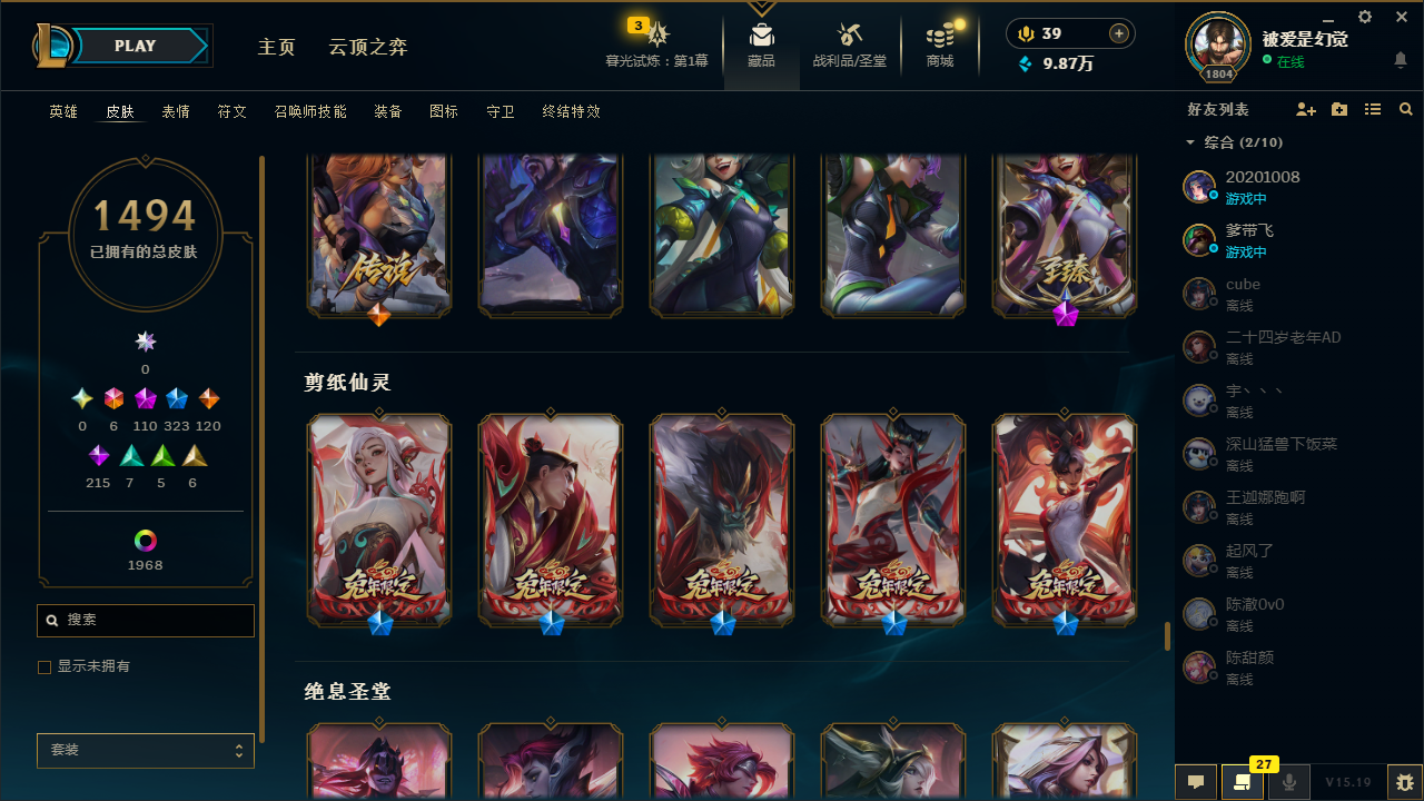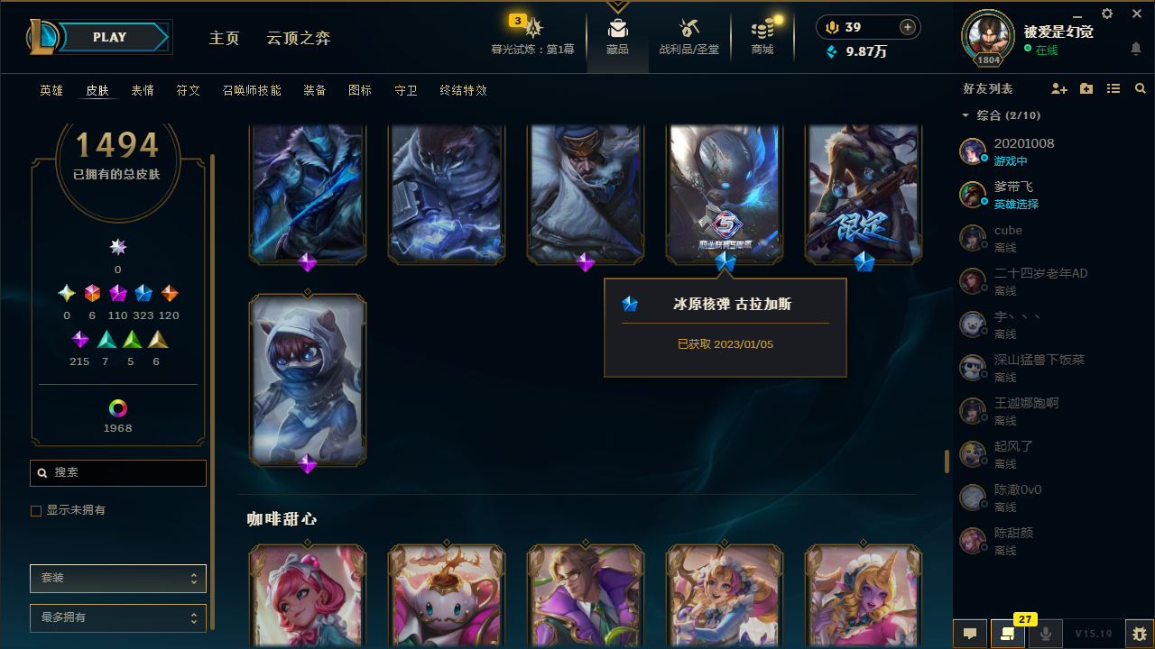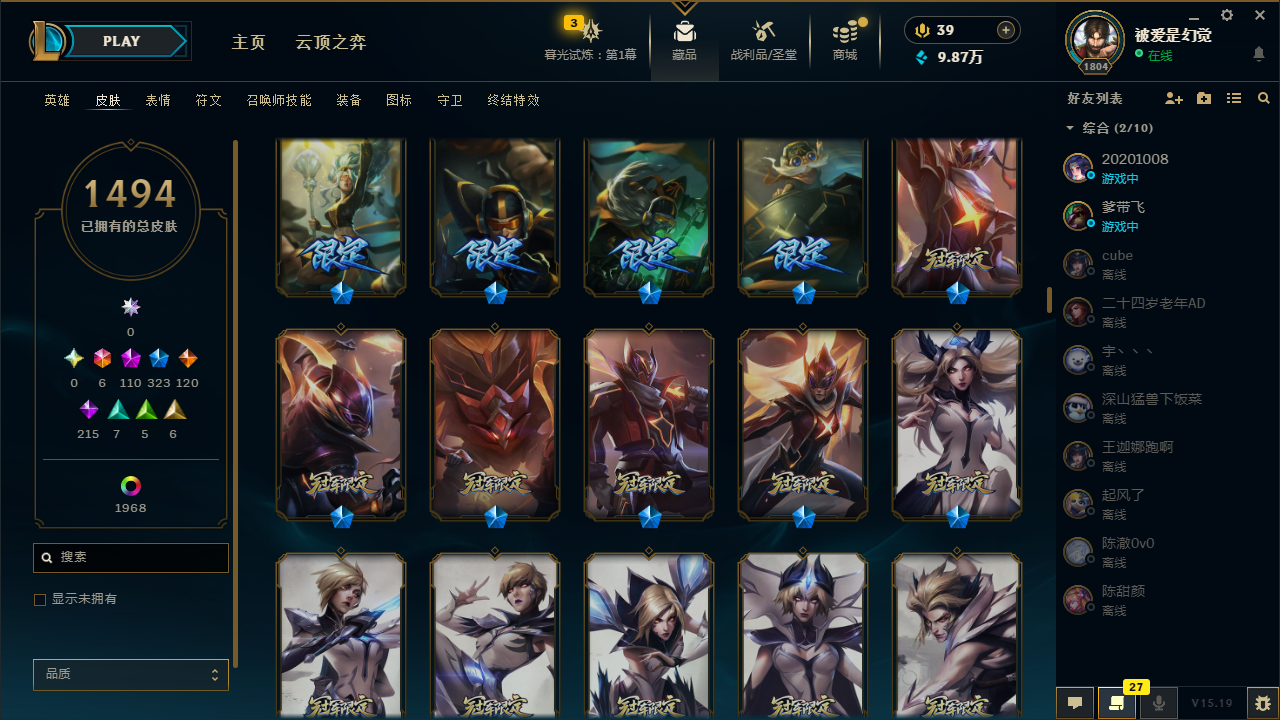 【重要皮肤】莲华温泉厄斐琉斯至臻 灵魂莲华劫至臻 战斗学院奇亚娜至臻 黑色玫瑰假面舞会卡特琳娜至臻 暗星女王黛安娜至臻 T1杰斯至臻 天龙之子伊泽瑞尔至臻 心之钢永恩至臻 玉剑传说琴仙子至臻 斗魂觉醒萨科至臻 斗魂觉醒派克至臻 DRX亚托克斯至臻 墨之影武者亚索至臻 花仙使者卡特琳娜至臻 绝息圣堂厄运小姐至臻 青花瓷丽桑卓至臻 北极星使者沃里克至臻 太空律动魔音海妖娜美至臻 海珀利安小队X09星环灵风迦娜至臻 星之守护者辛德拉至臻 星之守护者艾克至臻 海之歌萨勒芬妮至臻 西部魔影猎天使恶魔泰隆至臻 月蚀骑士赛娜至臻 幻灵战斗猫金克丝至臻 青花瓷拉克丝至臻 神凰行者烈羽焰凰霞至臻 魅惑女巫莫甘娜至臻 女帝黛安娜至臻 战斗学院蕾欧娜至臻 太空律动璐璐至臻 魔女婕拉至臻 魔女乐芙兰至臻 奥术师佐伊至臻 未来战士卢锡安至臻 真实伤害亚索至臻 真实伤害赛娜至臻 星之守护者索拉卡至臻 灵魂莲华提莫至臻 灵能特工伊泽瑞尔至臻 福牛守护者菲奥娜至臻 源计划逆流塞拉斯至臻 源计划阴劫至臻 王国机神玄武盖伦至臻 暗星墨菲特至臻 神龙尊者炎龙瑟提至臻 黑夜使者凯隐至臻 神龙尊者均衡之龙沃利贝尔至臻 征服者贾克斯至臻 飞升战神潘森至臻 焰执事布兰德至臻 KDA二代卡莎至臻 KDA一代卡莎至臻 KDA卡莎2022至臻 KDA阿狸至臻 KDA伊芙琳至臻 KDA阿卡丽至臻 KDA阿卡丽2022至臻 战斗学院拉克丝至臻 战斗学院拉克丝2022至臻 烈焰美人薇恩至臻 烈焰美人薇恩2022至臻 电玩女神凯特琳至臻 电玩女神凯特琳2022至臻 魅惑女巫厄运小姐至臻 星之守护者妮蔻至臻 星之守护者妮蔻2022至臻 源计划正义艾瑞莉娅至臻 源计划正义艾瑞莉娅2022至臻 真实伤害奇亚娜至臻 真实伤害奇亚娜2022至臻 绒毛菲兹至臻 绒毛菲兹2022至臻 玉剑传说武剑仙至臻 玉剑传说武剑仙2022至臻 腥红之月亚托克斯至臻 腥红之月亚托克斯2022至臻 未来战士锤石至臻 未来战士锤石2022至臻 黑夜使者李青至臻 黑夜使者李青2022至臻 殿堂传奇乐芙兰 水晶巫灵泽拉斯 灰烬守护者慎 灰烬骑士莫德凯撒 灰烬骑士派克 灰烬征服者潘森 海克斯科技安妮 海克斯科技瑟庄妮 海克斯科技雷克顿 海克斯科技克格莫 海克斯科技吉格斯 海克斯科技波比 海克斯科技嘉文四世 海克斯科技阿木木 海克斯科技拉莫斯 海克斯科技崔丝塔娜 新卧虎藏龙贾克斯 水晶圣骑艾希 星之守护者塔莉垭 光明哨兵奥拉夫 黎明使者卡尔玛 恐惧新星德莱厄斯 零之枪骑赫卡里姆 摄魂使者薇恩 新创战纪希维尔 青年瑞兹 胜利剑圣易 胜利女神娑娜 胜利女神希维尔 胜利之王泰达米尔 哥特萝莉安妮 银白审判凯尔 冰原狙击凯特琳 冰原核弹古拉加斯 舞会公主安妮 创星之灵璐璐 钢铁军团拉克丝 奥斯曼大帝泰达米尔 庆典女皇艾尼维亚 荣誉使者玛尔扎哈 黑夜使者弗拉基米尔 养蜂人辛吉德 安妮梦游仙境 勇敢的心德莱厄斯 电玩女神厄运小姐 电玩勇者锐雯 电玩女神阿狸 星之守护者伊泽瑞尔 玉剑传说无影 玉剑传说舞剑仙 神凰行者幽羽玄凰萨勒芬妮 神凰行者烈羽焰凰霞 海珀利安小队Z01猎户座卢锡安 海珀利安小队Y03权天使卡蜜尔 女帝厄运小姐 玉剑传说神机花火 玉剑传说舞龙卫 星之守护者佐伊 灵能特工易 黎明使者薇恩 点心宝贝阿木木 龙的传人李青 银龙裁决泰隆 天龙之子斯莫德 剪纸仙灵艾瑞莉娅 剪纸仙灵希维尔 剪纸仙灵盖伦 剪纸仙灵婕拉 剪纸仙灵加里奥 虎头虎脑崔丝塔娜 烈焰仙子黛安娜 龙腾虎跃瑟提 猛虎下山赵信 招财进宝提莫 替父从军花木兰 神龙烈焰金克丝 碧玉之牙卡西奥佩娅 古琴余韵娑娜 春晖神女拉克丝 你看见过我的熊猫吗安妮 北辰之威内瑟斯 南天之怒沃里克 美猴王孙悟空 定海神珍孙悟空 玉净夜叉凯特琳 紫金罗刹莫甘娜 广寒仙子嫦娥 虎痴之拳蔚 张辽文远 司马懿仲达 金猪烈焰瑟庄妮 烈焰美人薇恩 纳财大帝塔姆 醒狮克格莫 神龙之翼库奇 征服者贾克斯 王国机神青龙德莱文 王国机神白虎贾克斯 福牛守护者安妮 福牛守护者厄斐琉斯 福牛守护者德莱厄斯 福牛守护者阿利斯塔 福牛守护者嘉文四世 福牛守护者菲奥娜 胜利之树茂凯 胜利机器人布里茨 胜利女神奥莉安娜 胜利枪神格雷福斯 胜利枪神卢锡安 胜利女神莫甘娜 胜利之剑亚托克斯 怦然心动凯特琳 意乱情迷蔚 水晶玫瑰阿克尚 水晶玫瑰迦娜 幽梦玫瑰伊莉丝 碎心之拳蔚 甜心之羽霞 甜心之翎洛 甜心宝贝安妮 甜心宝贝娑娜 穿心之剑菲奥娜 觅心游侠卢锡安 觅心魔灵奥莉安娜 觅心女王艾希 觅心之翼奎因 觅心萝莉金克丝 觅心猫猫悠米 觅心猎手薇恩 幽梦玫瑰辛德拉 幽梦玫瑰泰隆 水晶玫瑰婕拉 水晶玫瑰斯维因 双城之战2微光实验室辛吉德 北极星使者彗 北极星神黛安娜 北极星守望者佐伊 北极星圣贤基兰 北极星猎人斯维因 冬境仙灵索拉卡 寒冬精灵璐璐 冬季仙境奥莉安娜 雪球也能爆炸吉格斯 圣诞捣蛋鬼金克丝 圣诞老人布隆 圣诞老人德莱文 冰雪驯鹿波比 冰雪风暴希维尔 冬季仙境卡尔玛 持胡萝卜的雪人易 狂心冰王图奇 冰封王子蒙多 冰雪女神辛德拉 魄罗骑士瑟庄妮 夺命美人卡特琳娜 平安夜女神娑娜 圣诞糖果棒厄运小姐 魅惑女巫迦娜 魅惑女巫厄运小姐 魅惑女巫莫甘娜 魅惑女巫崔丝塔娜 魅惑女巫奈德丽 魅惑女巫伊莉丝 伯爵卡萨丁 大魔法锅布里茨 大魔王提莫 死亡誓约卡特琳娜 死亡誓约