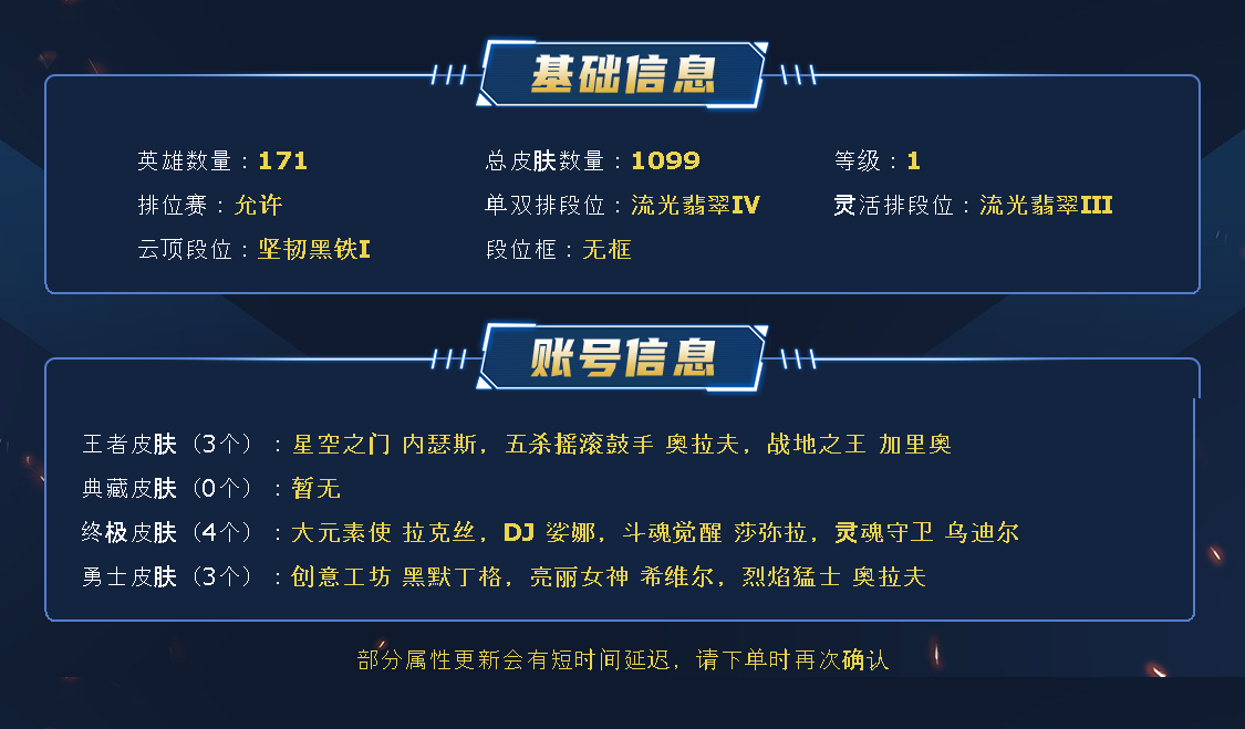 ~~喜欢记得收藏~~可排位~~1097皮全英雄~~租之前尽量查一下游戏ID,确保段位是您需要的,避免浪费您的时间~~请勿挂机逃跑故意送人头,谢谢合作,谢谢~~