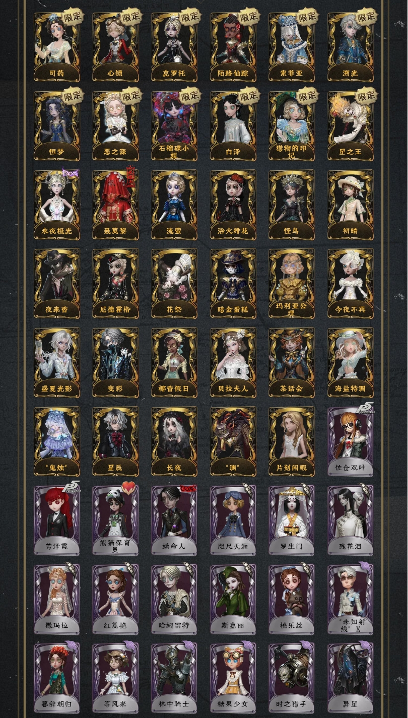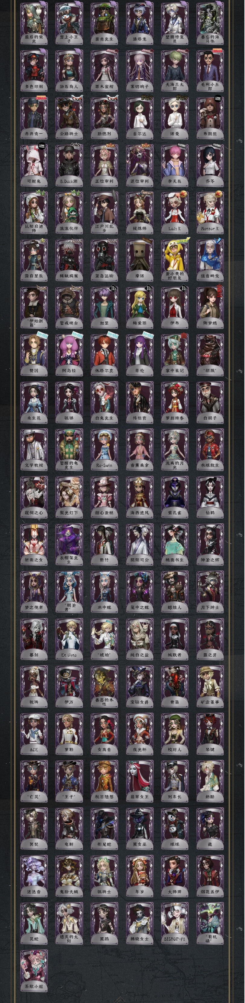 730稀世35奇珍14024稀世0奇珍6163稀世19奇珍51角色数70涂鸦499头像452头像框149等待动作143个性动作252追击音乐10归宿分22万司药心锁克罗托陌路仙踪索菲亚溯光恒梦恶之源石榴碟小姐白泽猎物的印记星之王永夜极光聂莫黎流萤浴火绯花怪鸟初晴夜来香尼德霍格花祭暗金蛋糕玛利亚公理今夜不再盛夏光影变彩椰香假日贝拉夫人茶话会海盐特调“鬼烛”星辰长夜“渊”片刻闲暇佐仓双叶芳泽霞熊猫保育员嬉命人咫尺天涯罗生门残花泪撒玛拉红菱艳哈姆雷特斯嘉丽桃乐丝“未知射线”X暮辞朝归等风来林中骑士糖果少女时之猎手异星最后的荣光雪上小王子蛋壳先生潘塔龙壁画修复员善忘的海马体多色印刷浴石商人罪木蜜柑雾切响子天海兰太郎毛利小五郎赤井秀一公路骑士助燃剂吉尔达诺曼布朗熊可妮兔B.Duck潮正位审判逆位审判李天辰乔苓认知启迪师滚滚伙伴江户川乱步提炼师Lady KMentor K源自星辰稀缺病案紧急运输摩诺蛋小黄的好朋友弦音畸变“伊始新篇”警戒哨台加里梅爱丽伊布陶梦嫣赞因阿乌拉休塔尔克菲伦掌中篆记“驯服”永生花银锑白兔先生传信官罗刹绯春白胡子文学教授警醒的龟先生Re-Swim香薰流离的月光水球救生窥伺之心聚光灯下甜心蛋糕海西遗风紫孔雀仙鹤祈雨之女衣帽架先生箭竹阴阳司公桃面书生神圣之辉梦之使者“朝圣者”冰中蝶笼中之蝶蜡烛人月下绅士暮剑En ligne“琥珀”纯白之盐缄默者噩之牙祝祷伊万善恶的本性宝钻女爵骨笛矿业董事ACE罗勒女高音夜光杯校对人琴键“亡灵”“王子”秋日随想翡翠女王列车长奶酪冥契电解衔尾蛇黑女巫球球藏迷迭香鬼天蛾银骑士年岁大师牌烟花盖伊灵蛇熄灭的太阳黑鸦拂晓女士BISHOP-f1“有机磷”茶歇小姐图鉴内容来源于游戏数据 数据更新时间:2025.10.07Scan me!x去「大神」搜索“第五人格个人图鉴”生成你的专属图鉴