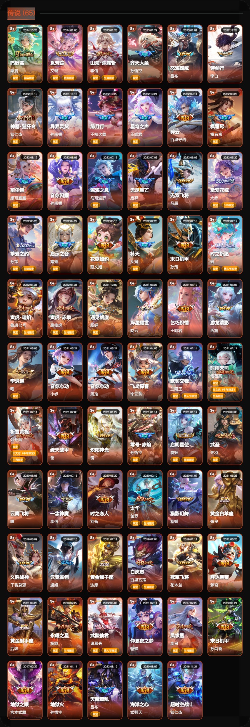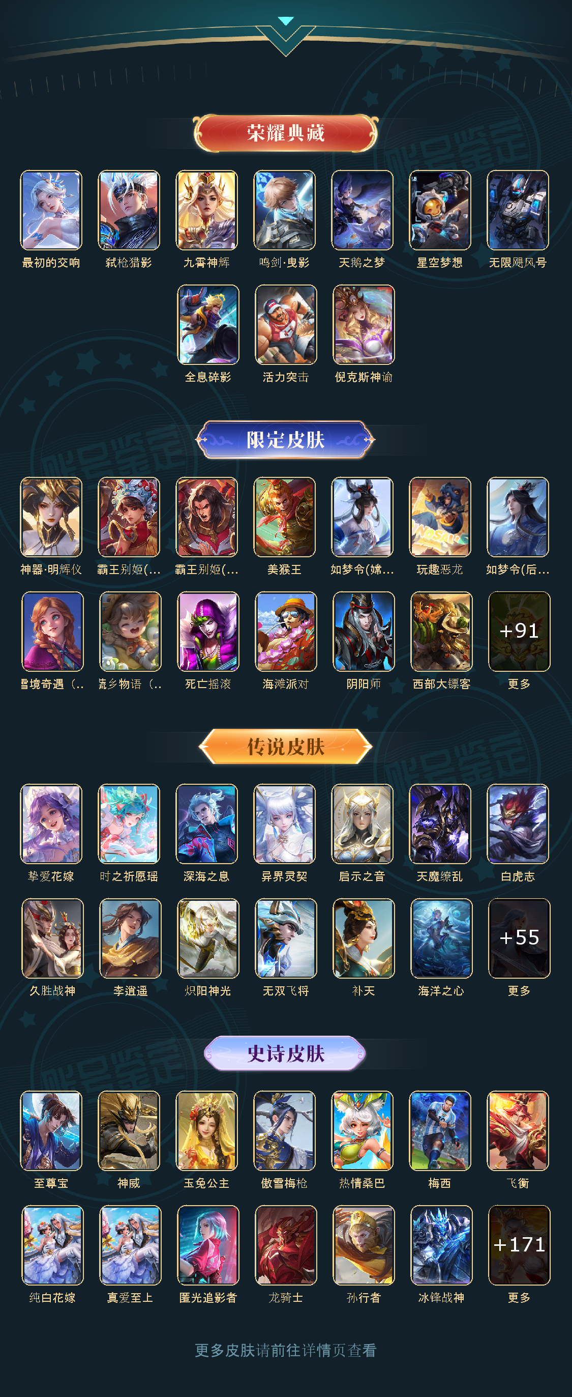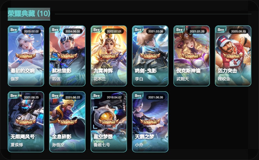 贵族等级V10,段位至尊星耀,英雄数量127,典藏皮肤数10,皮肤数量570,纯白花嫁/天魔缭乱/至尊宝/真爱至上/热情桑巴/梅西/白虎志/久胜战神/飞衡/匿光追影者/神器·明辉仪/鸣剑·曳影/无双飞将/时之祈愿瑶/挚爱花嫁/李逍遥/深海之息/最初的交响/玉兔公主/补天/弑枪猎影/异界灵契/神威/炽阳神光/启示之音/九霄神辉/傲雪梅枪/纯白花嫁/天魔缭乱/至尊宝/真爱至上/热情桑巴/梅西/白虎志/久胜战神/飞衡/匿光追影者/神器·明辉仪/鸣剑·曳影/无双飞将/时之祈愿瑶/挚爱花嫁/李逍遥/深海之息/最初的交响/玉兔公主/补天/弑枪猎影/异界灵契/神威/炽阳神光/启示之音/九霄神辉/傲雪梅枪