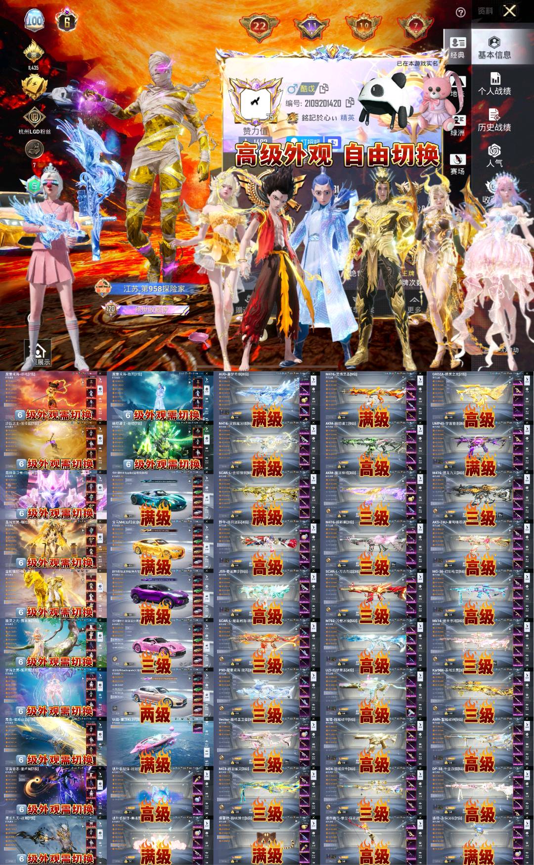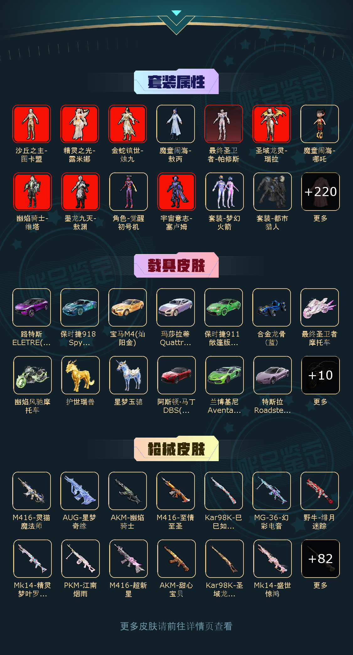 222粉,24载具,796套装,22王牌印记,绝世王牌23星历史最高段,505442热力值 平底锅-仲夏莫吉托/平底锅-林间仙鹿/撬棍-永恒法杖/镰刀-幽影之判/AKM-盖世英雄/M416-灵猫魔法师/AKM-甜心宝贝/SCAR-L-梦幻火箭/SCAR-L-童趣迷兔/AUG-星梦奇缘/M416-风花雪月/AUG-星之彼岸/M762-激战未来/GROZA-香水柠檬/AKM-幽焰骑士/M416-心之恋语/SCAR-L-纯梦嫁纱/GROZA-超新星/M416-五爪金龙/AKM-魔法神域/M16A4-垂柳戏鸭/AKM-炫紫旋律/GROZA-精灵之光/M416-墨龙九天/GROZA-焦糖拿铁/M762-冷魅冰骑/AKM-百合蜜语/M416-至情至圣/SCAR-L-金蛇镇世/AUG-妙趣可丽/M762-甜蜜誓约/M416-超新星/SCAR-L-万古烈焰/蜜獾-辉耀战甲/AKM-梦之光华/SCAR-L-魔童闹海 哪吒/SPAS-12-音爆索尼克/S12K-海渊国主/M417-第五大道/Mk14-盛世惊鸿/SKS-诡面斩/Mk14-精灵梦叶罗丽/Mk14-闲梦青缨/Mini14-荧光虫舞/VSS-烈焰拳霸/DP-28-暗夜鎏金/DP-28-扶摇飞仙/M249-彩虹甜喵/MG3-辉羽雀灵/PKM-天星战神/DP-28-圣堂之誓/MG3-洛神天依/M249-古战神甲/MG-36-幻彩电音/PKM-江南烟雨/M249-绒雪飘舞/DP-28-千金淑猫/DP-28-豹影疾电/UZI-绮梦青鸾/汤姆逊-怪笑疯兔/Vector-红伞翩翩/P90-甜蜜草莓/野牛-绯月迷踪/UMP45-宇宙意志/汤姆逊-荒漠赏金/AKS-74U-信仰神谕/AKS-74U-星穹咏叹调/Vector-环太平洋/Vector-最终圣卫者/UMP45-恐龙拽拽/P90-沙丘之主/UMP45-玉魂晶魄/P90-魔童闹海 敖丙/JS9-奇迹舞步/破片手榴弹-瓶中星球/爆炸猎弓-雪梅暗香/破片手榴弹-美味星星糖/破片手榴弹-秋玉花灯/爆炸猎弓-拳皇·狂花道/烟雾弹-猫咪绅士/破片手榴弹-粉粉猫爪/Kar98K-伏魔团/Kar98K-圣域龙灵/AWM-焰龙焚天/AMR-鸢尾晶梦/Kar98K-巳巳如意/AWM-橘柚倾心/M24-镜域双华/AMR-炫光之旅/M24-暗星紫秘/Kar98K-未来歌姬/AMR-智耀战神/M200-梦海之灵/M24-星之信仰/M24-莲影清波/特斯拉Roadster(沁心粉)/阿斯顿·马丁DBS(红)/宝马M4(灿阳金)/玛莎拉蒂Quattroporte(幻星粉)/保时捷911 敞篷版(小暴龙)/路特斯ELETRE(电光紫)/保时捷Taycan 旅行版(冰莓粉)/鬼马风驰/快艇-塞莎KL27(霓虹粉)/合金龙骨(蓝)/糖心拉力赛车(波动紫)/保时捷918 Spyder(玺耀绿)/兰博基尼Aventador(翡翠绿)/仰望U9(赤霞丹朱)/冰绡玉鳞/护世瑞兽/星梦玉骢/关羽赤兔马/赵云玉狮子马/照夜玉狮子/疾风龙骑/辉羽雀灵自行车/最终圣卫者摩托车/幽焰风驰摩托车/踏焰逐风摩托车/