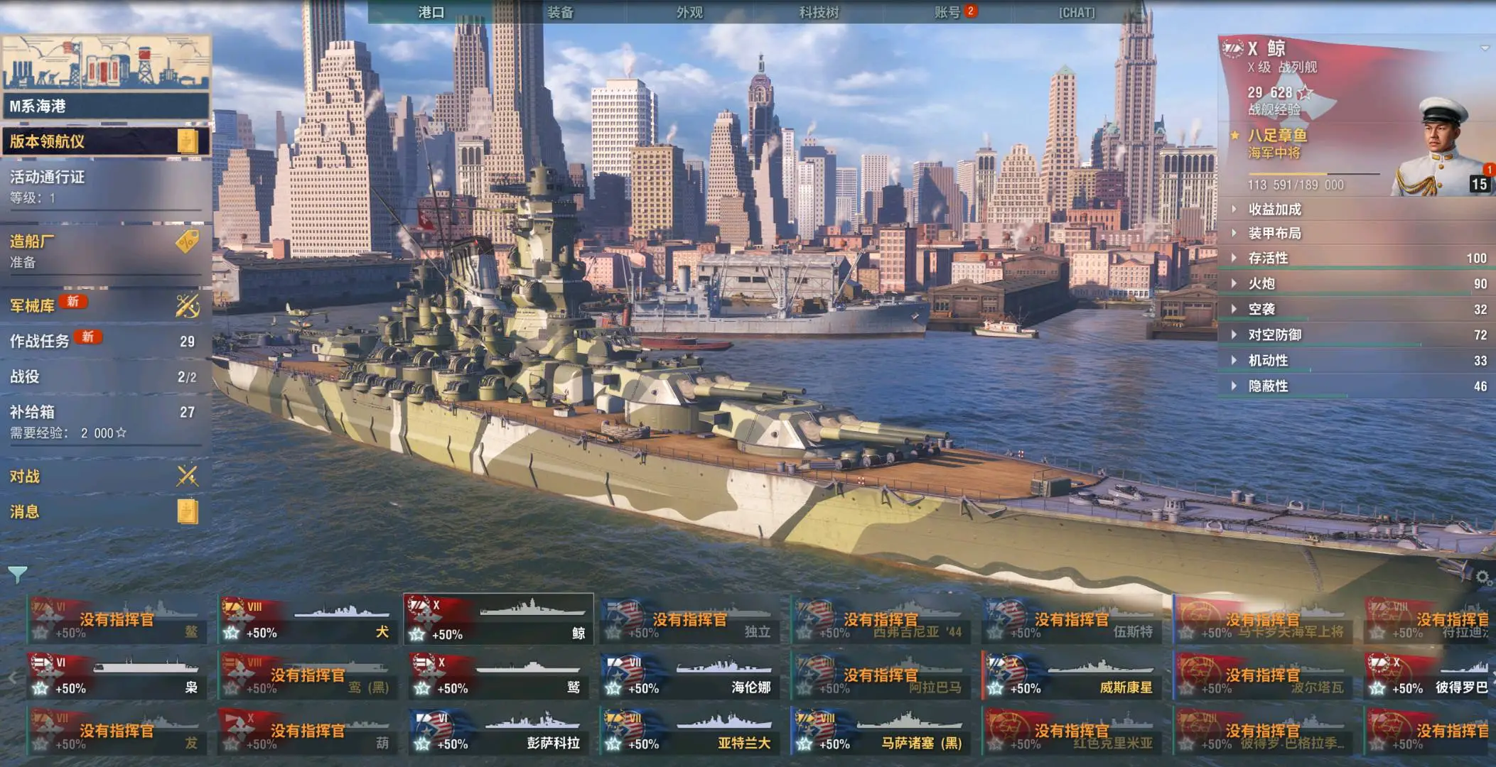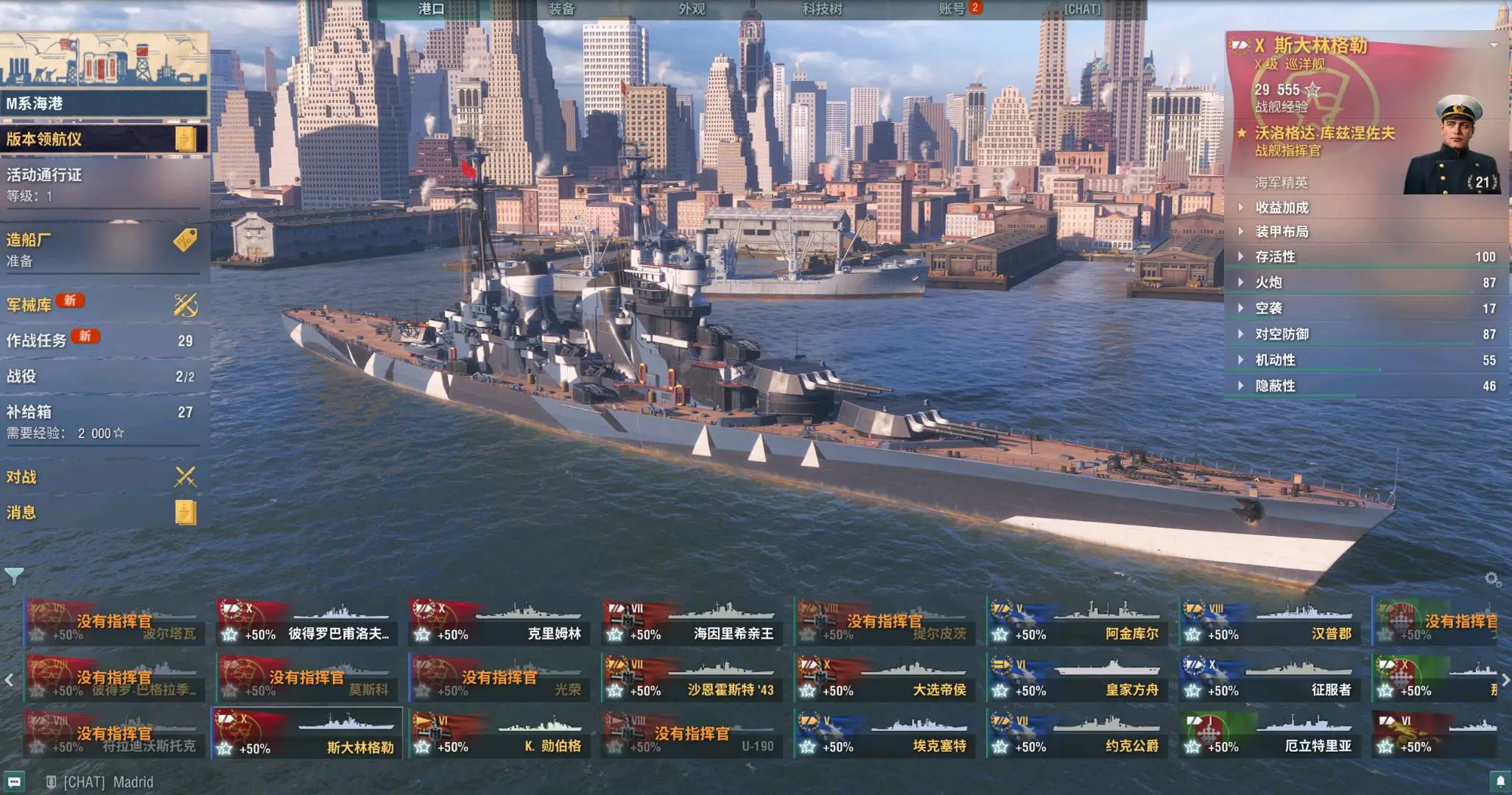 港口有:十级金币特种船:信浓、那不勒斯、大选帝侯(吕帅)、莫斯科、斯大林格勒(库帅)、威斯康星、光荣