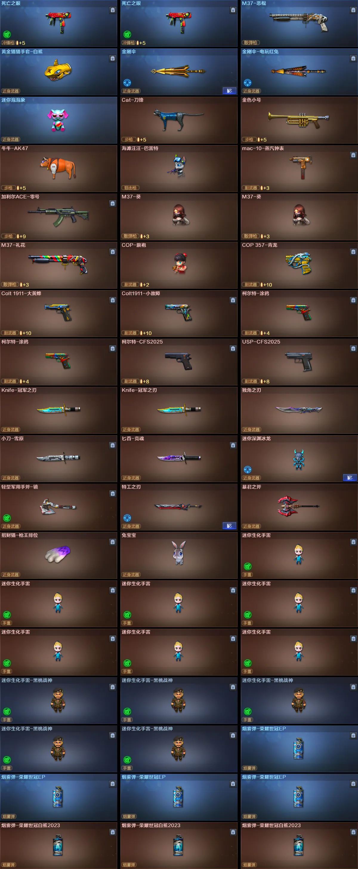 【其他亮点】:斯泰尔-蝴蝶/炼狱-迷你小钢/炼狱-枪娘掣电/Knife-冠军之刃(2)/M4A1-小神龙/白虎-迷你小艾/王者M200-无畏金戈/柯尔特-赛博朋克(3)/毒蜂/异变清道夫/迷你律动酷熊/Scar Light-马枪/黄金猫猫手套-白鲨/金刚伞-电玩红兔/迷你泡泡象/兔宝宝/烟雾弹-荣耀世冠白鲨2023(3)/哔哩哔哩名片/超核名片