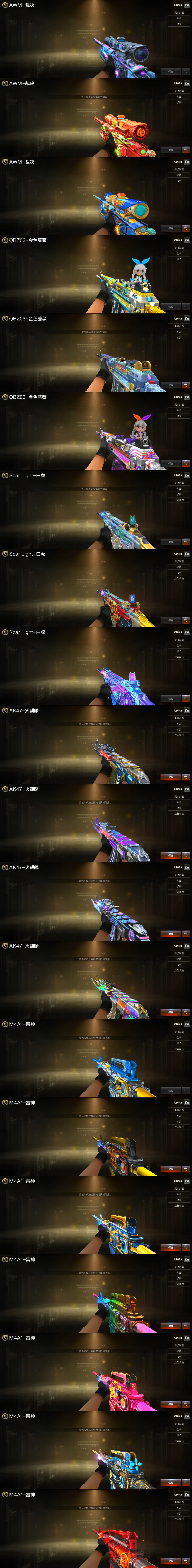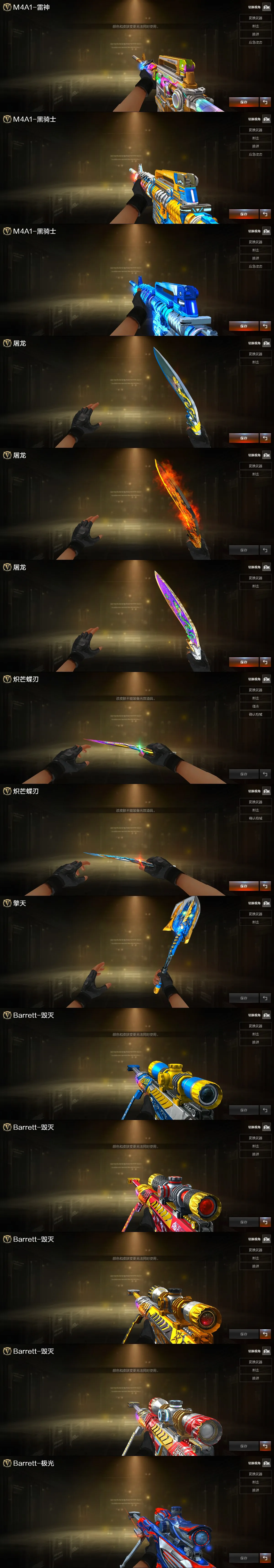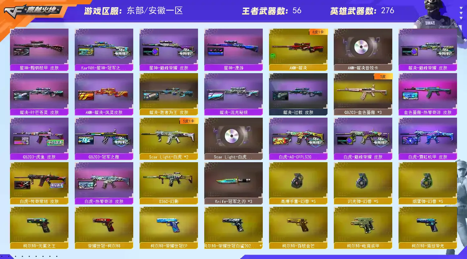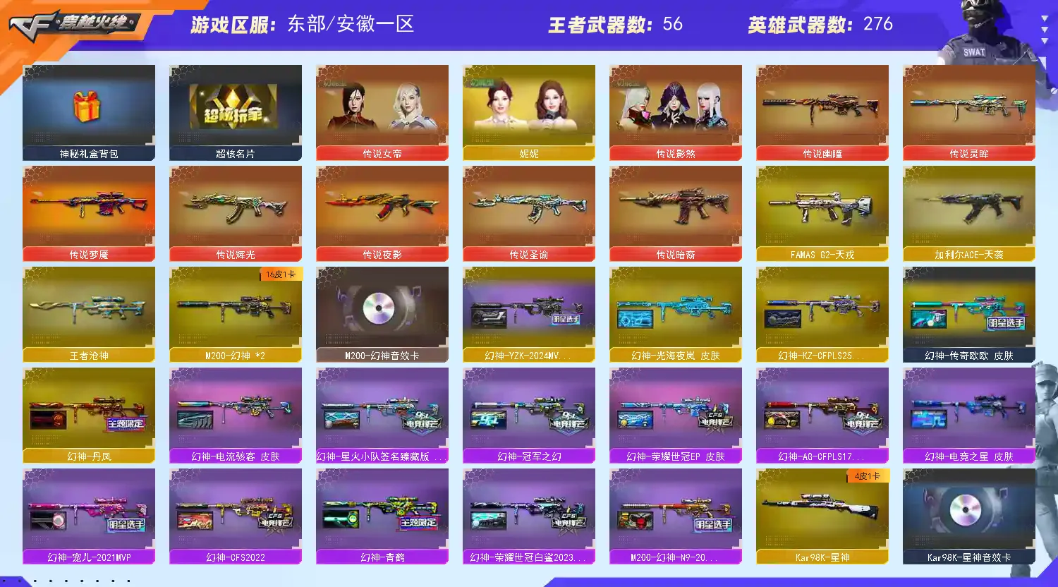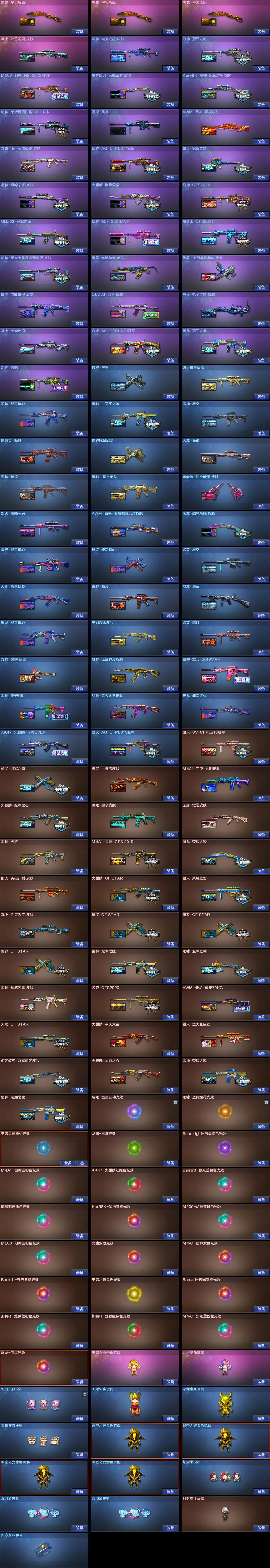 【稀有武器】:传说暗裔/传说辉光/传说夜影/传说梦魇/传说灵眸/传说幽瞳/M200-幻神(2)/Kar98K-星神/VSK-94-金蚀/G36C-幻影/ScarLight-白虎(2)/HK417-朱雀/QBZ03-天罚/M4A1-夜魔/M4A1-幻灵/M4A1-雷霆/AK47-雷暴/M4A1-堕天神/雷霆之契/USP-雷暴/COP-堕天神(4)/破空枪刃-夜魔(3)/柯尔特-电竞装甲/COP357-幻灵/柯尔特-竞技荣光/天神-动感闪耀/柯尔特-荣耀世冠白鲨2023(2)/修罗-古蛇迷踪/破空枪刃/沙鹰-幻兽(5)/荣耀世冠-柯尔特/COP357-雷霆王者-觉醒版/柯尔特-冠军之特/金色蔷薇-古蛇迷踪/QBZ03-金色蔷薇(3)/QBZ95-幻兽/AK47-火麒麟(6)/M4A1-黑龙(2)/M4A1-雷神(7)/M4A1-黑骑士(7)/AK47-无影(3)/AK47-黑武士(2)/荣耀世冠-雷神/白虎-电玩蓝兔/Barrett-毁灭(6)/Barrett-极光(7)/AWM-裁决/Barrett-电竞装甲/M200-竞技荣光/RPK-盘龙(12)/加特林-炼狱(4)/悦蓝-惊涛骇浪-觉醒版/汤姆逊-烈龙(8)/AA-12-雷霆/炽芒蝶刃/斩神刀-雷暴/麒麟刺-堕天神/龙啸-堕天神/马来剑-夜魔/尼泊尔-电竞装甲/幻灵之锋/擎天-竞技荣光/唐刀-神工天巧/女皇利刃-幻兽