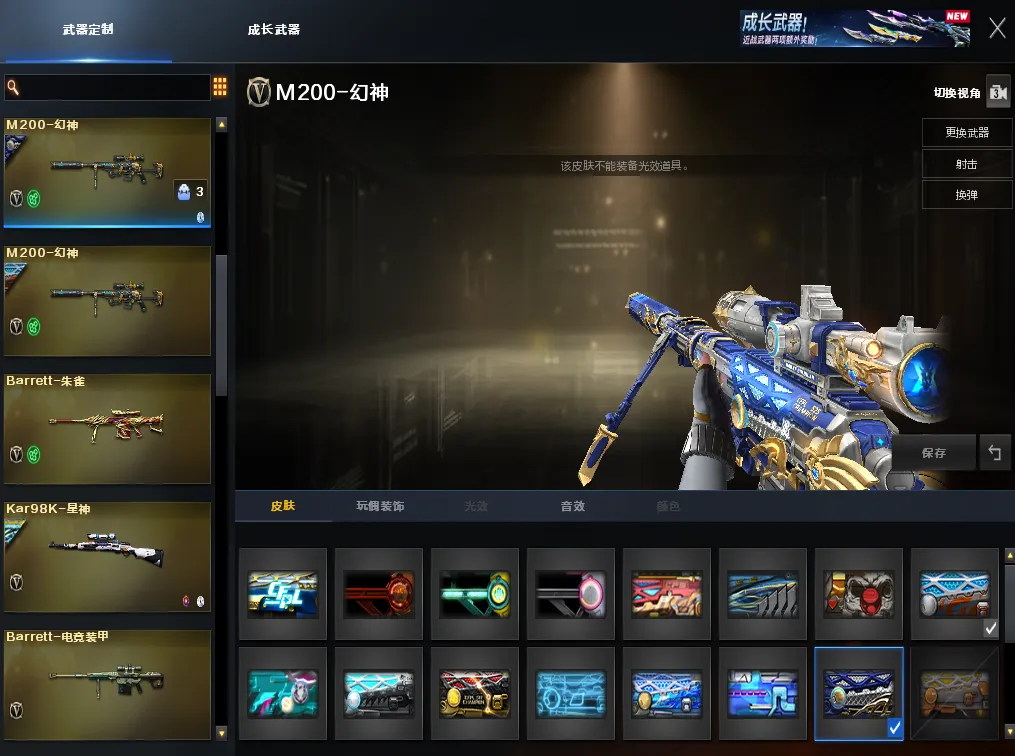 【热门音效卡】:M200-幻神音效卡/Kar98K-星神音效卡/AWM-裁决音效卡/Scar Light-白虎音效卡/Barrett-毁灭音效卡/M4A1-黑骑士音效卡