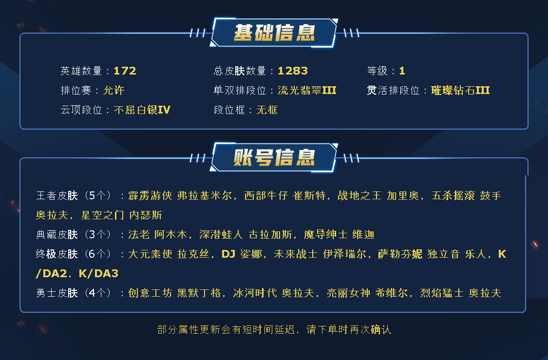 ~~喜欢记得收藏~~可排位~~1255皮全英雄~~租之前尽量查一下游戏ID,确保段位是您需要的,避免浪费您的时间~~请勿挂机逃跑故意送人头,谢谢合作,谢谢~~