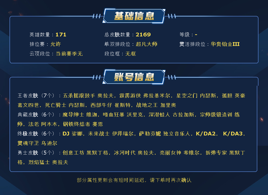 2168皮肤|满英雄|可排位|终极6|神话79|限定224|传说98|史诗215|