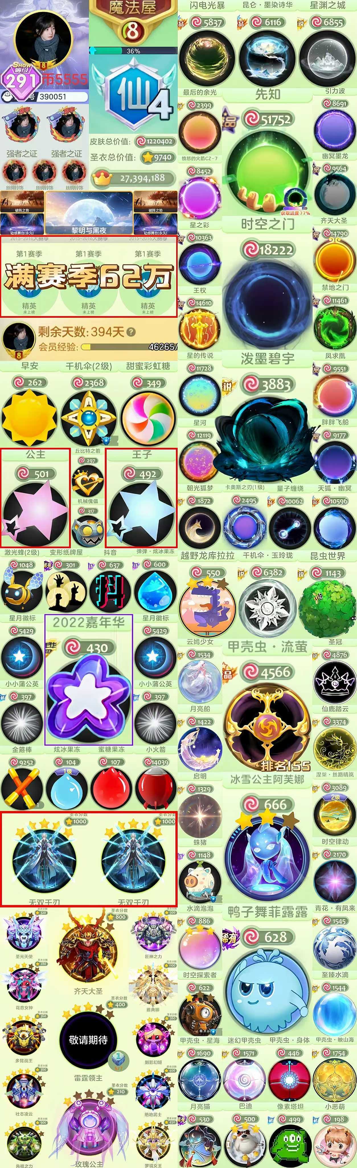 【全平台】 顶配满赛季♥十字架漩涡黑甲♥二级阿芙娜时空之门♥王子公主嘉年华袍子♥满级无双千刃7个甲壳虫年卡