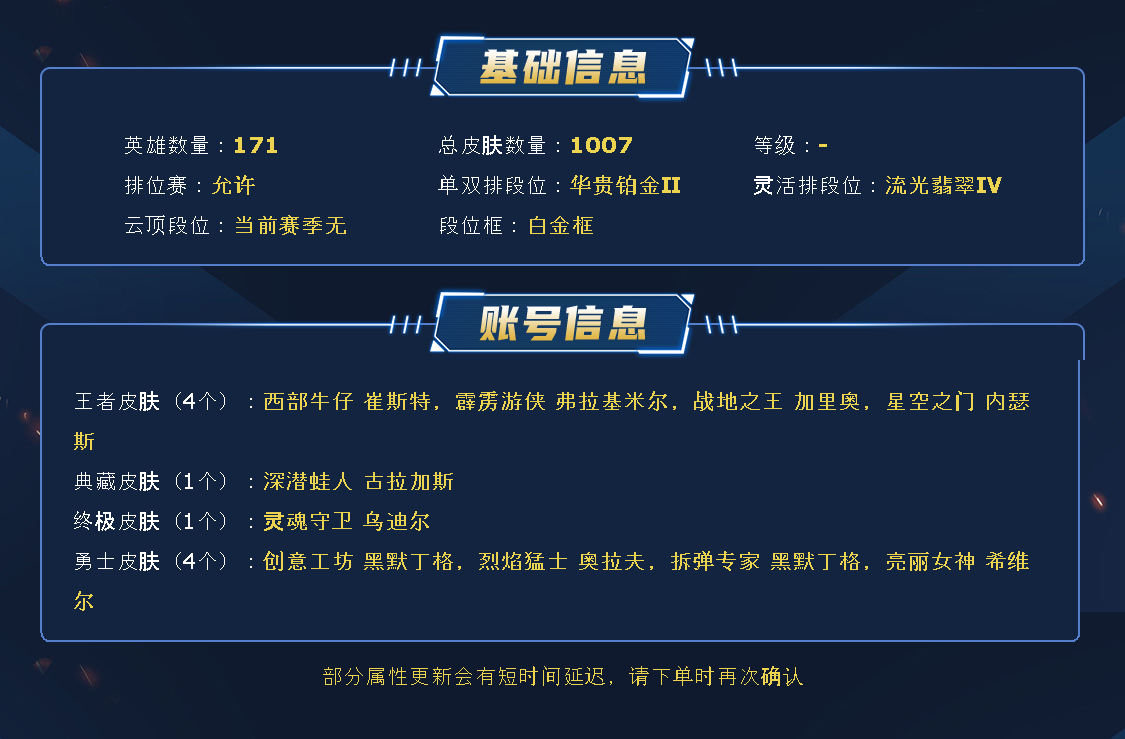 全英雄|1000皮|26神话|32臻彩|可打排位|限定94|传说76|签名Uzi卡莎VN皮肤|