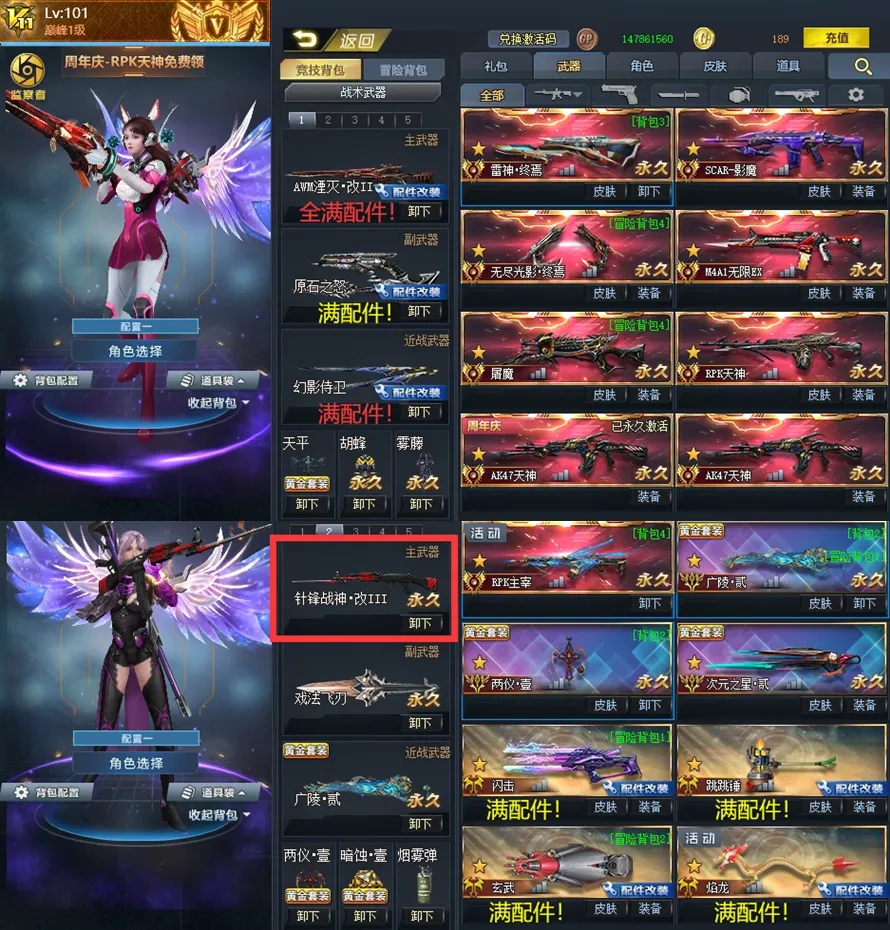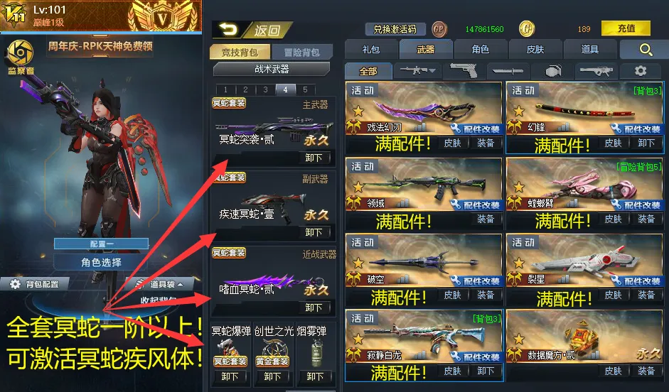 v11全满配件AWM湮灭!针锋战神•改叁!满幻影侍卫!冥蛇疾风体!广陵贰!无限ex!血魔!满螳螂臂!