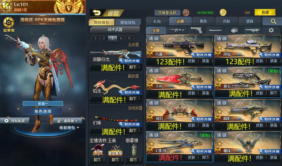 满配件武器:闪击!跳跳锤!玄武!焰龙!123风暴!123降临!不朽!原石之怒!翎羽!瞬影!幻影侍卫!藏锋!戏法幻刃!幻锋!领域!螳螂臂!破空!白龙!裂星!戏法飞刃!AWM湮灭!