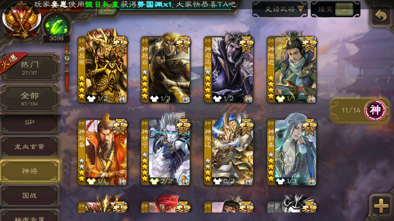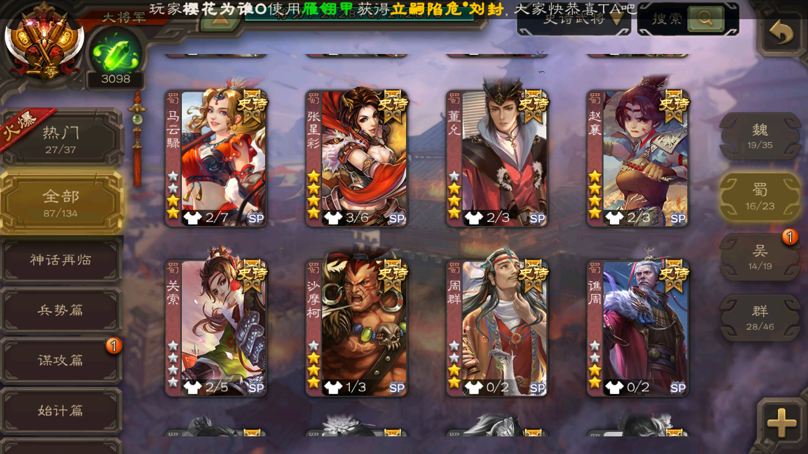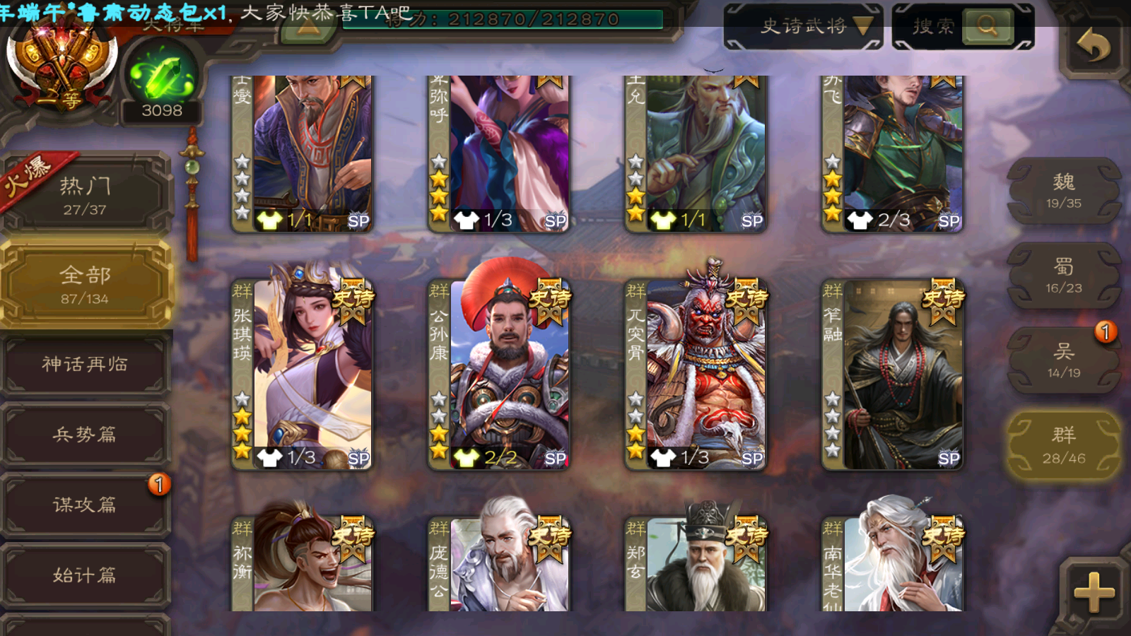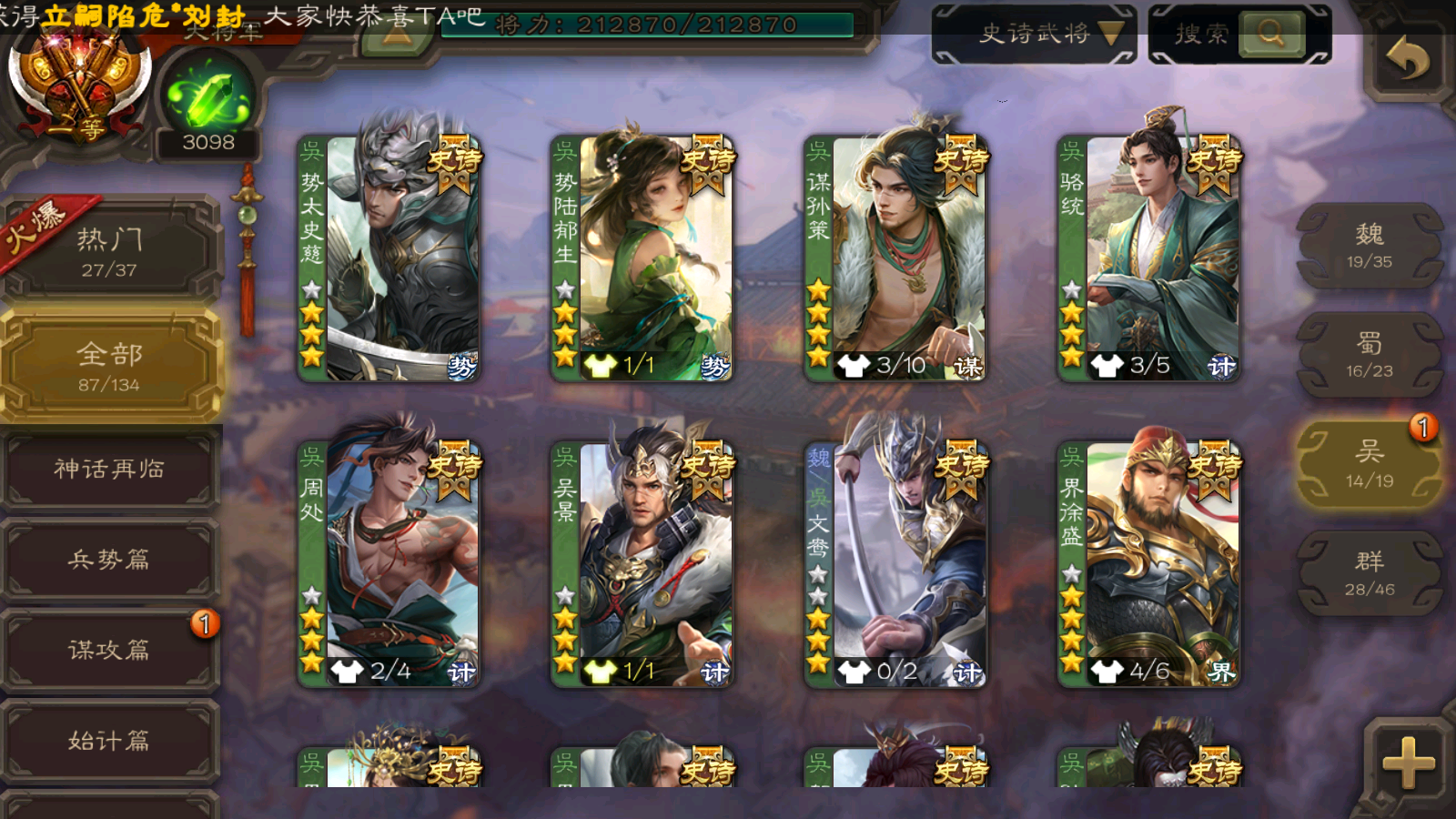 【全平台】 【锦鲤有卡】三卡一等87史诗势魏延笮融势太史慈势陆郁生友诸葛清河公主文鸯谋诸葛神甘神郭嘉
